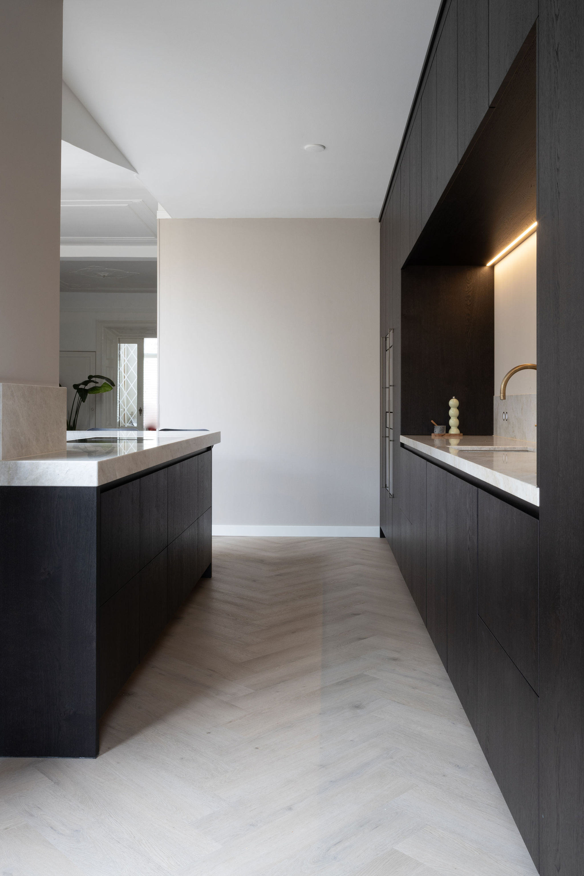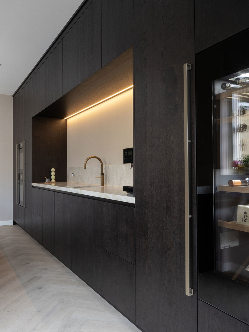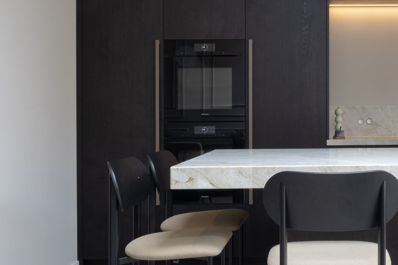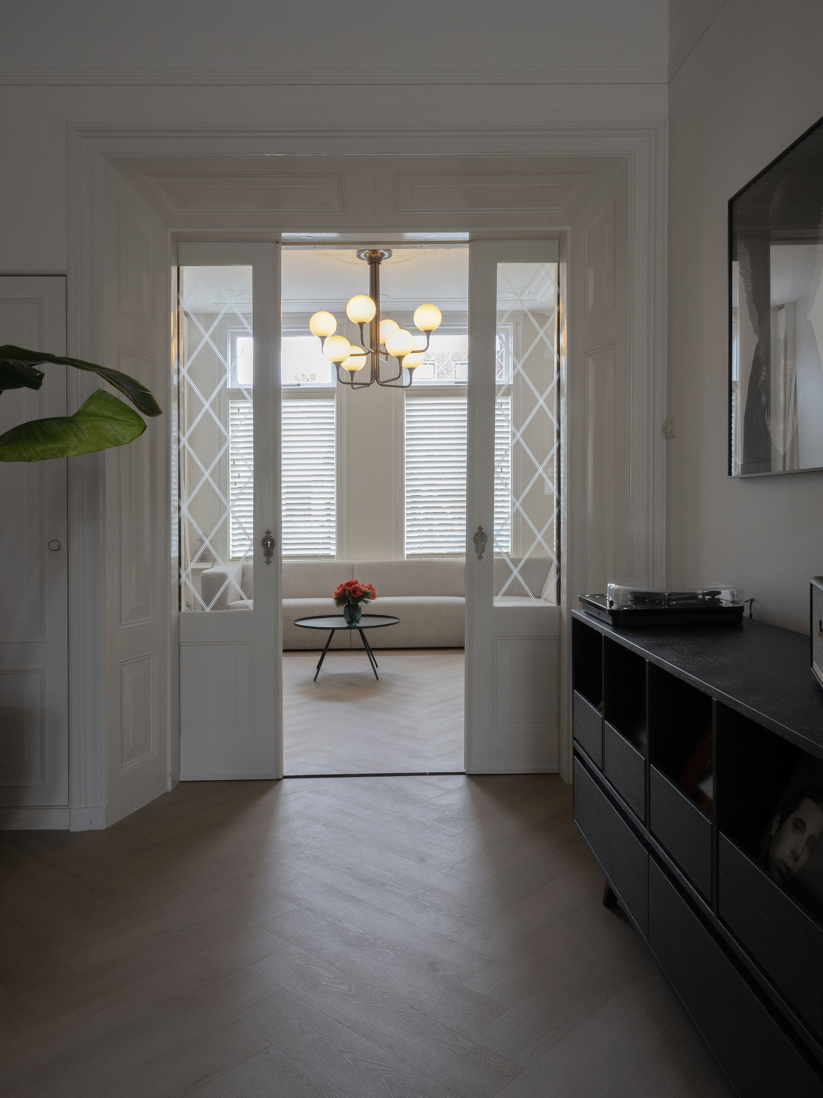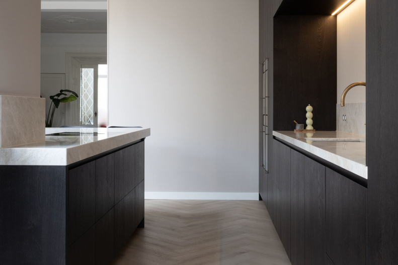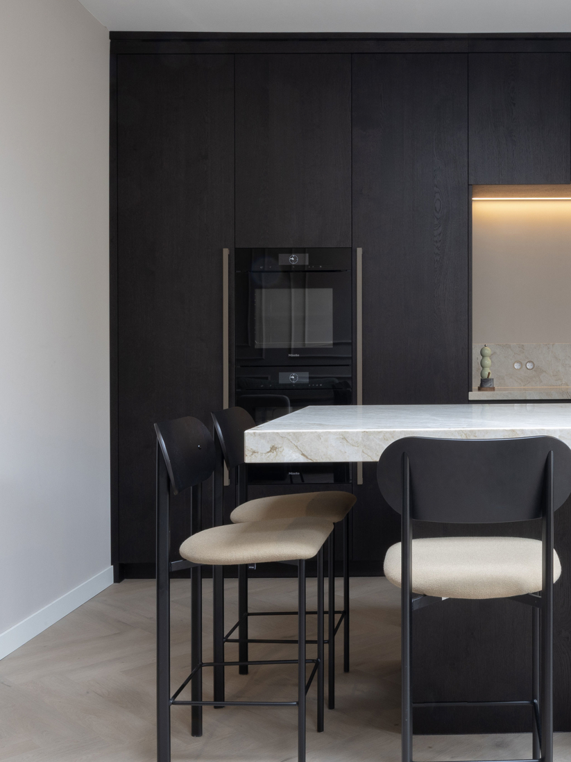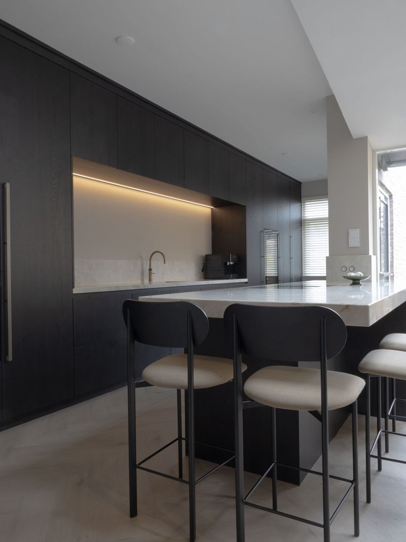 In dit charmante grachtenpand in het centrum van Maassluis hebben we de authentieke jaren 30 sfeer gekoesterd en verfijnd. Bestaande details zijn behouden en versterkt met op maat gemaakte sierlijsten die de wanden extra karakter geven. De moderne, strakke keuken vormt een krachtig contrast, uitgevoerd in Old black eiken fineer met een Taj Mahal kwartsiet natuurstenen blad dat naadloos doorloopt in de spatrand. Subtiele details zoals maatwerk grepen, perfect uitgelijnde Miele apparatuur en Rond stopcontacten zorgen voor rust en eenheid. Het geheel wordt compleet gemaakt door een modern retro meubel voor de platenspeler en de elegante Masiero lamp die prachtig samensmelt met het rijk gedetailleerde plafond.