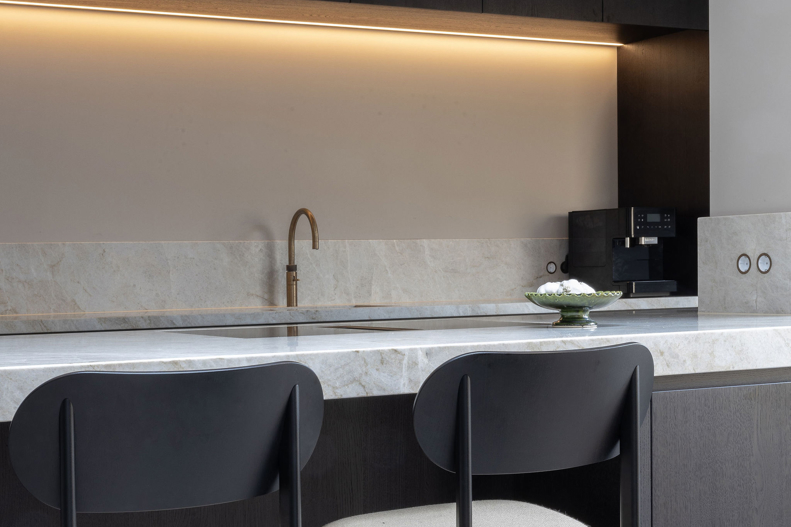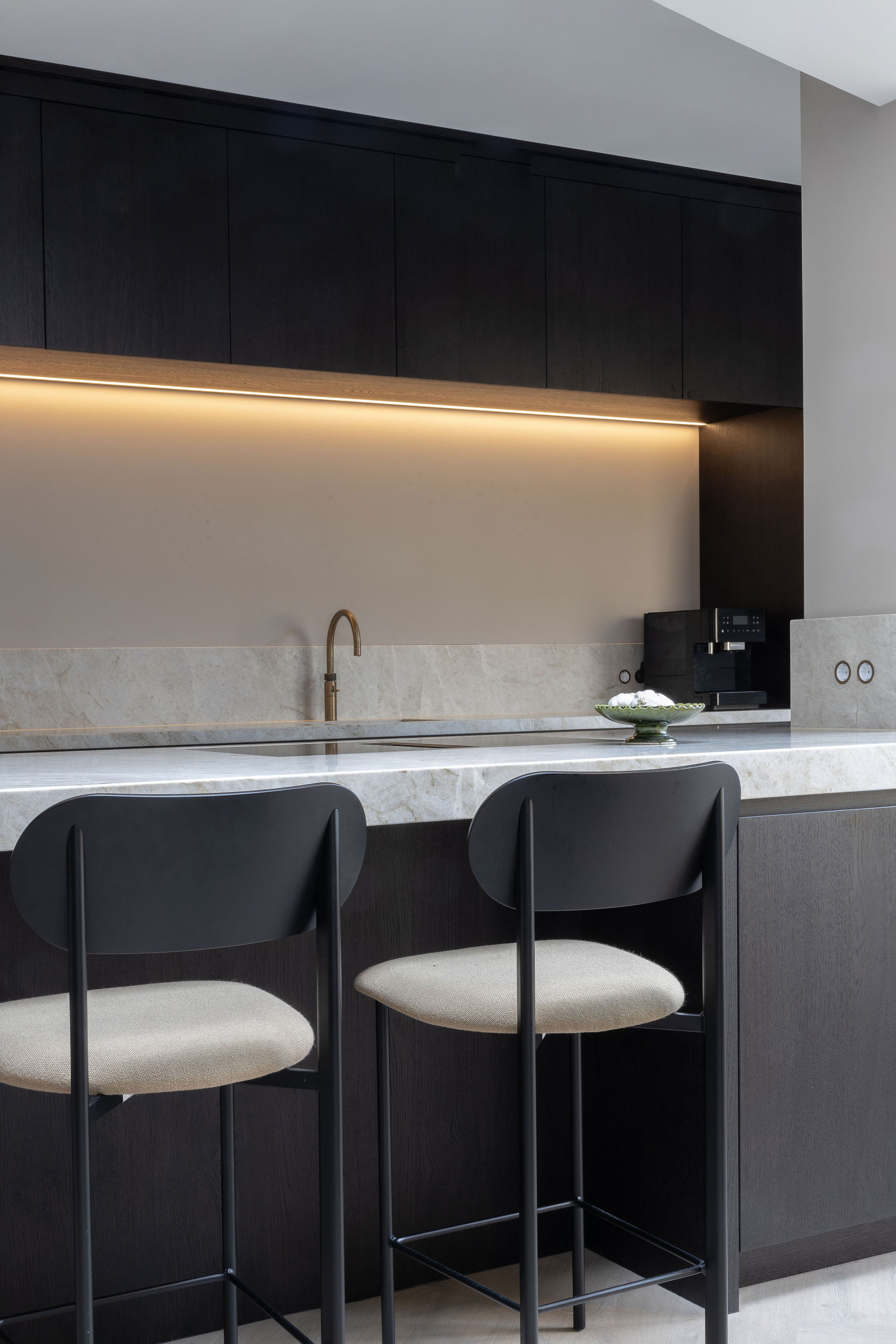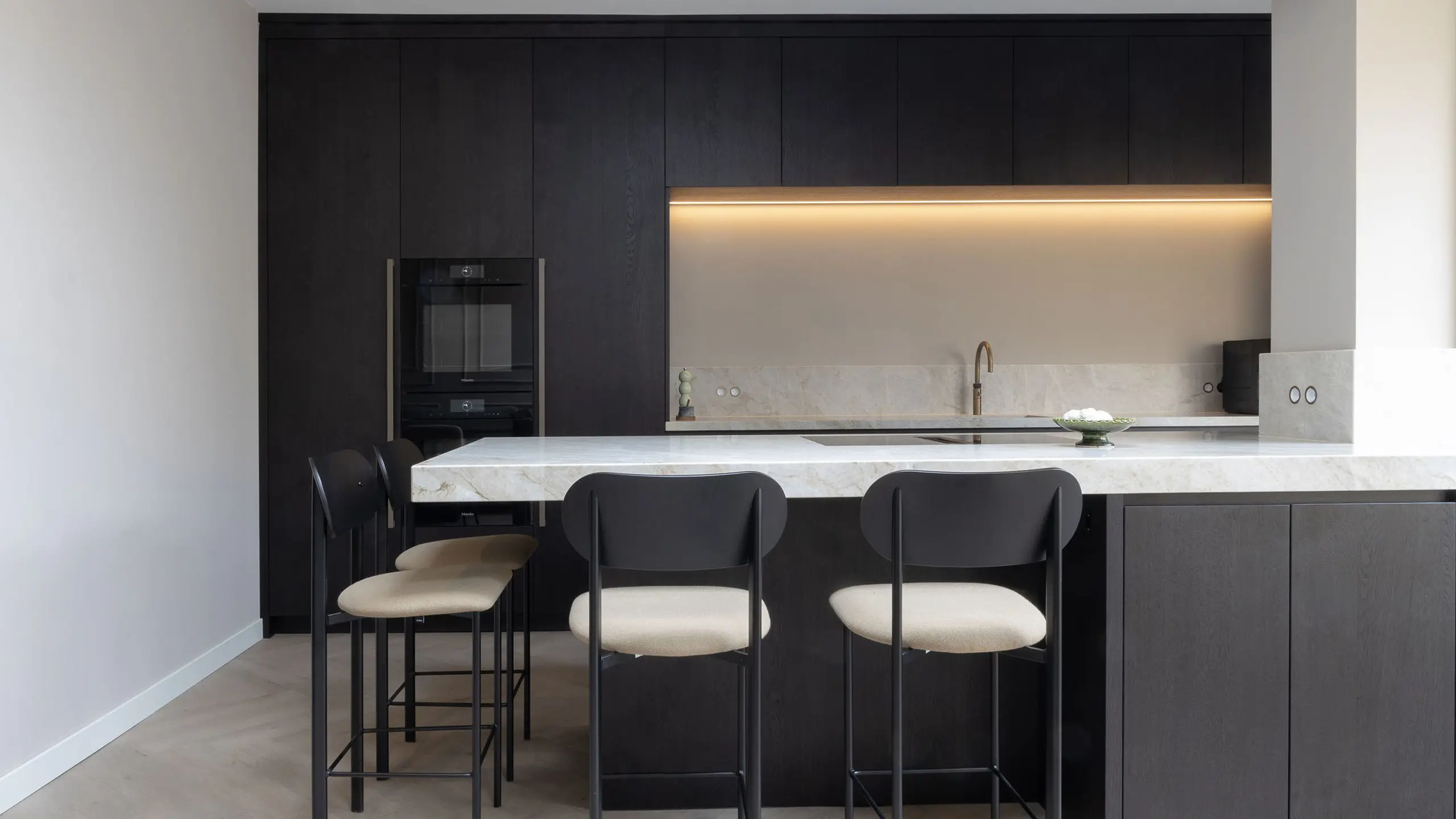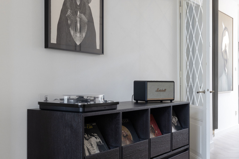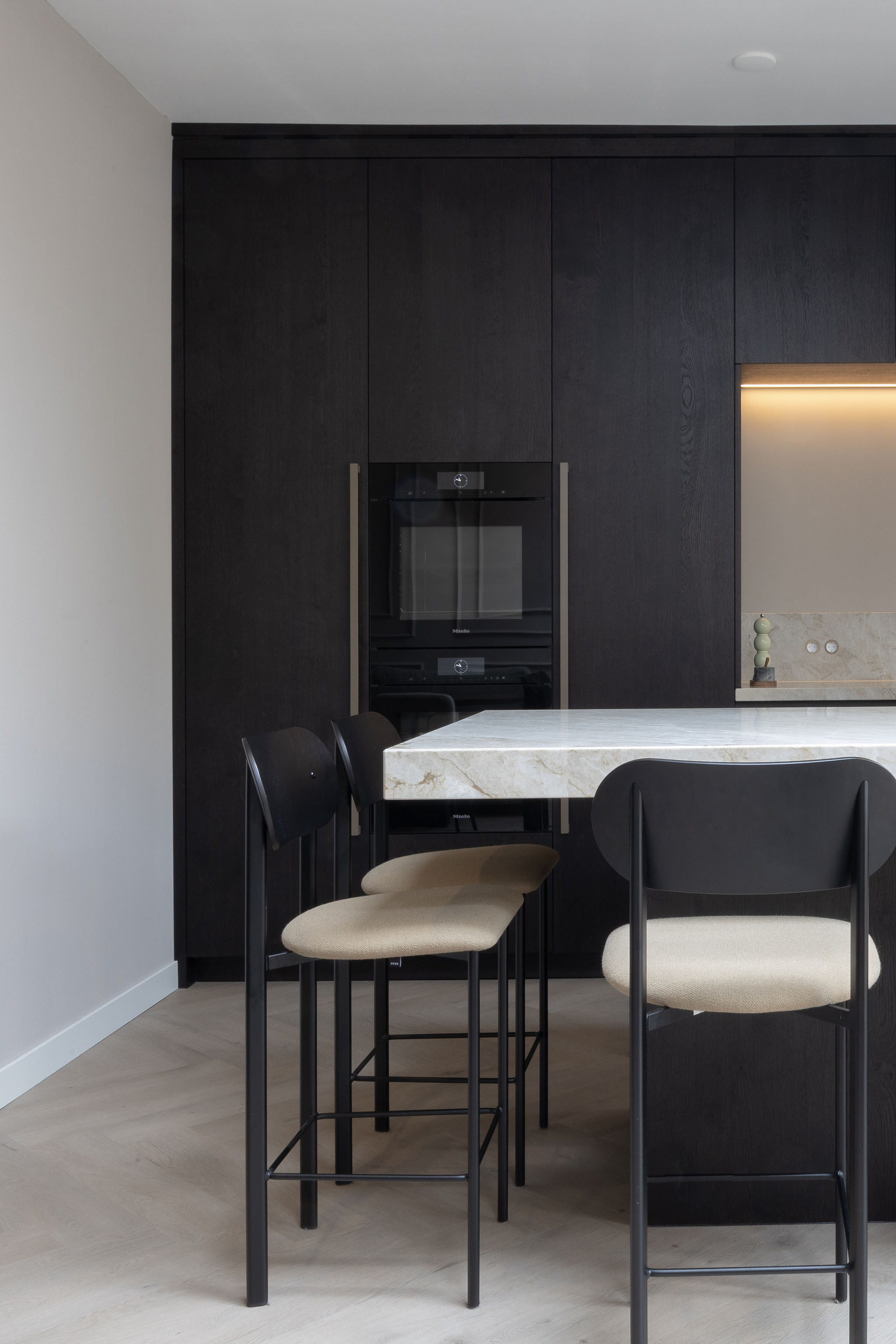 In dit charmante grachtenpand in het centrum van Maassluis hebben we de authentieke jaren 30 sfeer gekoesterd en verfijnd. Bestaande details zijn behouden en versterkt met op maat gemaakte sierlijsten die de wanden extra karakter geven. De moderne, strakke keuken vormt een krachtig contrast, uitgevoerd in Old black eiken fineer met een Taj Mahal kwartsiet natuurstenen blad dat naadloos doorloopt in de spatrand. Subtiele details zoals maatwerk grepen, perfect uitgelijnde Miele apparatuur en Rond stopcontacten zorgen voor rust en eenheid. Het geheel wordt compleet gemaakt door een modern retro meubel voor de platenspeler en de elegante Masiero lamp die prachtig samensmelt met het rijk gedetailleerde plafond.