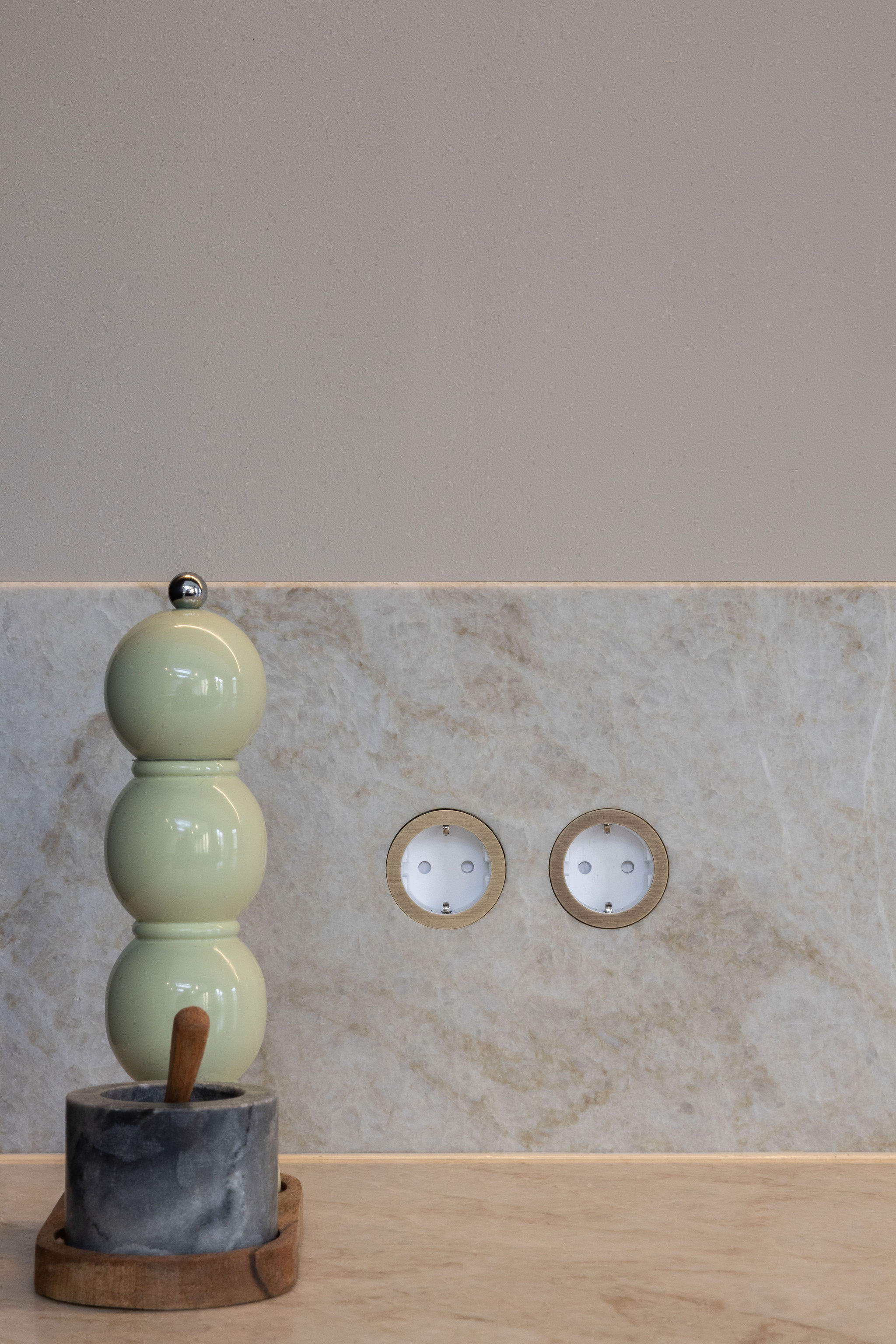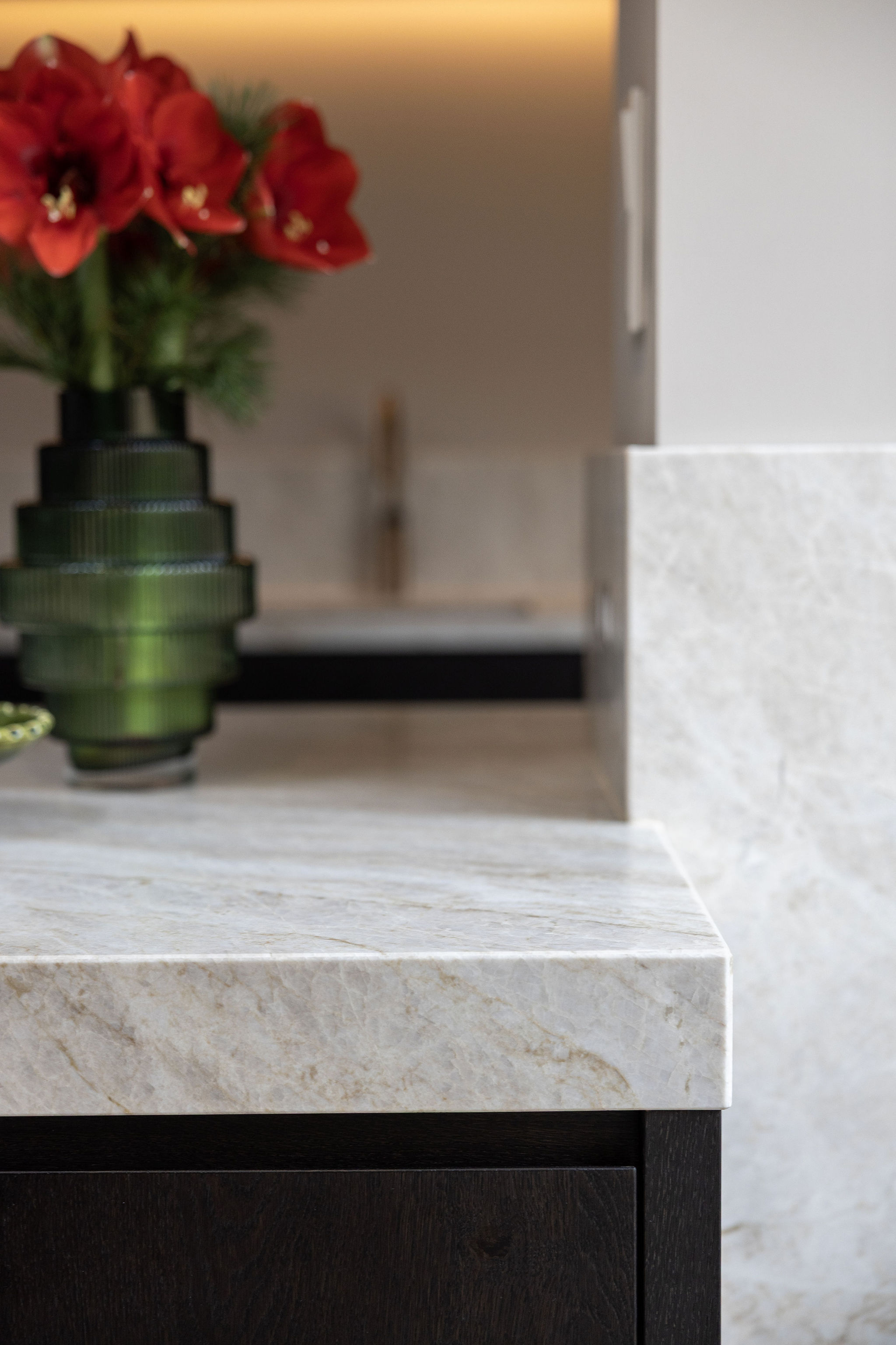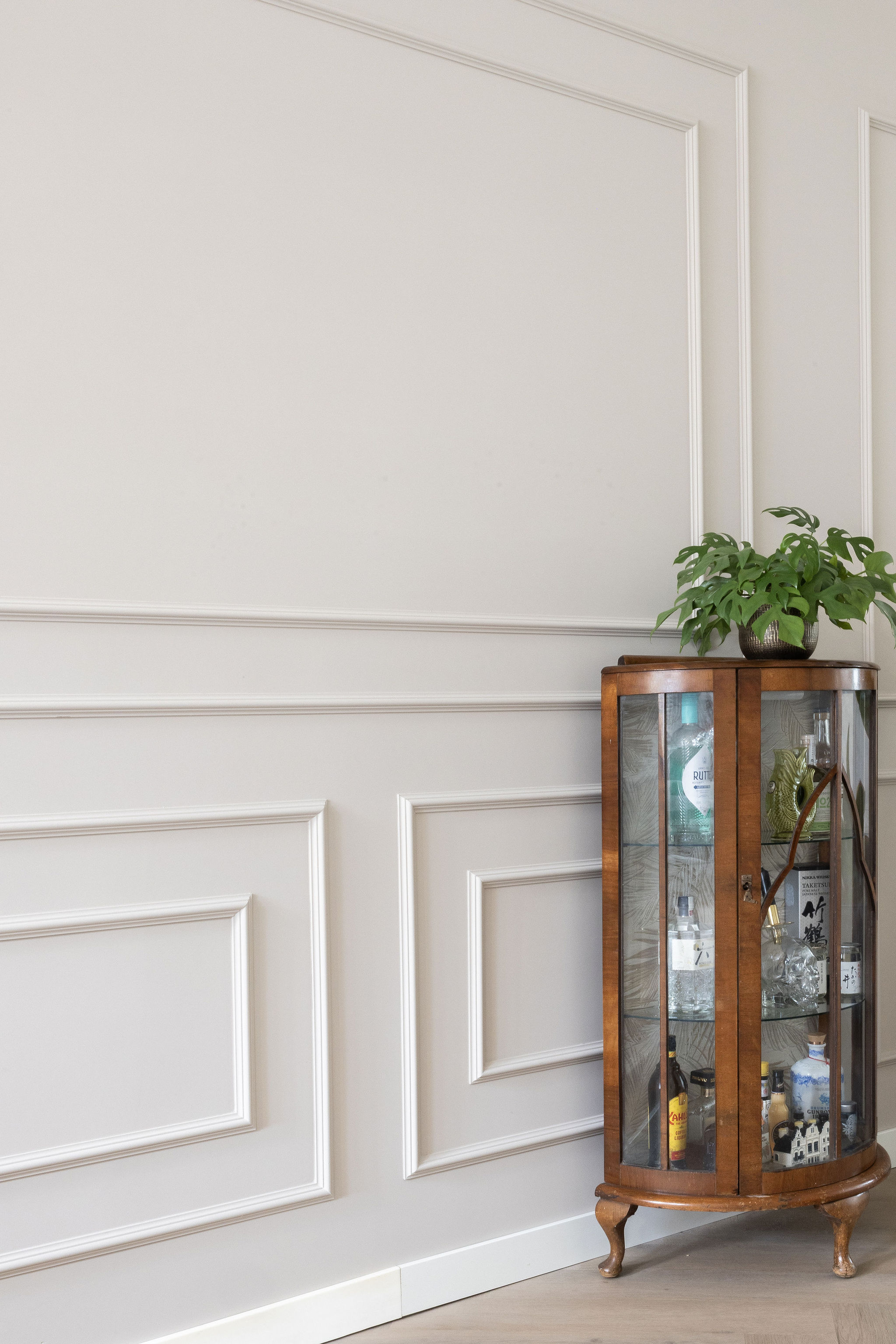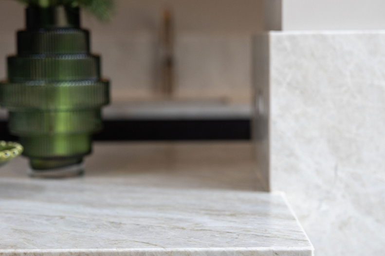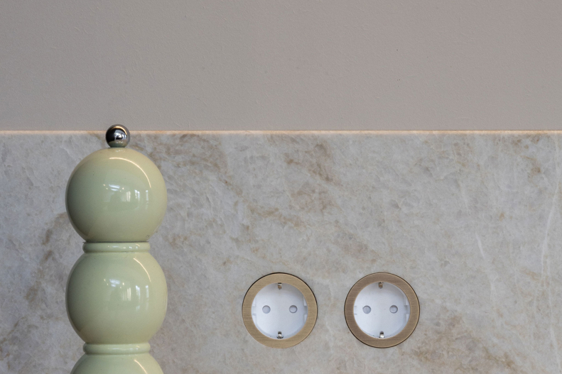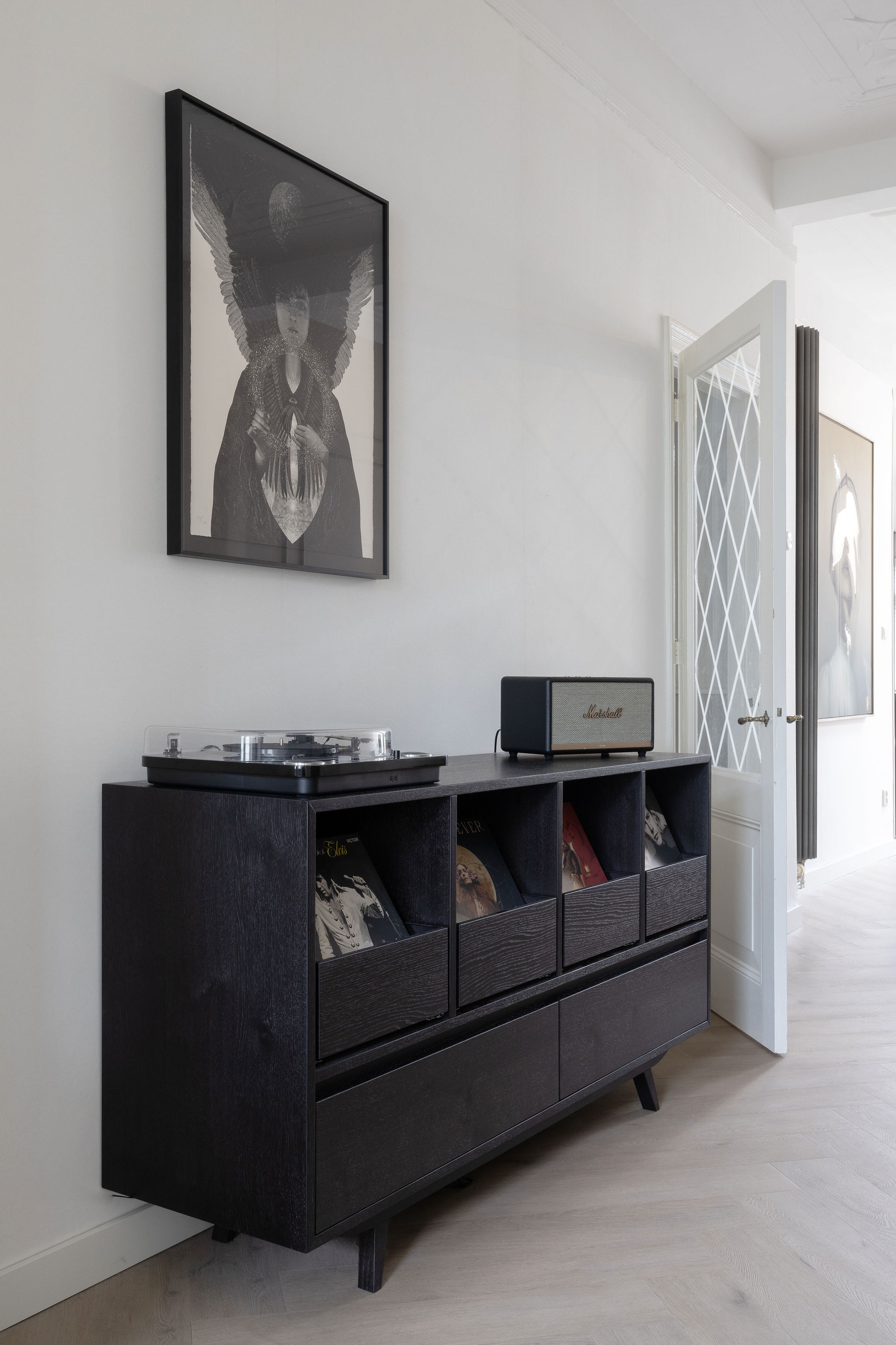 In dit charmante grachtenpand in het centrum van Maassluis hebben we de authentieke jaren 30 sfeer gekoesterd en verfijnd. Bestaande details zijn behouden en versterkt met op maat gemaakte sierlijsten die de wanden extra karakter geven. De moderne, strakke keuken vormt een krachtig contrast, uitgevoerd in Old black eiken fineer met een Taj Mahal kwartsiet natuurstenen blad dat naadloos doorloopt in de spatrand. Subtiele details zoals maatwerk grepen, perfect uitgelijnde Miele apparatuur en Rond stopcontacten zorgen voor rust en eenheid. Het geheel wordt compleet gemaakt door een modern retro meubel voor de platenspeler en de elegante Masiero lamp die prachtig samensmelt met het rijk gedetailleerde plafond.