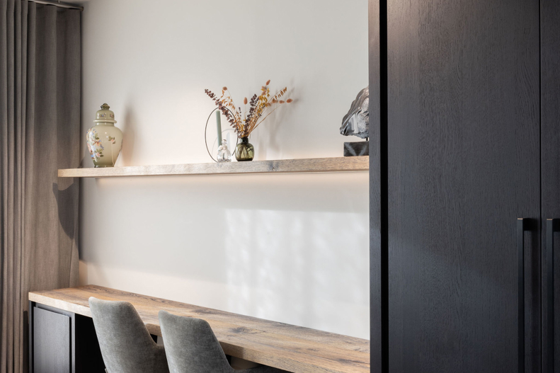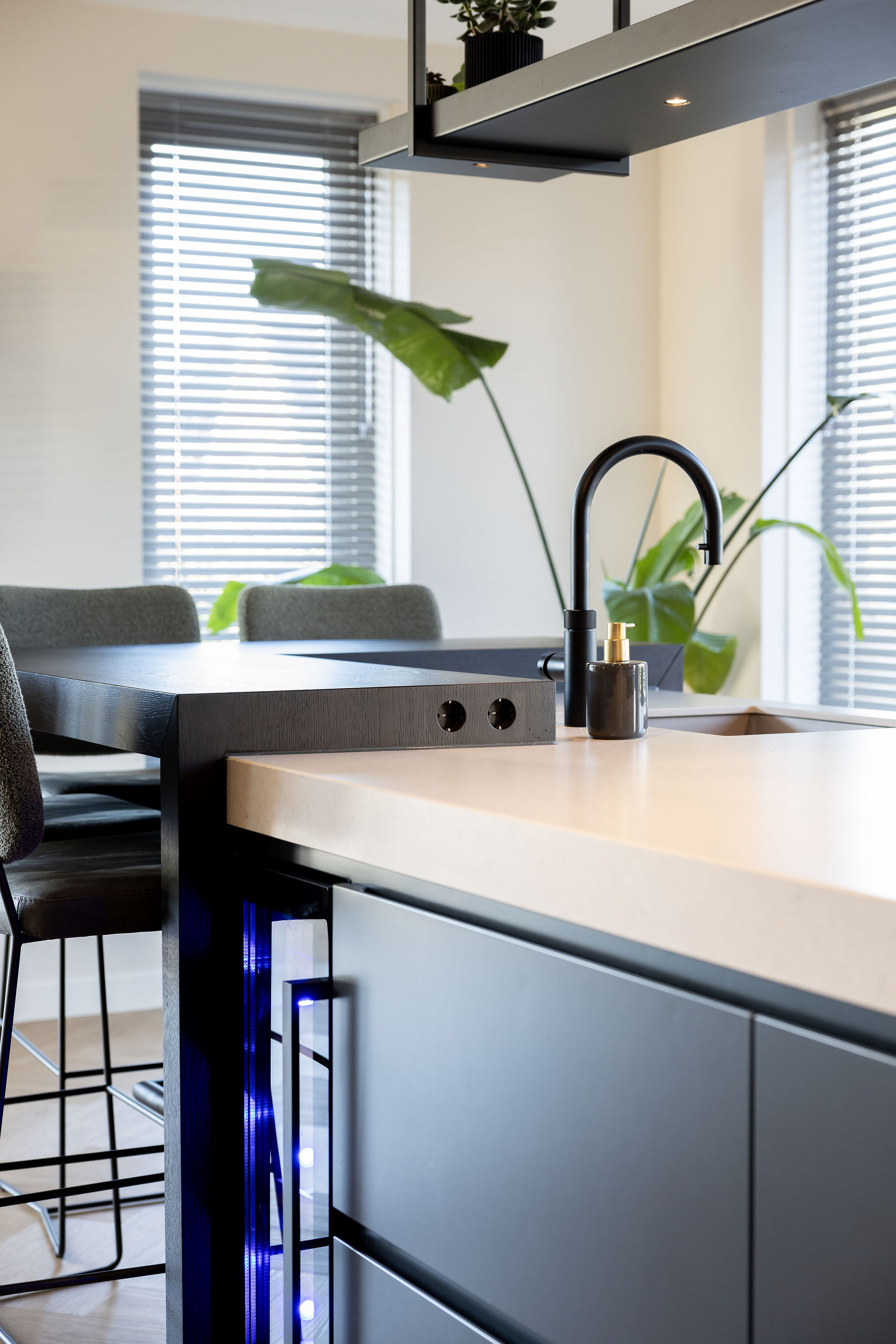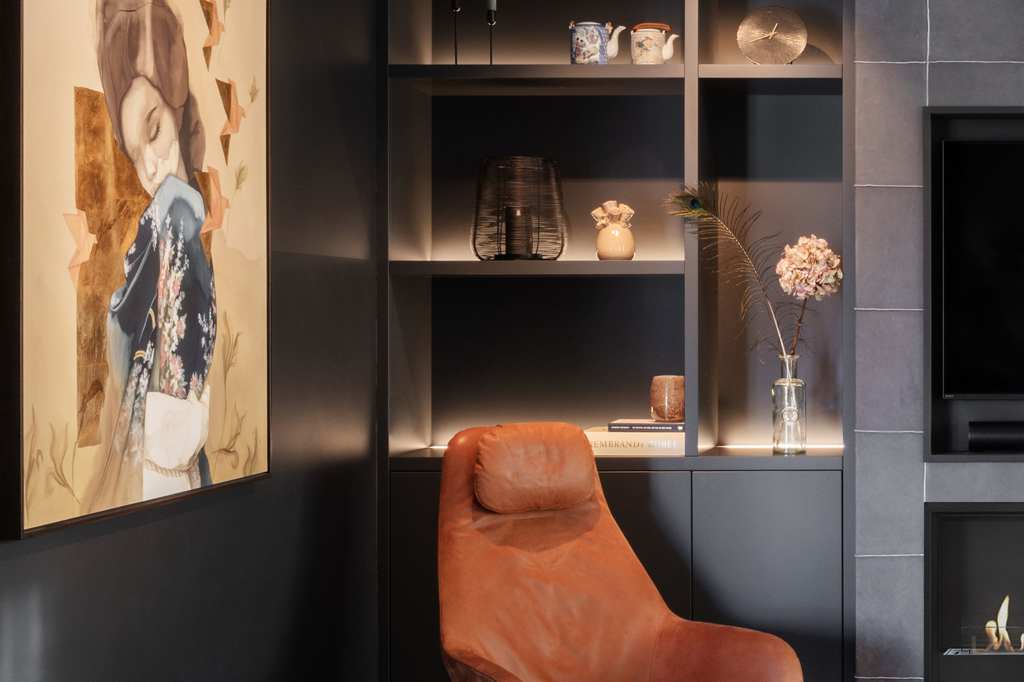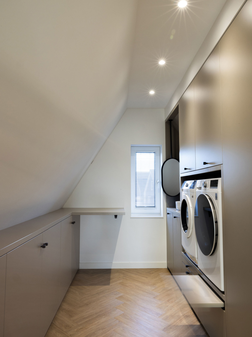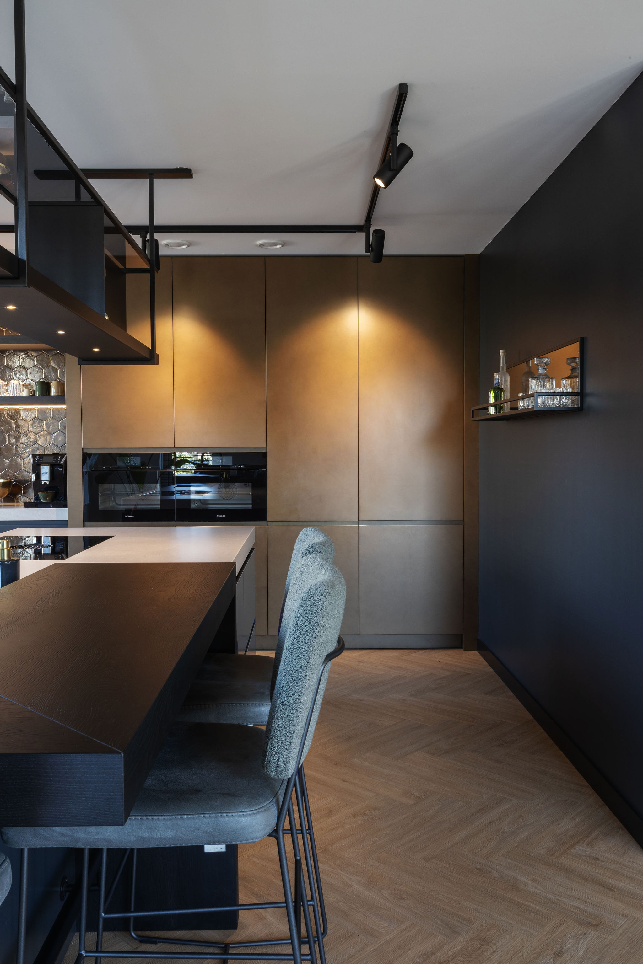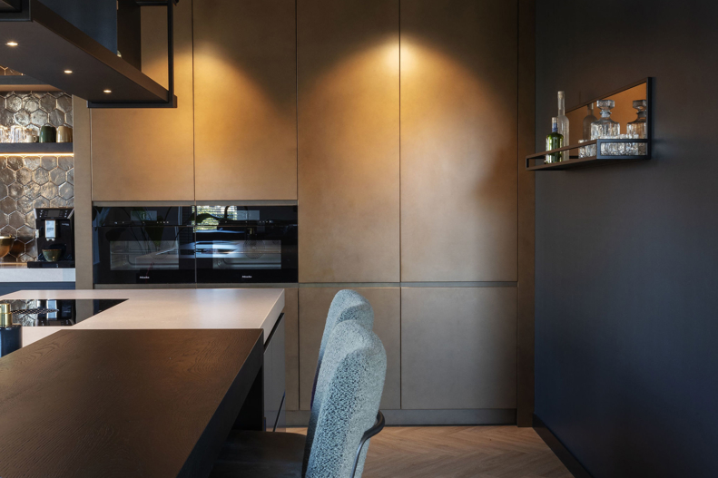 Donkere materialen en bronzen accenten vormen de basis van dit warme interieur. Met slimme maatwerkoplossingen – van een praktische hal en functionele wasruimte tot een kast onder de schuine kap – ontstaat een sfeervol geheel waarin rust, contrast en elegantie samenkomen.