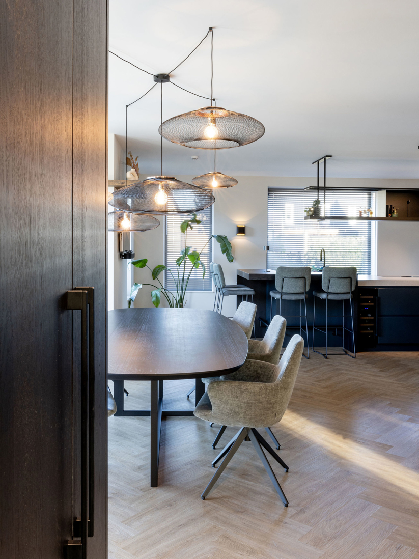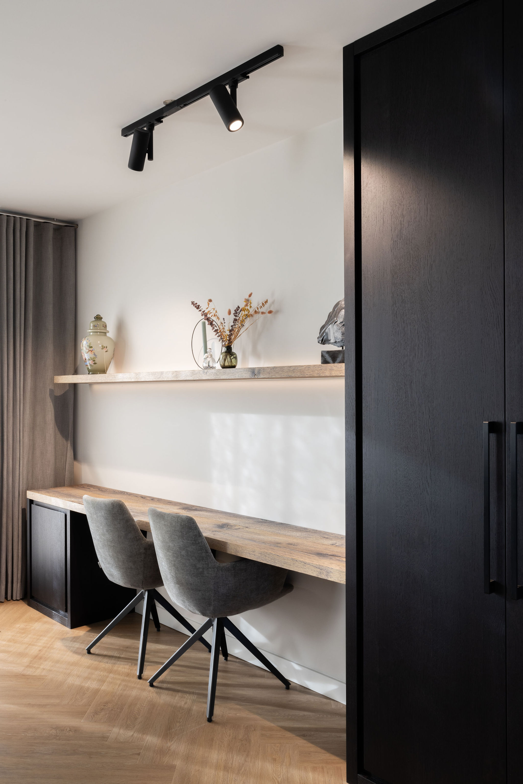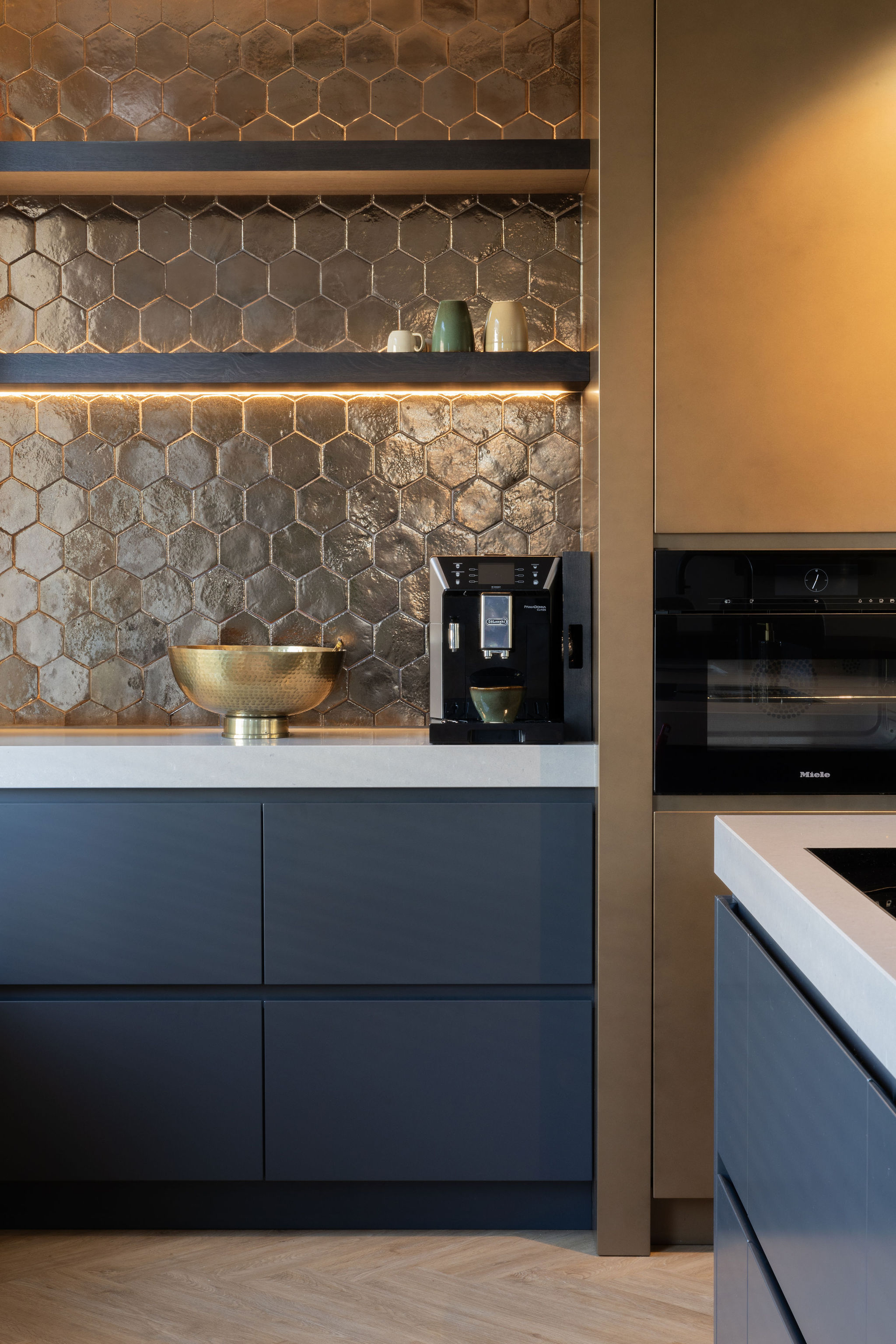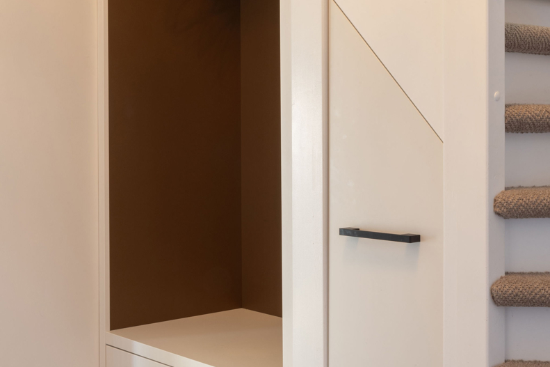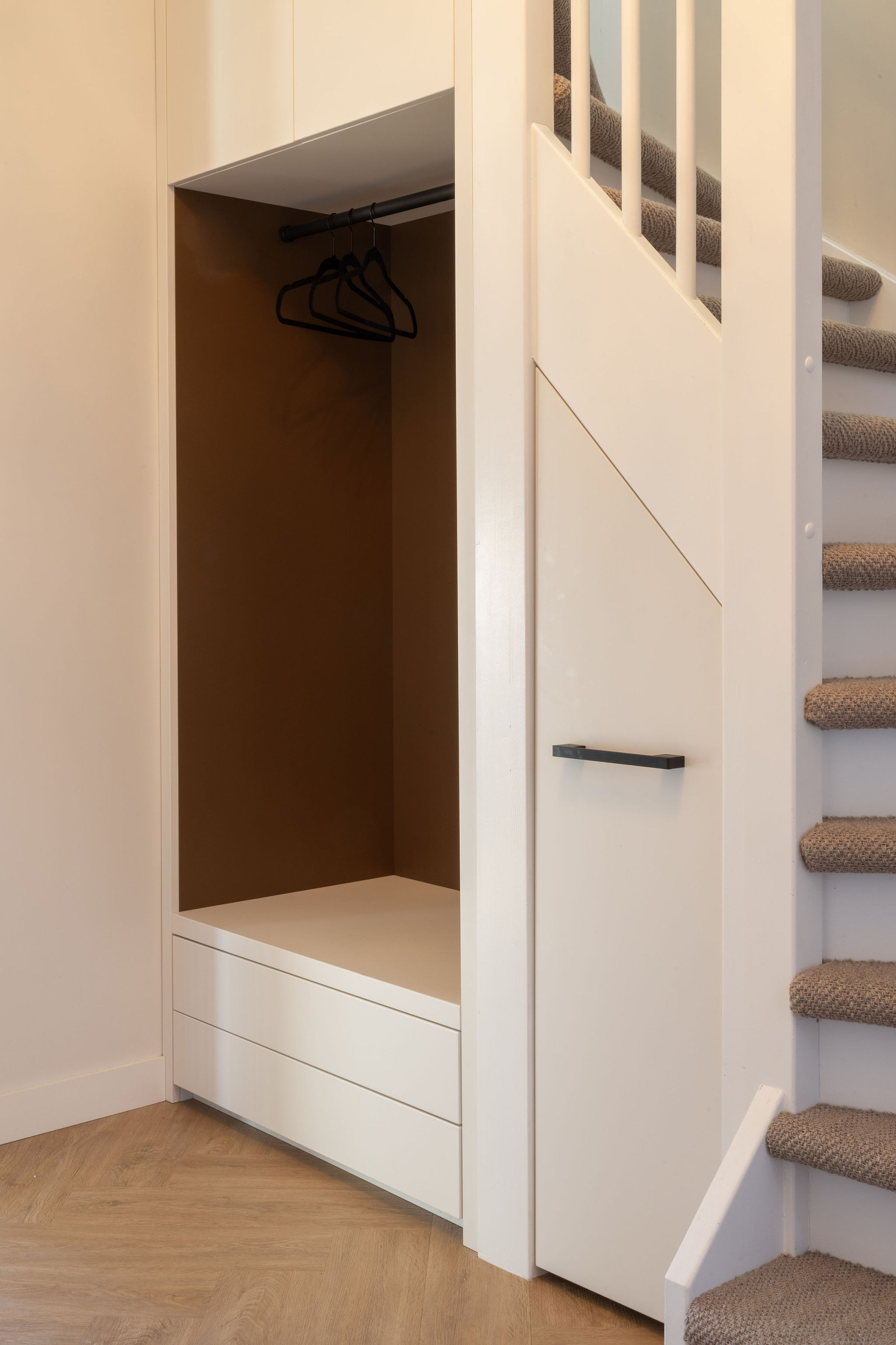 Donkere materialen en bronzen accenten vormen de basis van dit warme interieur. Met slimme maatwerkoplossingen – van een praktische hal en functionele wasruimte tot een kast onder de schuine kap – ontstaat een sfeervol geheel waarin rust, contrast en elegantie samenkomen.