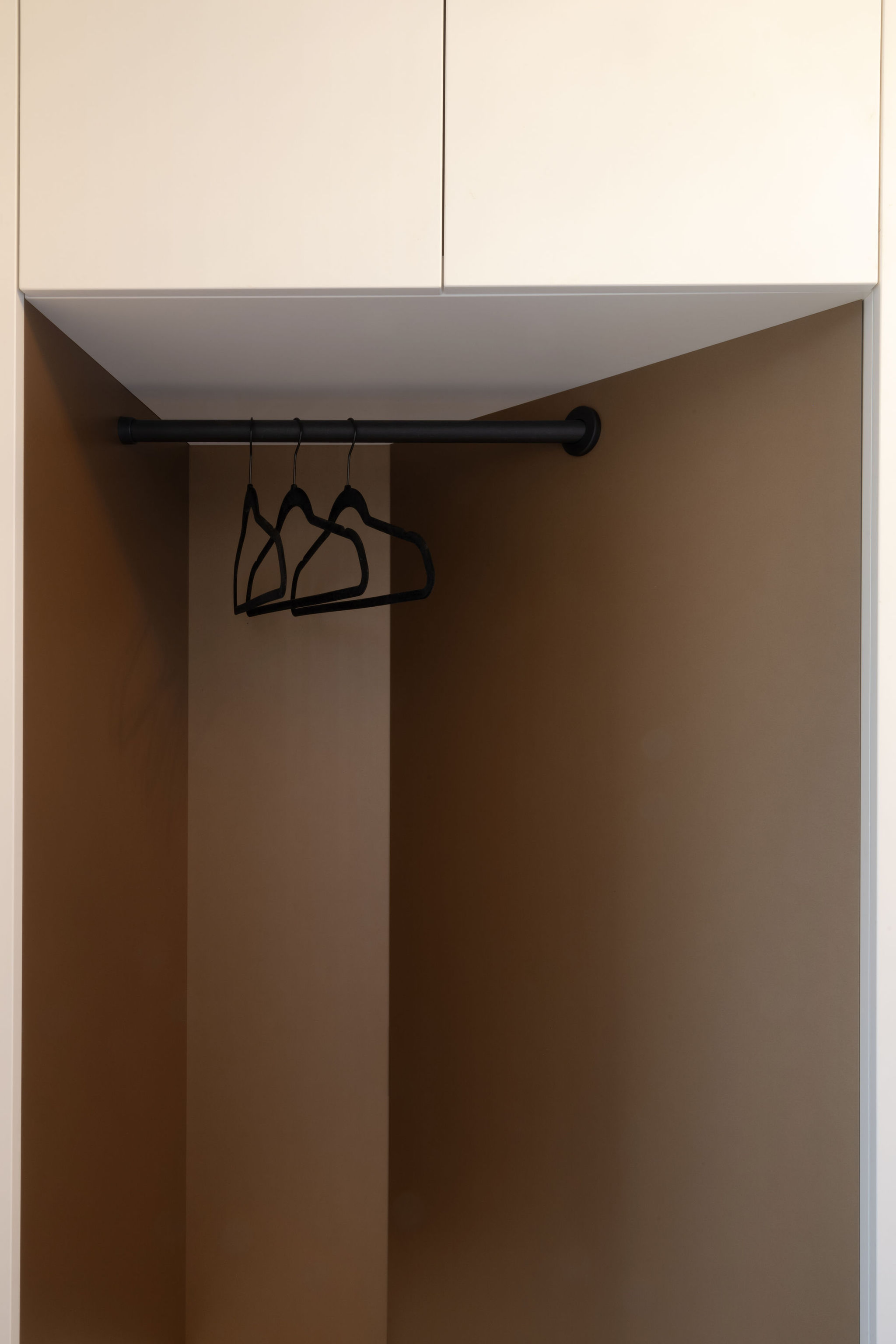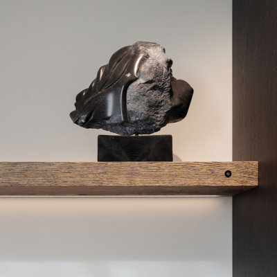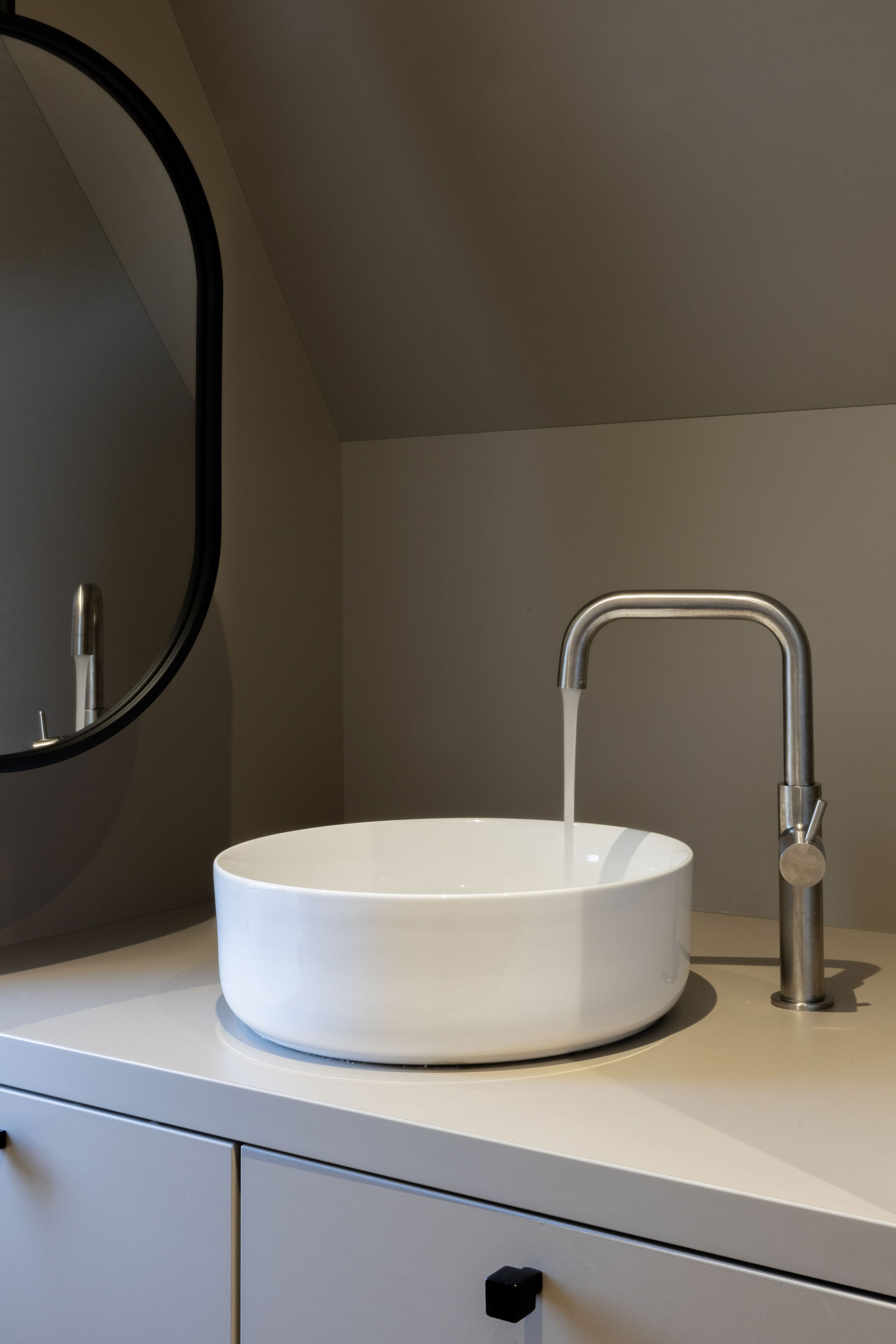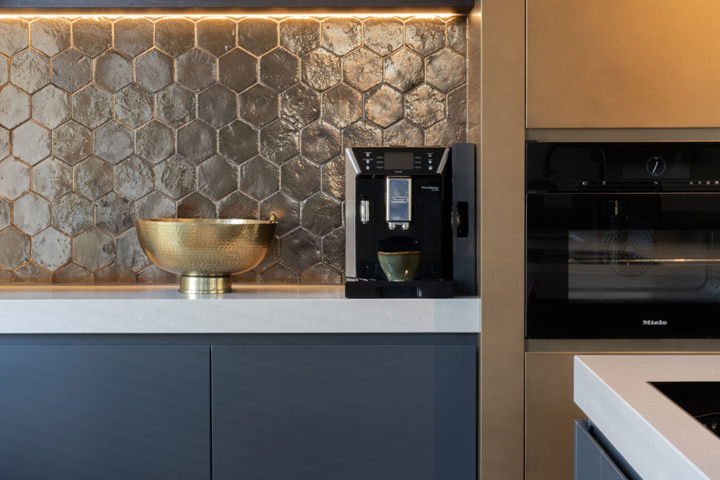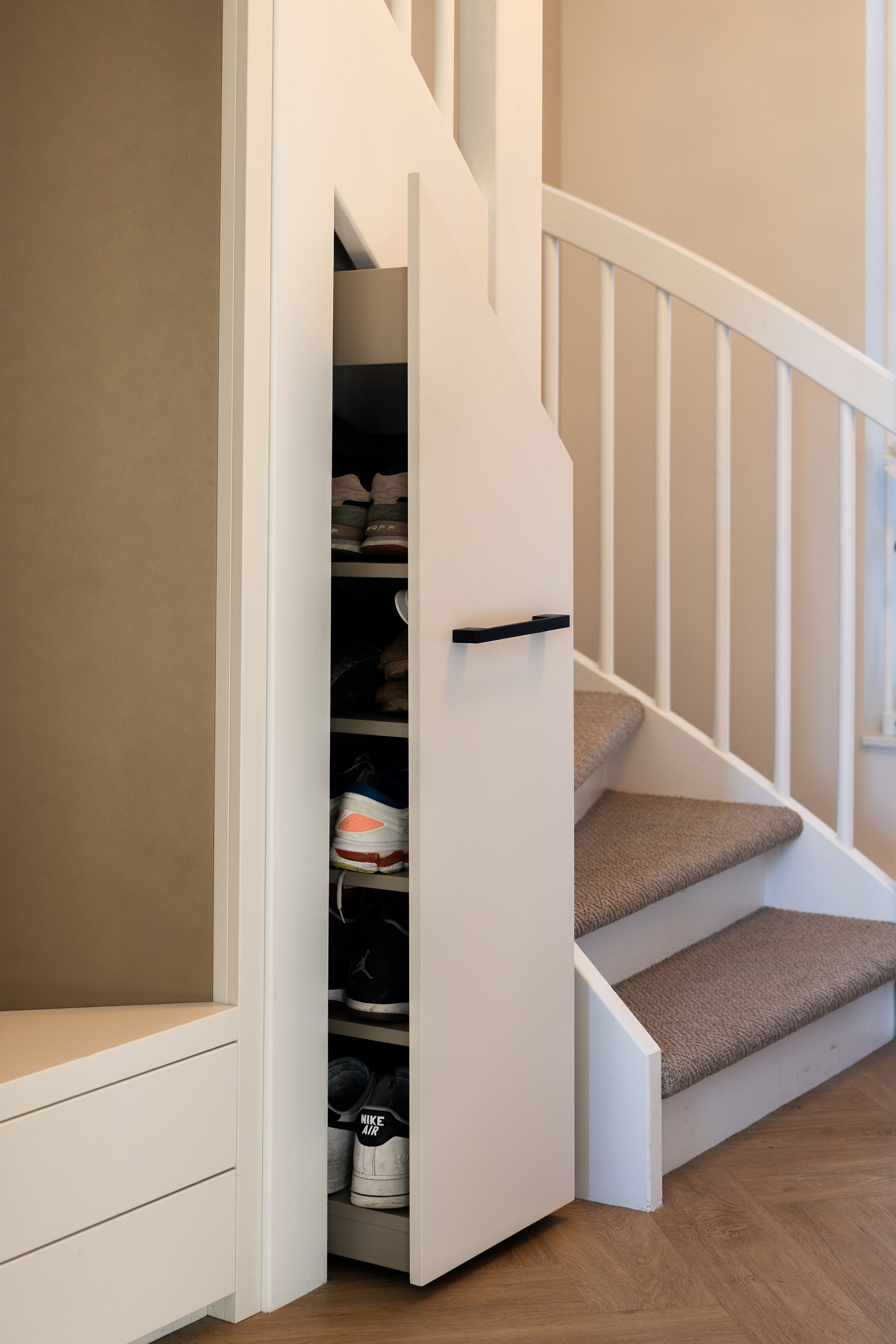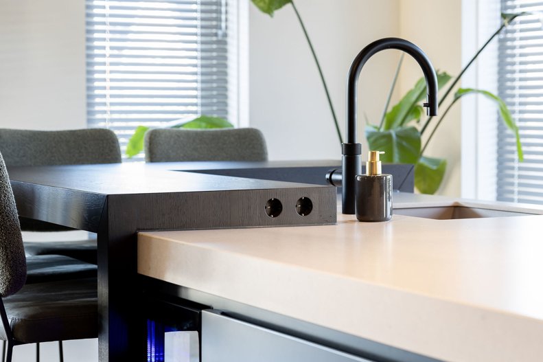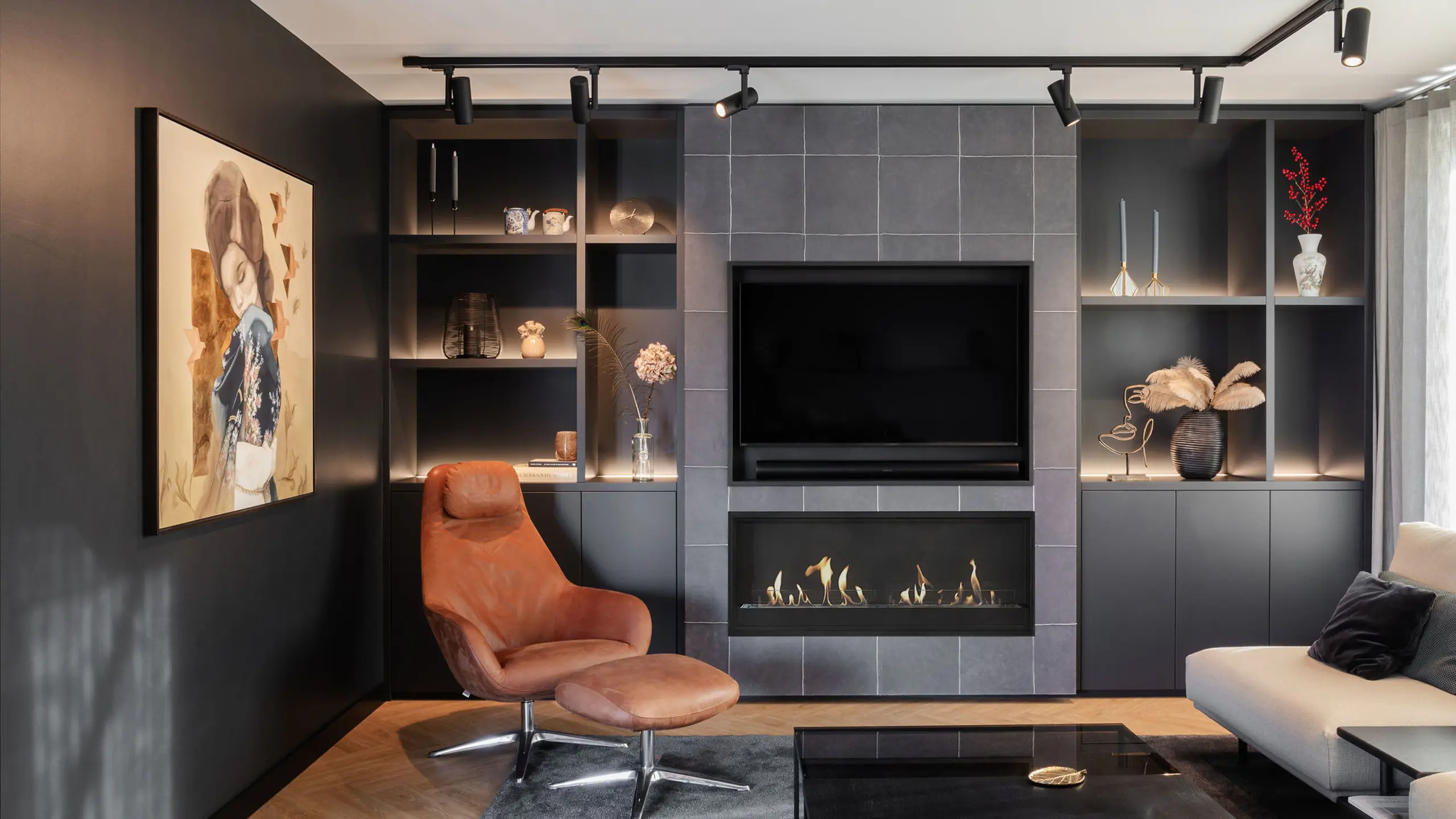 Donkere materialen en bronzen accenten vormen de basis van dit warme interieur. Met slimme maatwerkoplossingen – van een praktische hal en functionele wasruimte tot een kast onder de schuine kap – ontstaat een sfeervol geheel waarin rust, contrast en elegantie samenkomen.