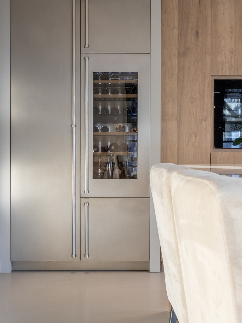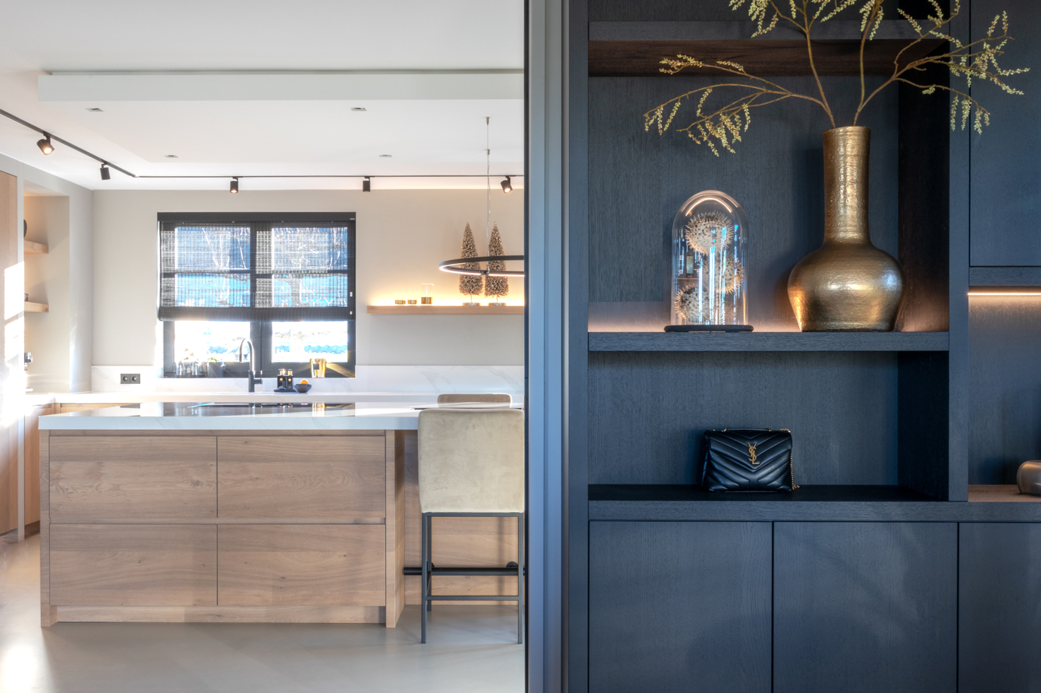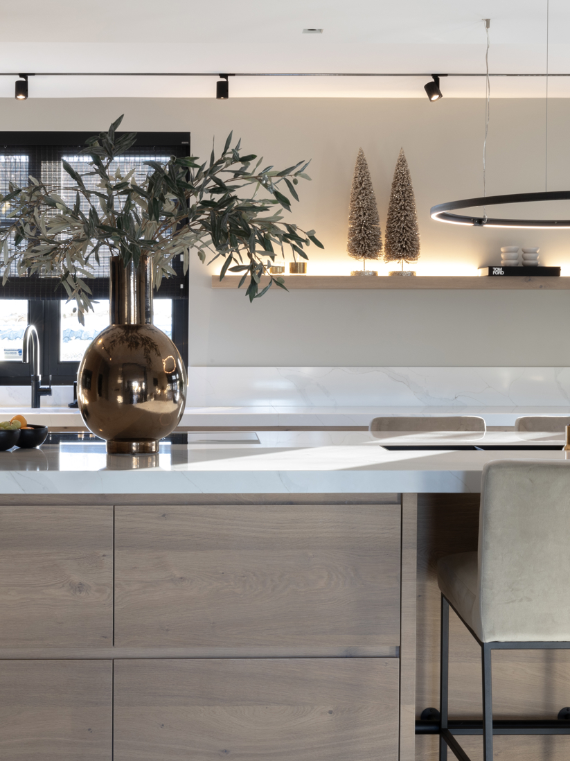 Deze keuken en de bijpassende kasten zijn ontworpen door ons eigen ontwerpteam, dat met veel aandacht werkt aan interieurs met karakter. We zijn trots op projecten als deze, waarin duurzame materialen zoals eikenhout, een composiet blad en hoogwaardige apparatuur van Miele en Bora samenkomen. Het composiet blad brengt schoonheid en gemak samen doordat het sterk is en eenvoudig schoon te houden blijft. Zo groeit een ontwerp dat rust ademt en toch een stille kracht in zich draagt.