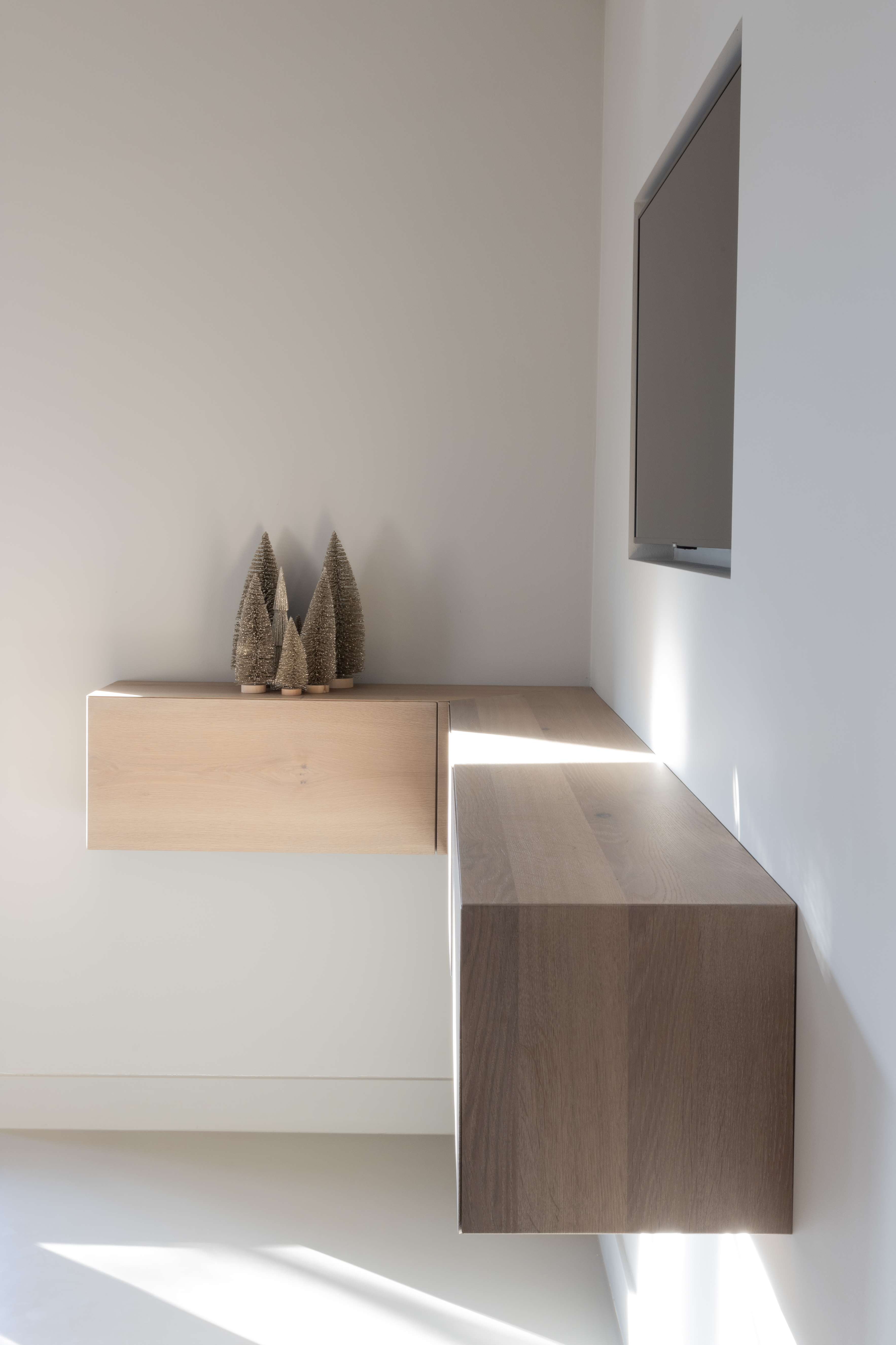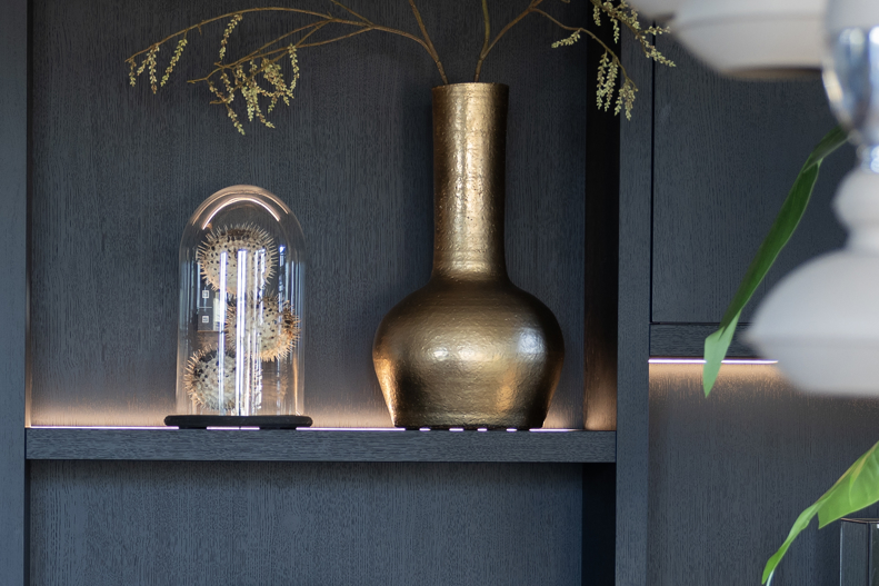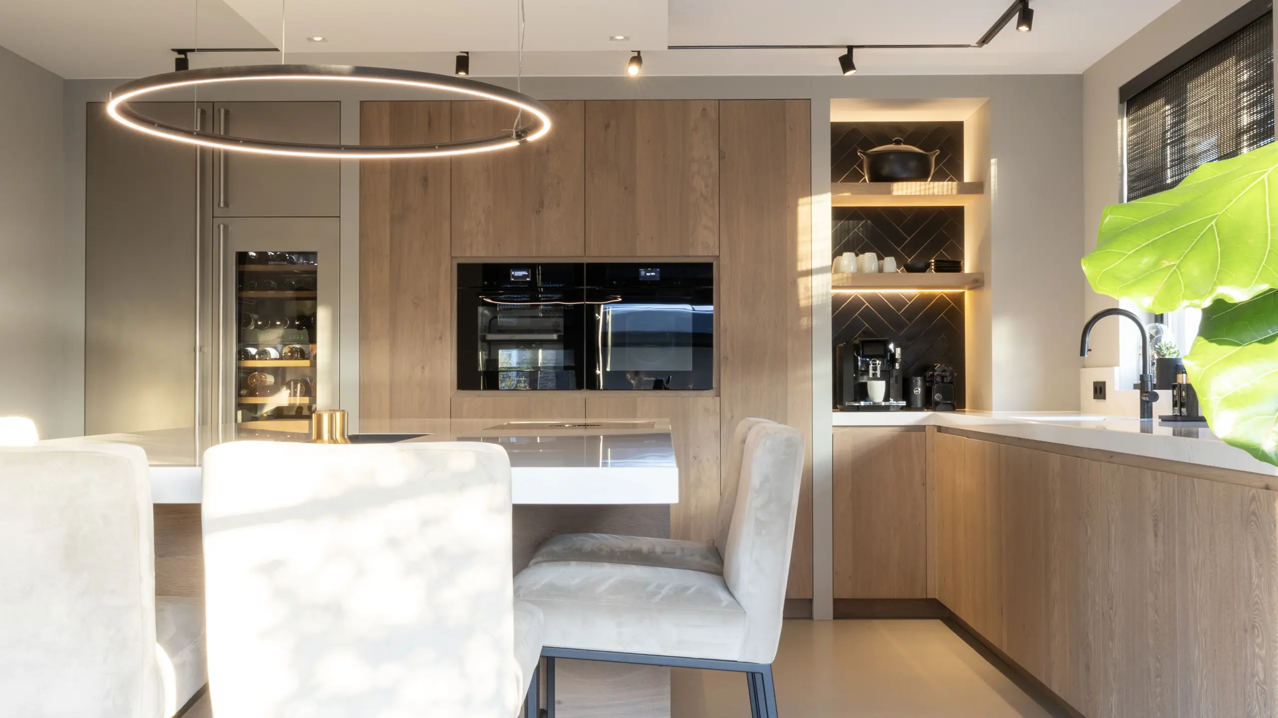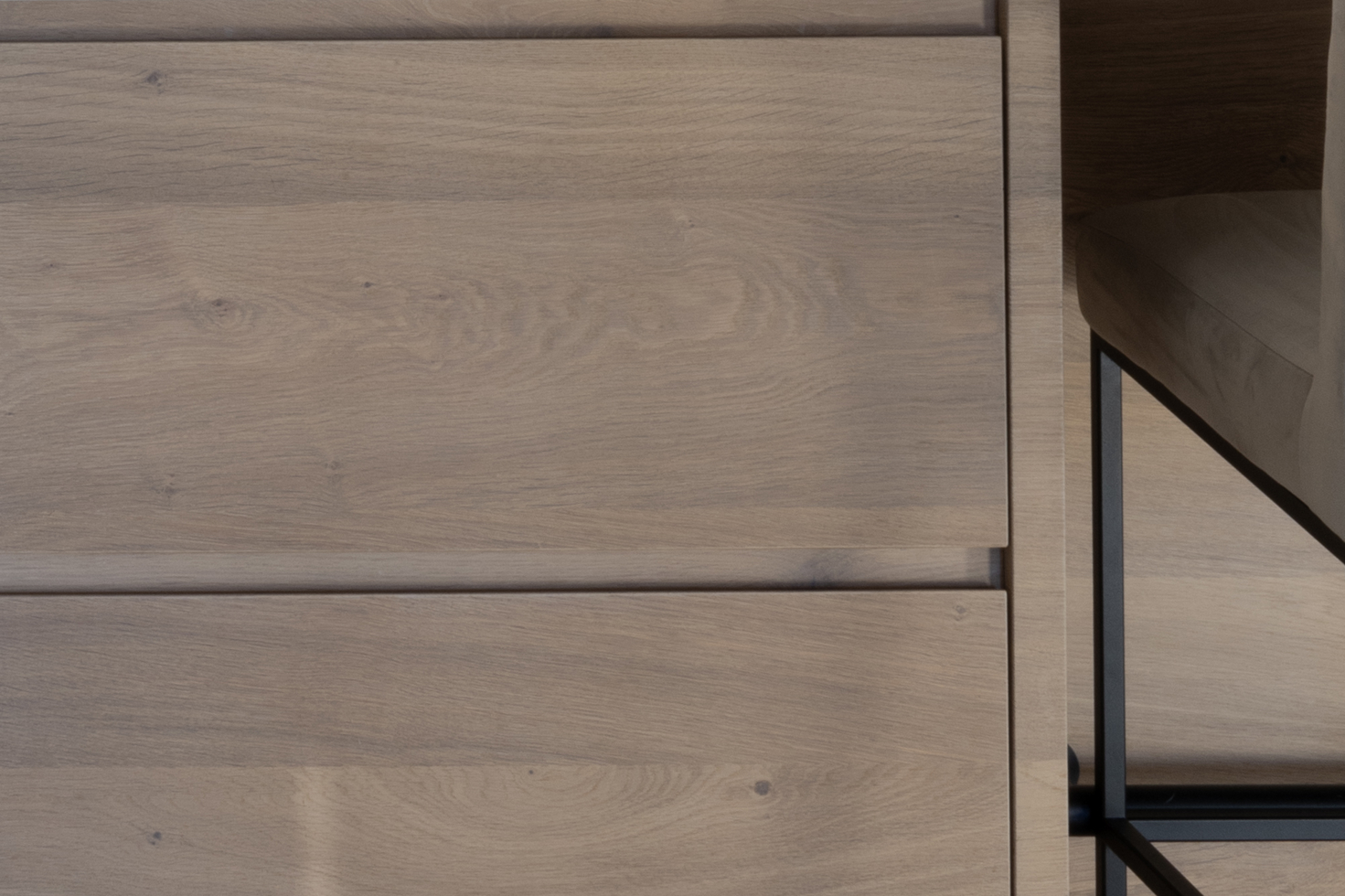 Deze keuken en de bijpassende kasten zijn ontworpen door ons eigen ontwerpteam, dat met veel aandacht werkt aan interieurs met karakter. We zijn trots op projecten als deze, waarin duurzame materialen zoals eikenhout, een composiet blad en hoogwaardige apparatuur van Miele en Bora samenkomen. Het composiet blad brengt schoonheid en gemak samen doordat het sterk is en eenvoudig schoon te houden blijft. Zo groeit een ontwerp dat rust ademt en toch een stille kracht in zich draagt.