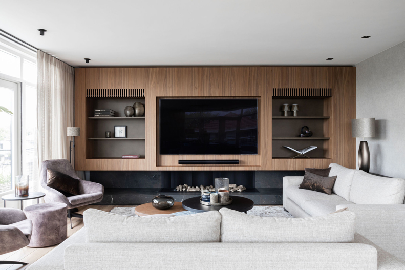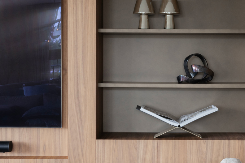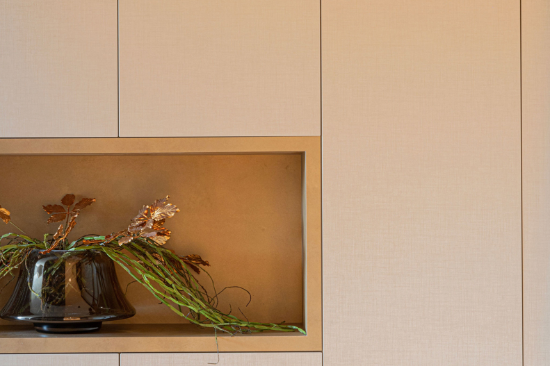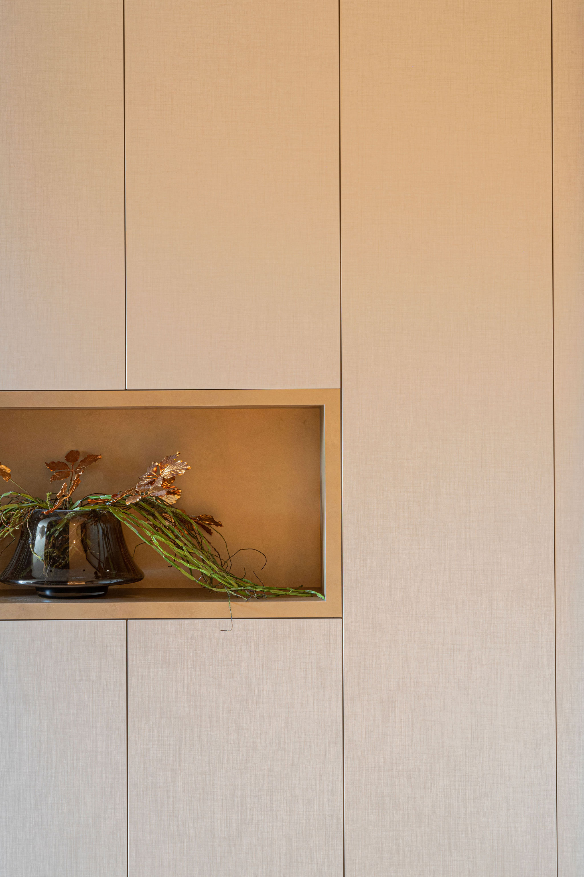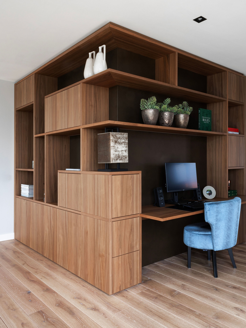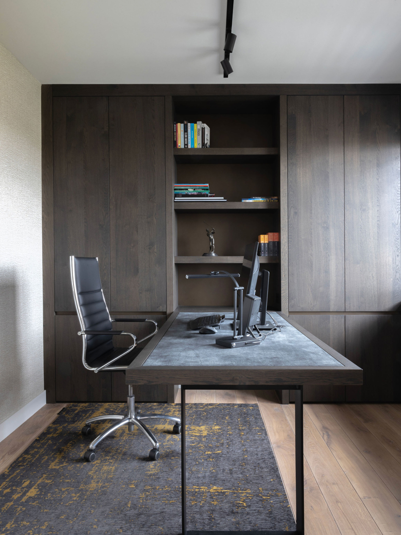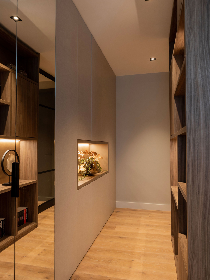 In dit appartement staat maatwerk centraal. De zachte notenstructuur van Decolegno vormt de basis van een vakkenkast die werkplek, opbergruimte en open vakken samenbrengt. De Cinewall in notenhout en natuursteen is een ware blikvanger, met subtiel weggewerkte techniek voor rust en balans. In de slaapkamer zetten we deze stijl door in een elegante walk-in closet met open vakken en dichte deuren. Achter een aparte deur kreeg het thuiskantoor juist een eigen identiteit: een wereld los van de rest, waar de klant zich volledig kan richten op zijn werk.