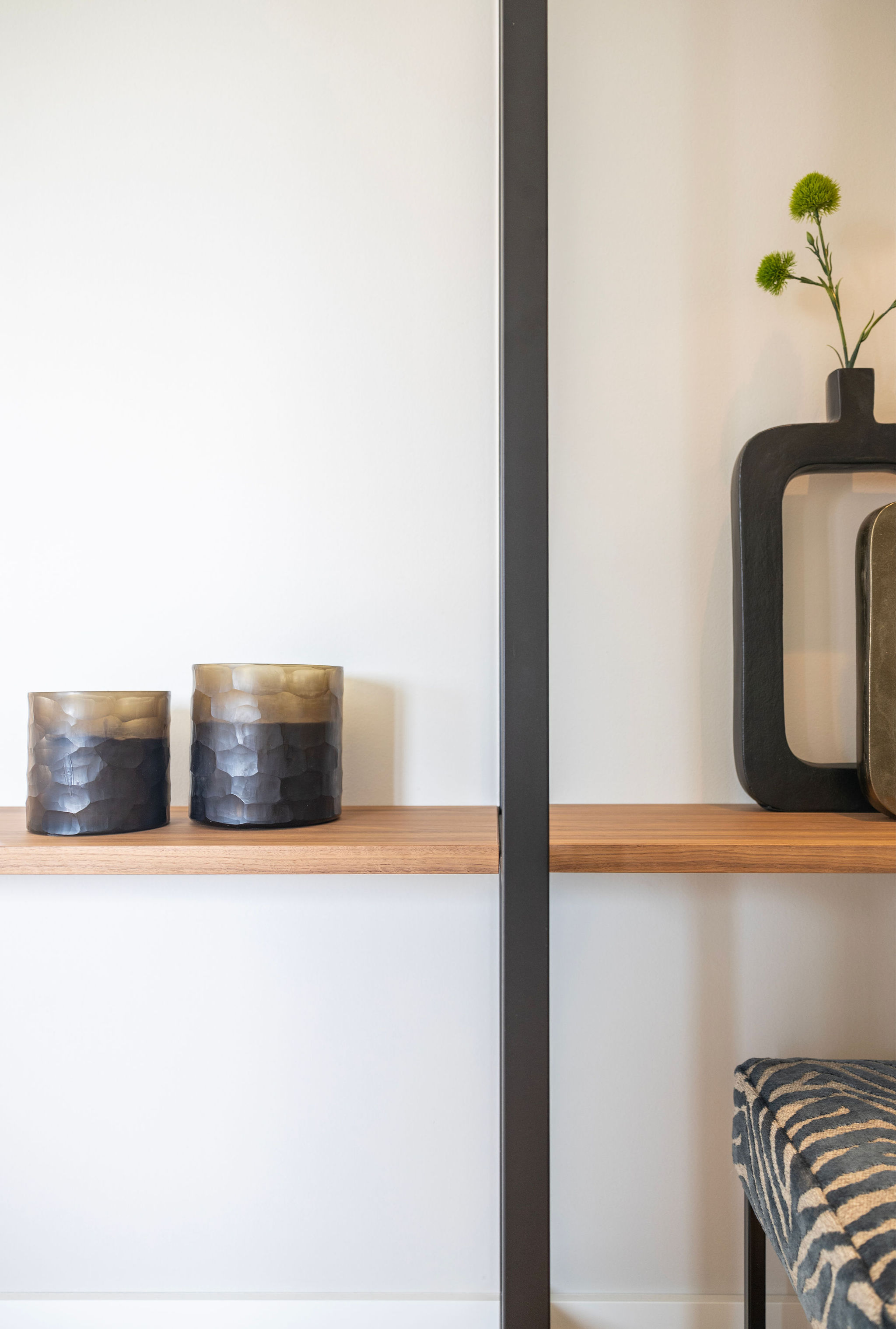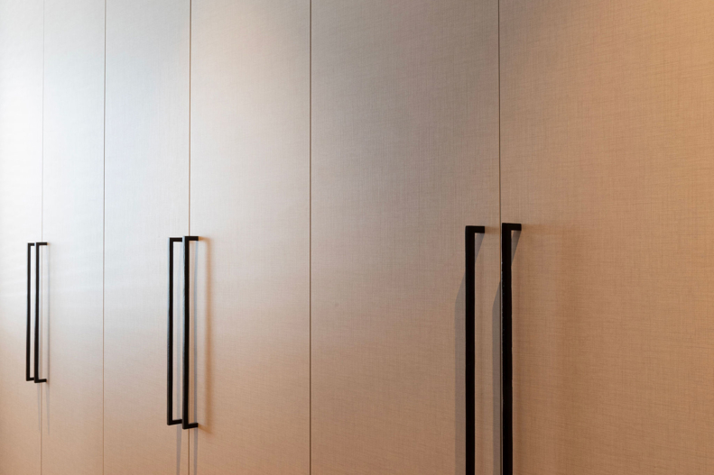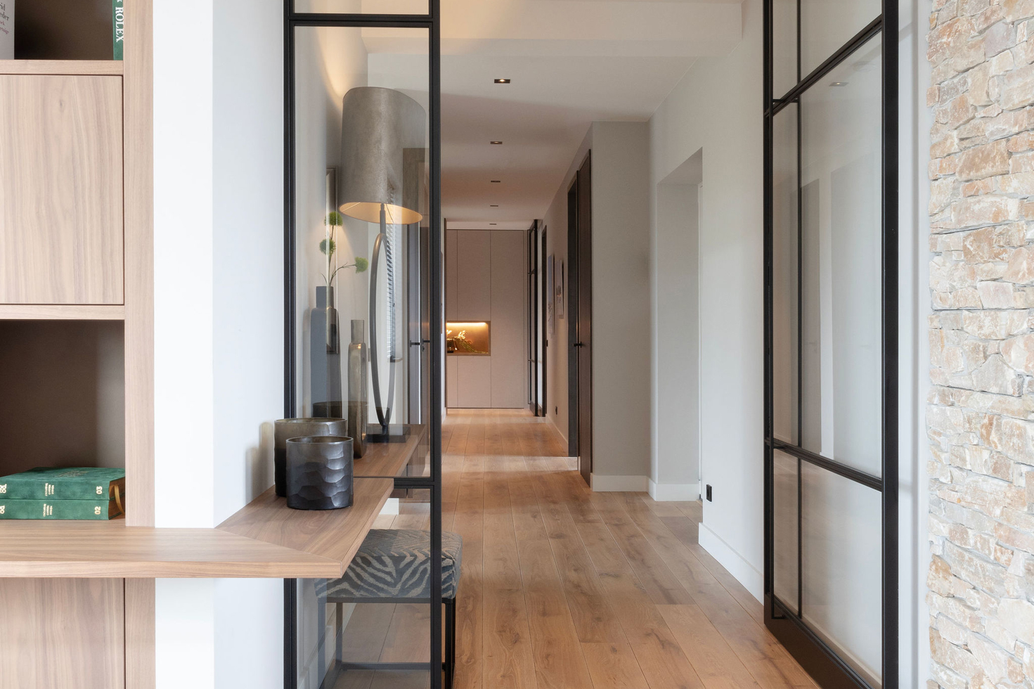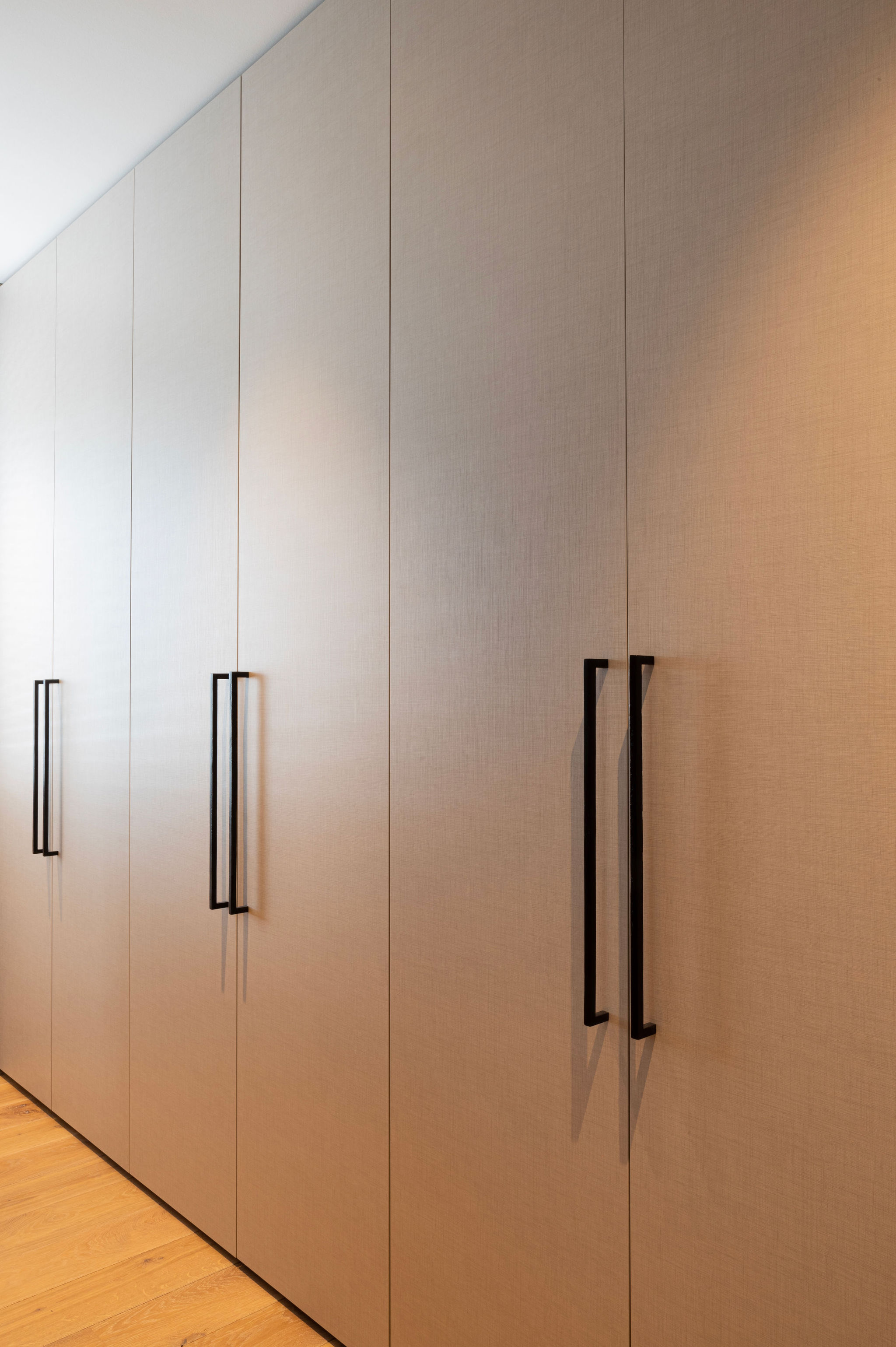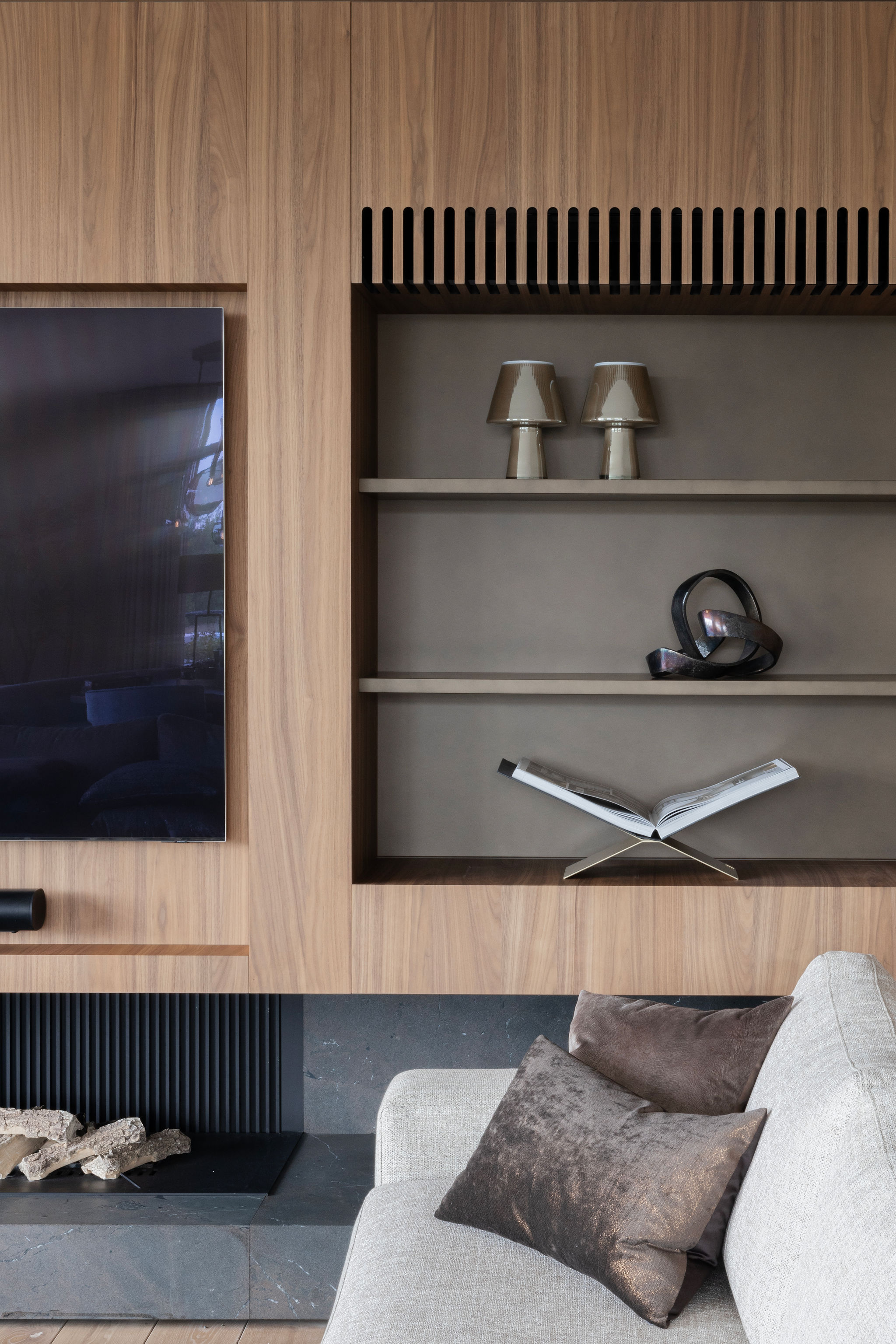 In dit appartement staat maatwerk centraal. De zachte notenstructuur van Decolegno vormt de basis van een vakkenkast die werkplek, opbergruimte en open vakken samenbrengt. De Cinewall in notenhout en natuursteen is een ware blikvanger, met subtiel weggewerkte techniek voor rust en balans. In de slaapkamer zetten we deze stijl door in een elegante walk-in closet met open vakken en dichte deuren. Achter een aparte deur kreeg het thuiskantoor juist een eigen identiteit: een wereld los van de rest, waar de klant zich volledig kan richten op zijn werk.