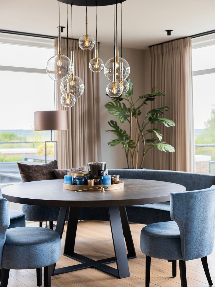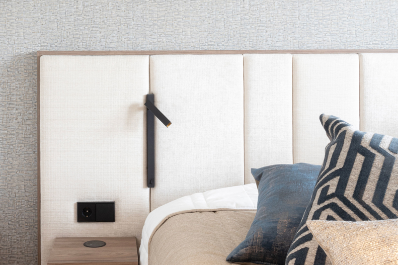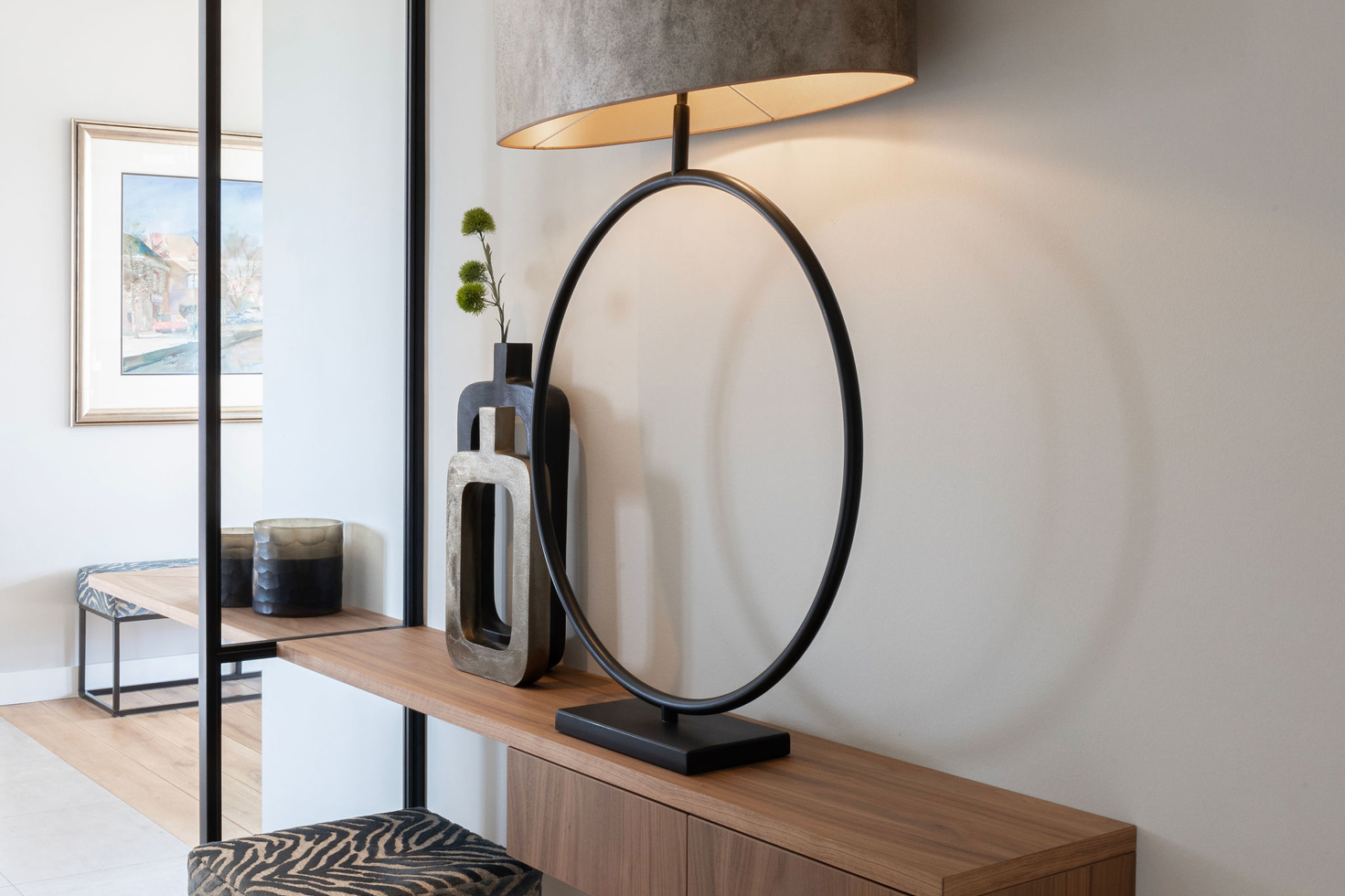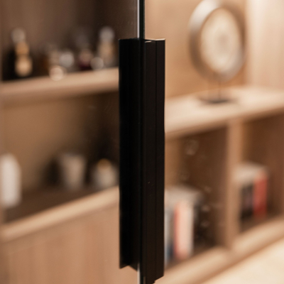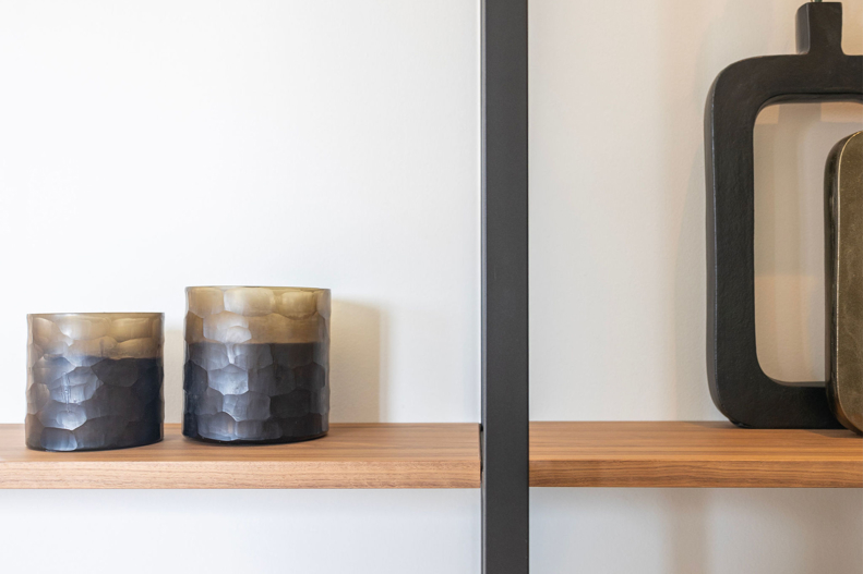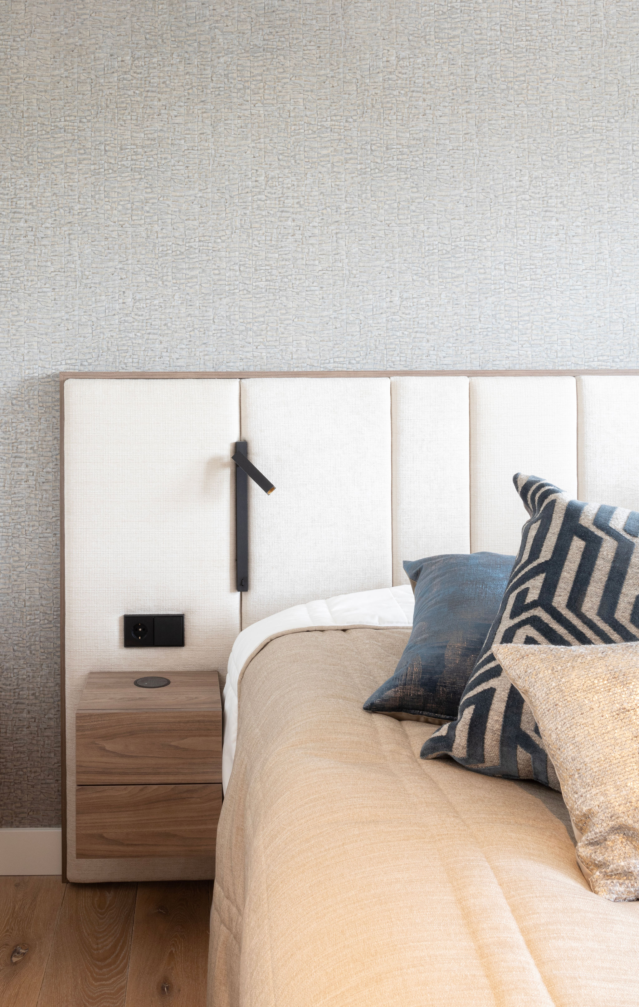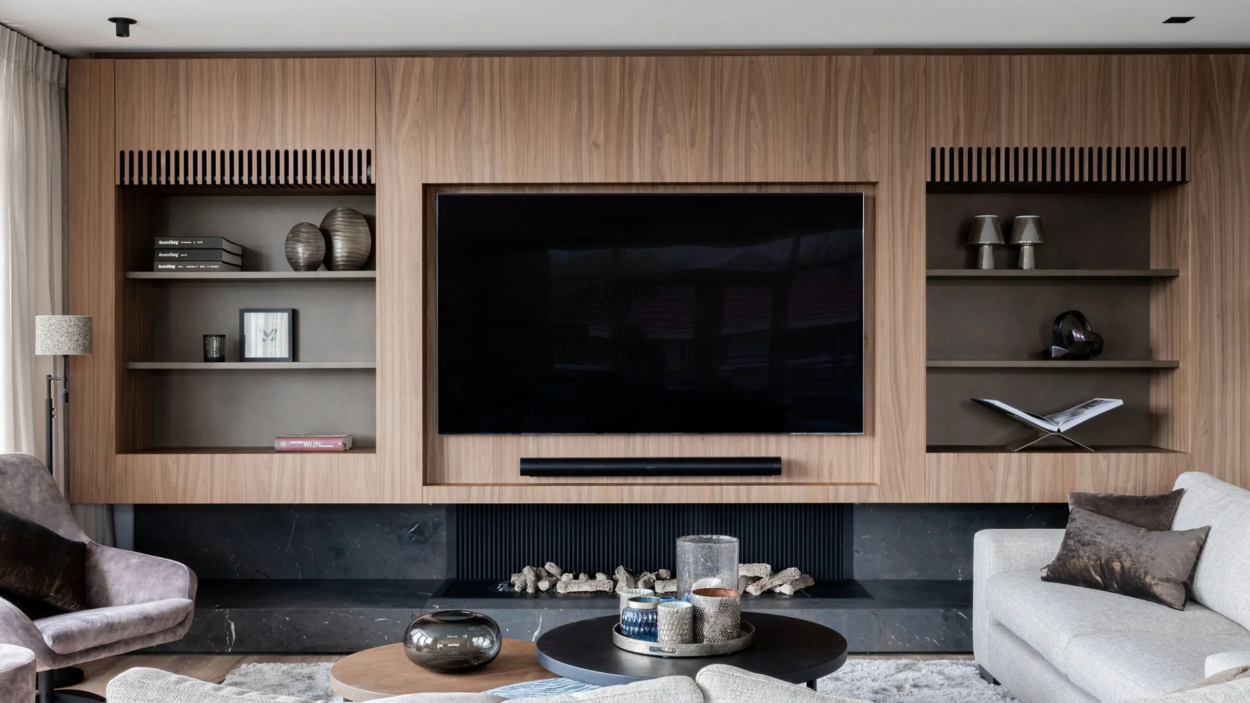 In dit appartement staat maatwerk centraal. De zachte notenstructuur van Decolegno vormt de basis van een vakkenkast die werkplek, opbergruimte en open vakken samenbrengt. De Cinewall in notenhout en natuursteen is een ware blikvanger, met subtiel weggewerkte techniek voor rust en balans. In de slaapkamer zetten we deze stijl door in een elegante walk-in closet met open vakken en dichte deuren. Achter een aparte deur kreeg het thuiskantoor juist een eigen identiteit: een wereld los van de rest, waar de klant zich volledig kan richten op zijn werk.