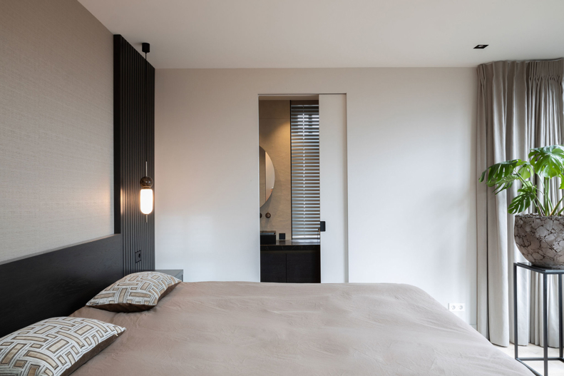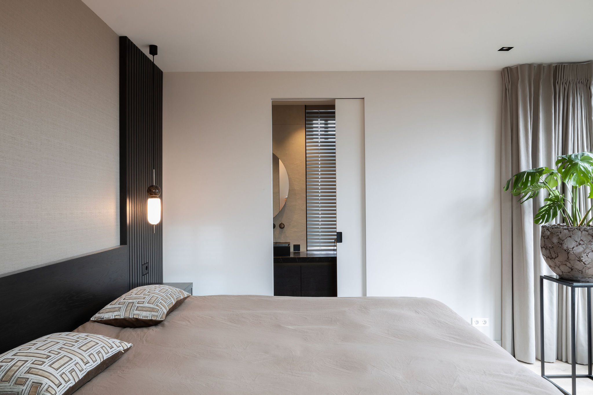 In dit project spelen licht en donker de hoofdrol, van de leefkeuken tot de slaapkamer, badkamer en woonkamer. Donker eiken, natuursteen en bronzen details contrasteren prachtig met lichte vloeren en zachte beige tinten. Zo ontstaat een harmonieus geheel dat warmte, spanning en elegantie uitstraalt in iedere ruimte.