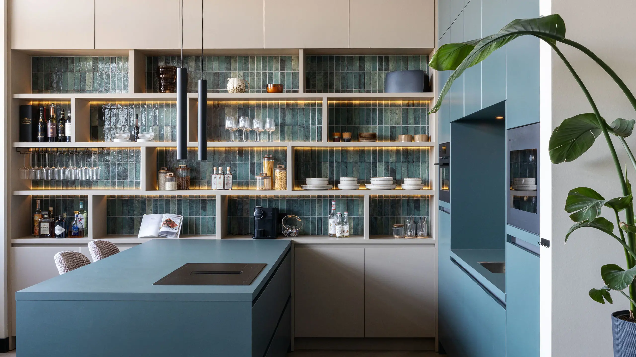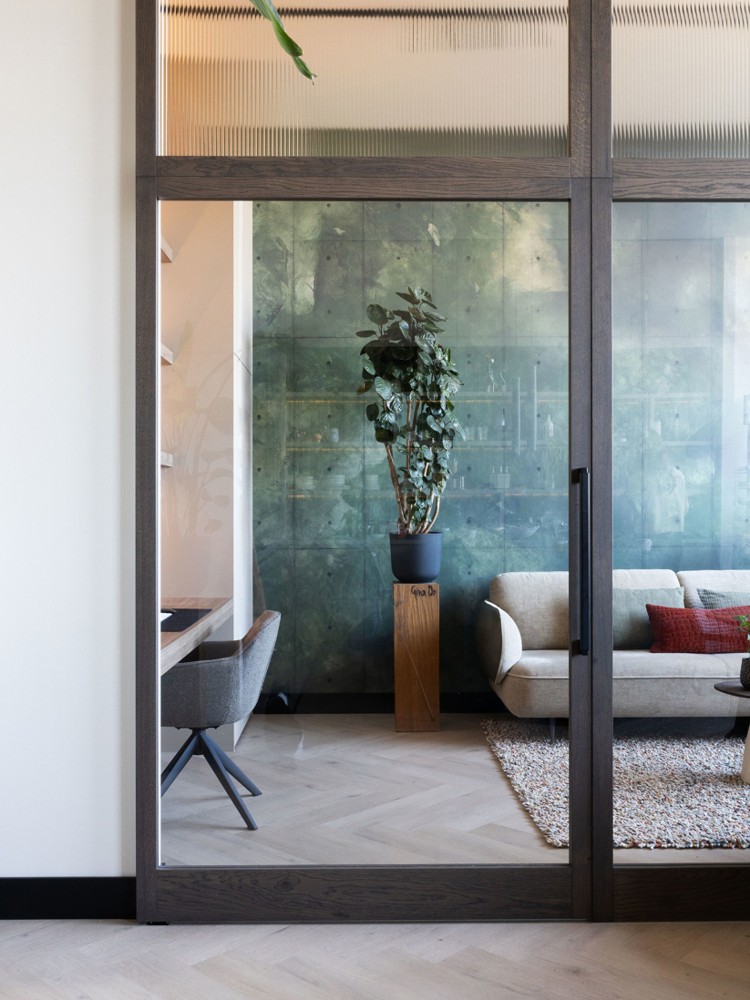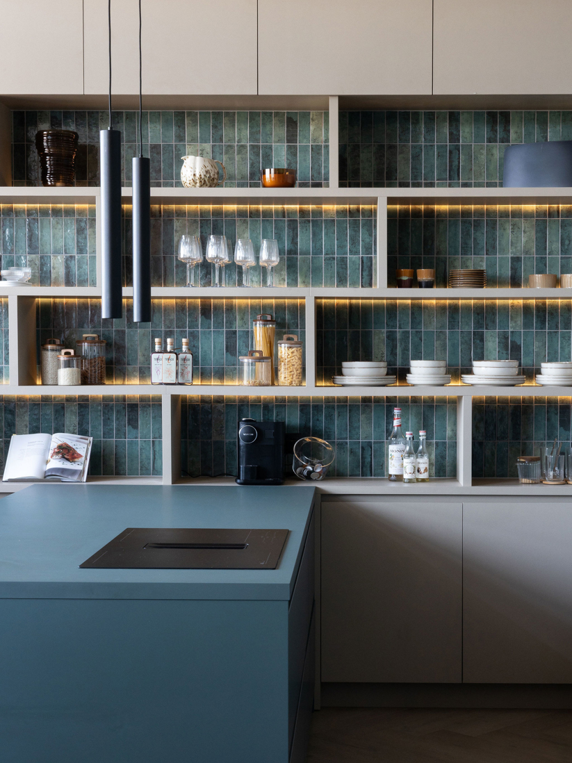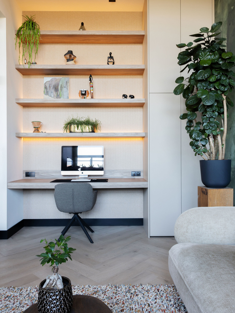 In dit project draait alles om kleur en balans, van de vakkenkast tot het losse meubilair. Diep zee blauw wordt versterkt door warme koraal tinten, waardoor elke hoek een eigen sfeer krijgt. Een speels en harmonieus geheel waarin werken, wonen en samenkomen moeiteloos in elkaar overlopen.