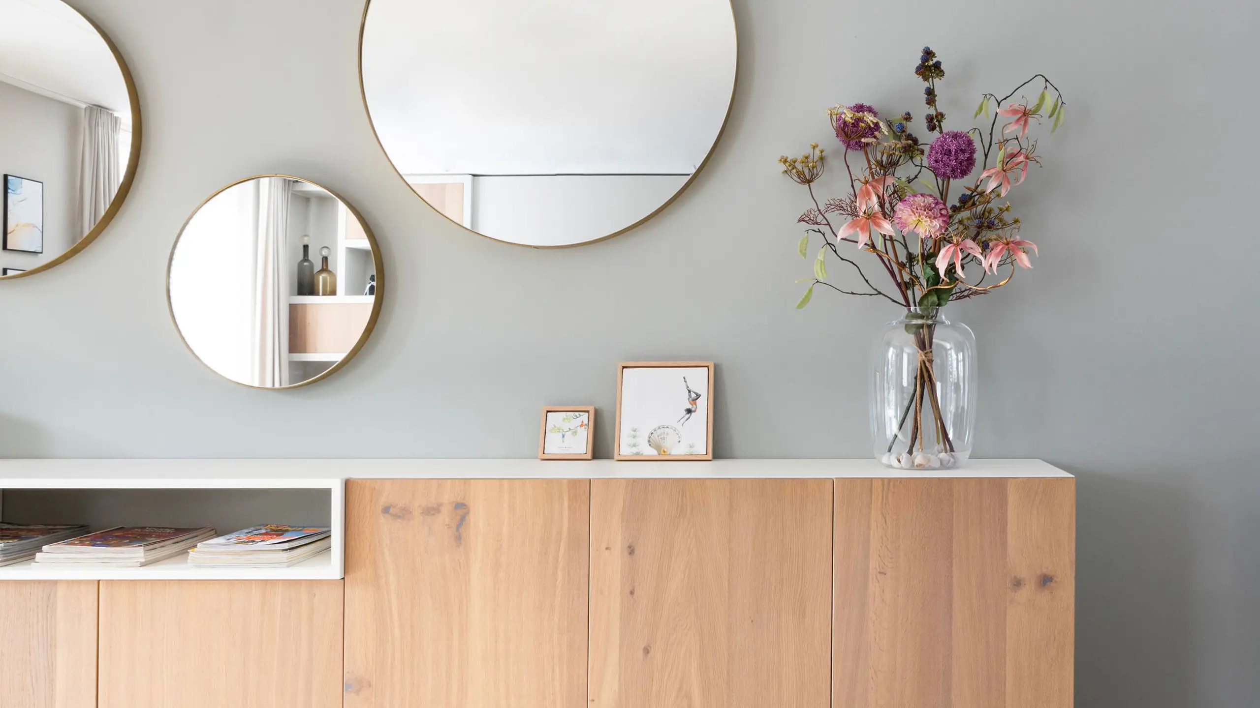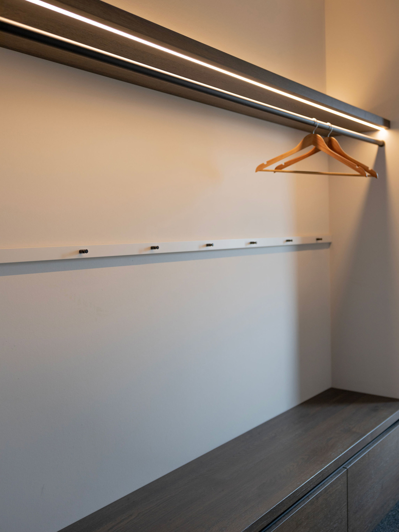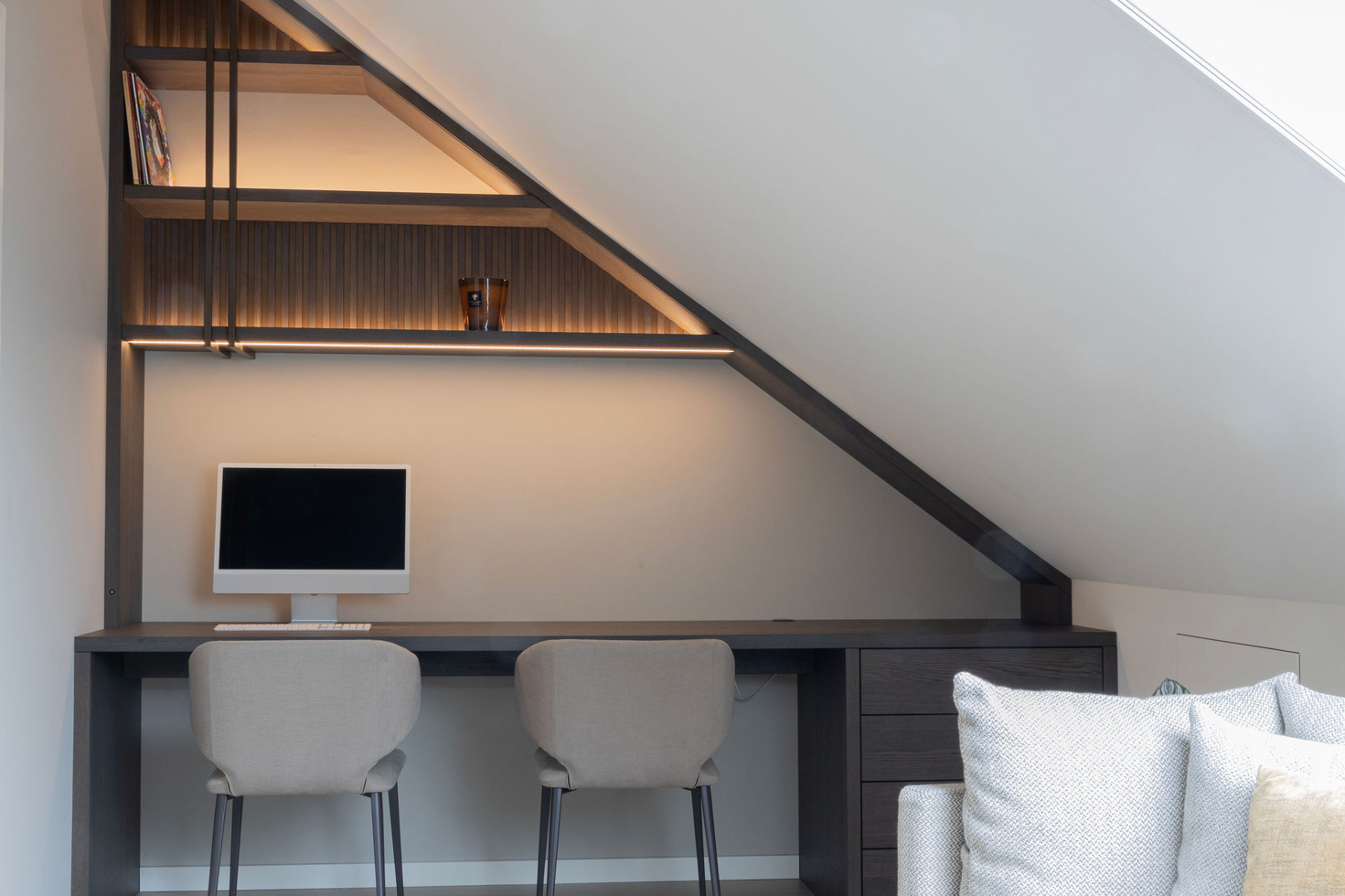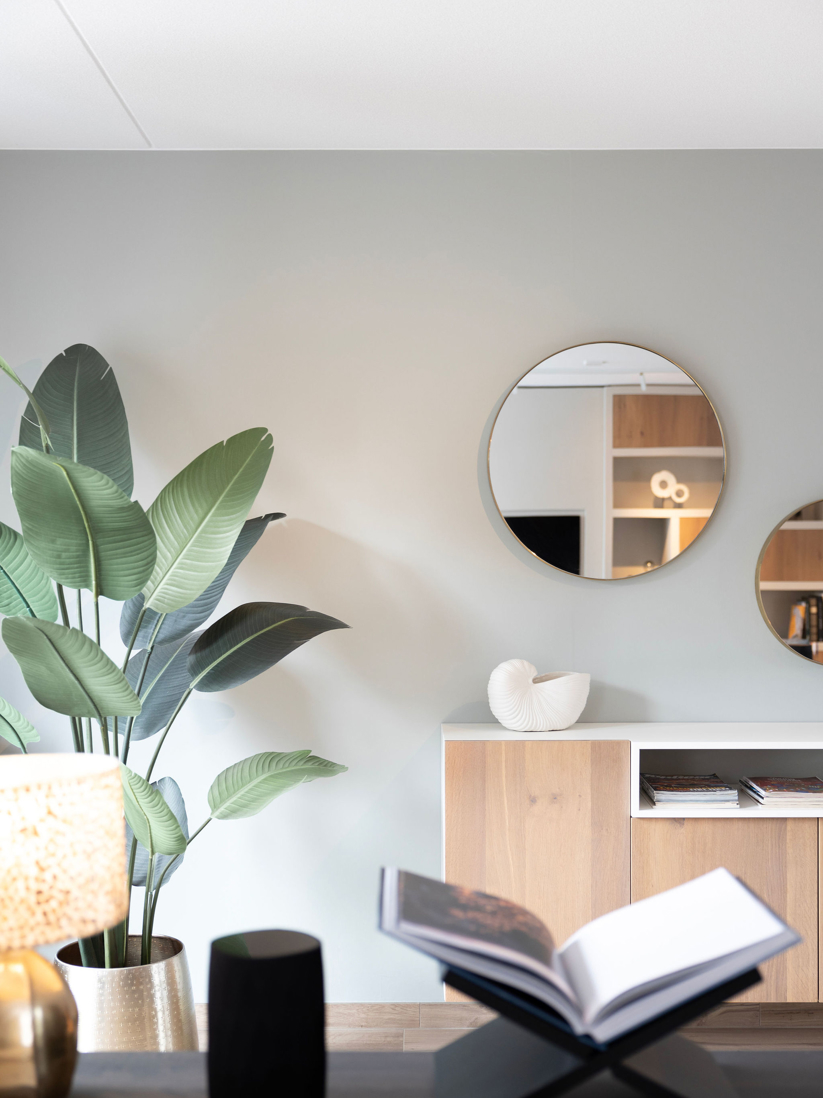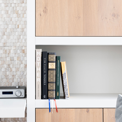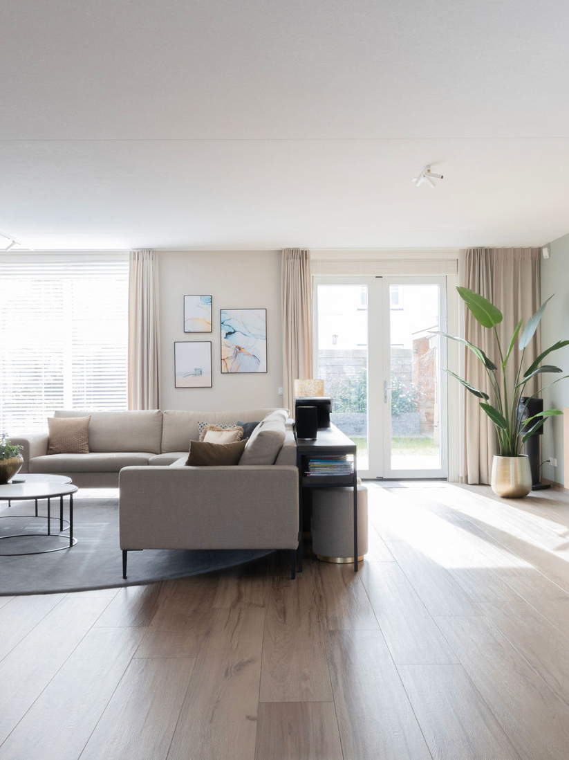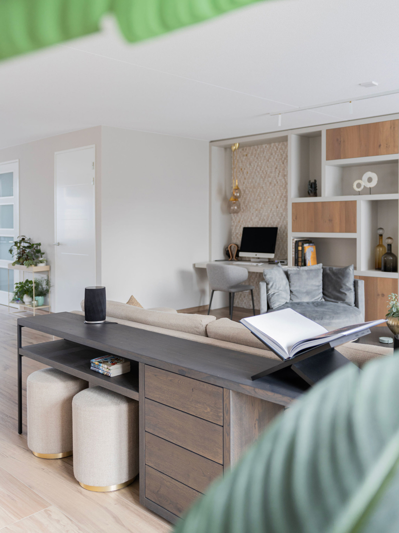 In een prachtige wijk tussen de duinen ontwierpen we een interieur dat het strandgevoel naar binnen haalt. Lichte eikentinten, zachte blauwen en een bijzondere wandafwerking van coco’s schelpen zorgen voor een frisse en serene basis. Naast de cinema wall, sidetable en dressoir mochten we ook het losse meubilair verzorgen, zodat alles één geheel vormt. Later is de zolder getransformeerd tot een sfeervolle master bedroom met bedachterwand, geïntegreerde wandkast met tv, een wastafel en een knus werkplekje.