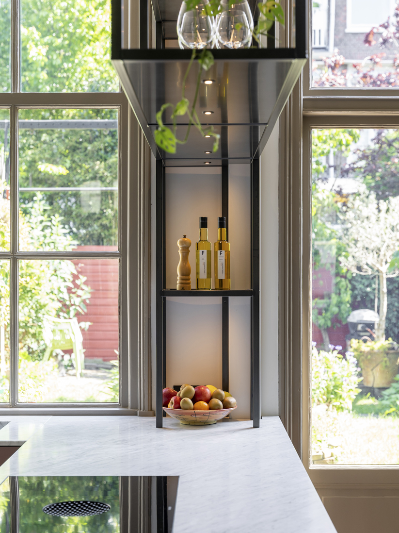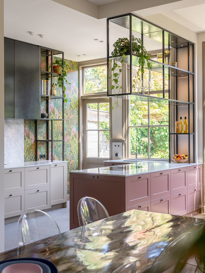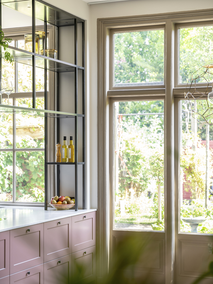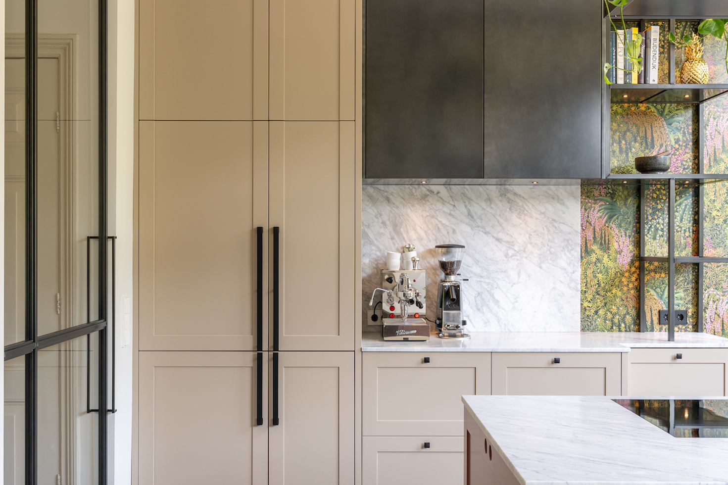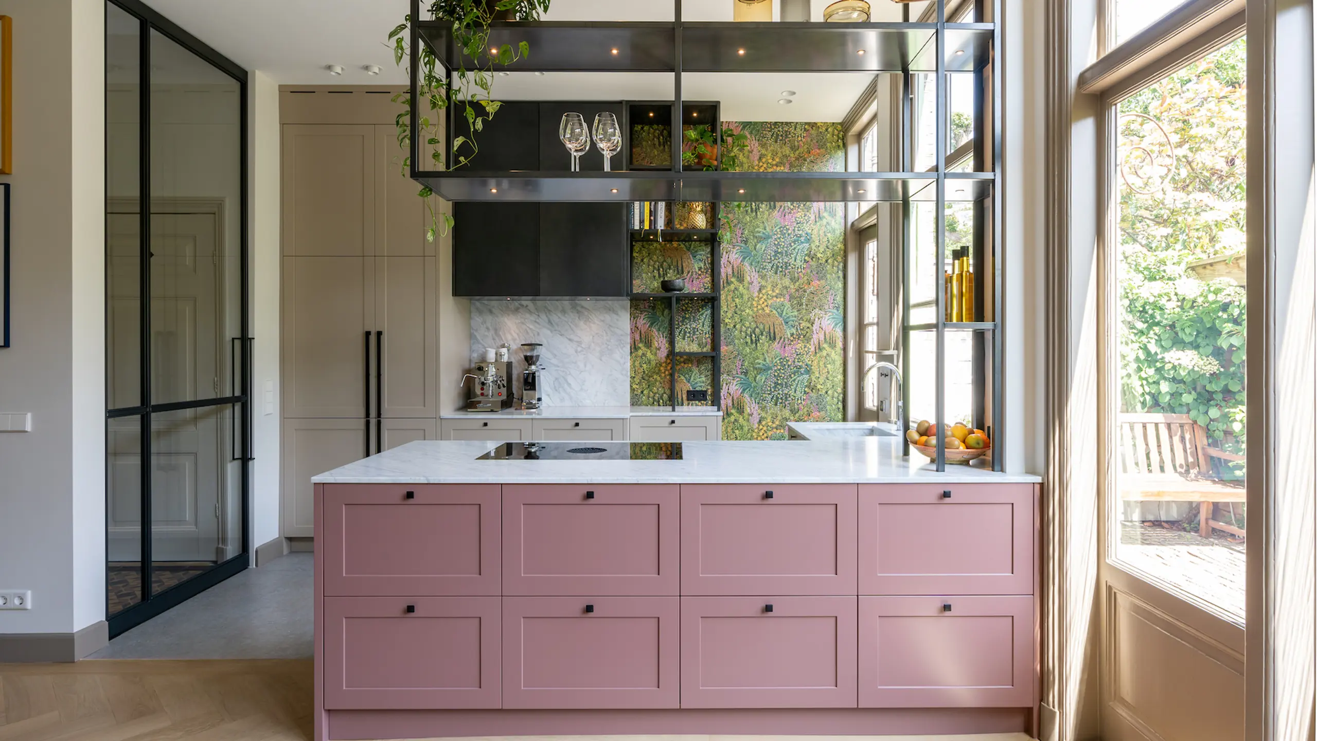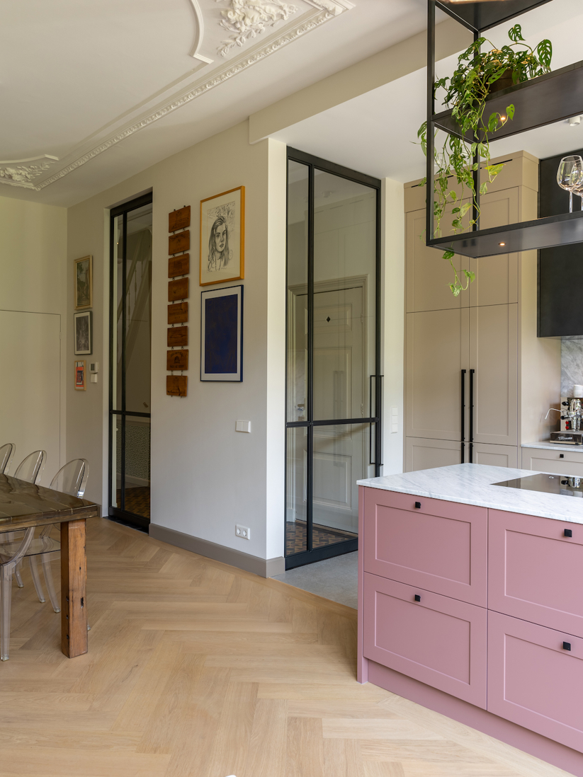 Midden in Den Haag, in een statig klassiek pand, komt deze kleurrijke keuken volledig tot haar recht. De rijke tinten van The Little Greene vormen een levendig samenspel met het robuuste blauwstaal metaallak, waardoor elegantie en stoerheid elkaar ontmoeten. Samen met Den Haan Renovators hebben we dit eclectische geheel tot leven gebracht – een keuken die geschiedenis ademt en toch eigentijds durft te zijn.