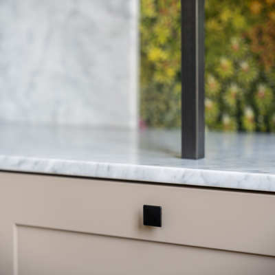 Het marmeren keukenblad, uitgevoerd in Bianco Carrara, zorgt voor een spannend effect. De harmonie tussen kleuren, materialen en het blauwstaal komt tot leven in het kleurrijke behang, waardoor alles één prachtig geheel vormt.