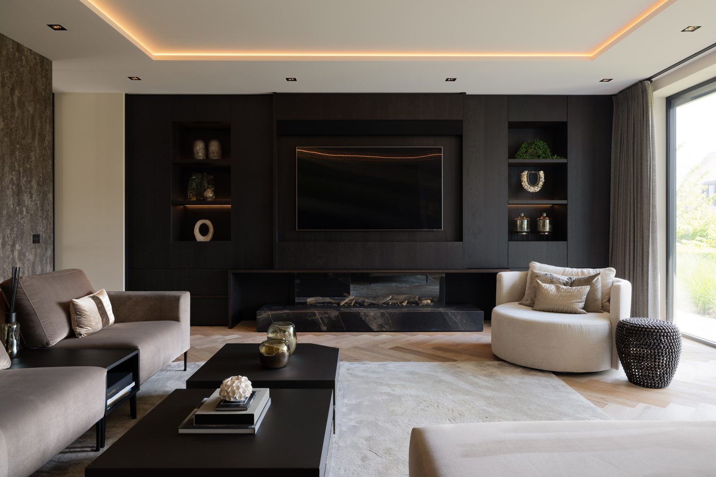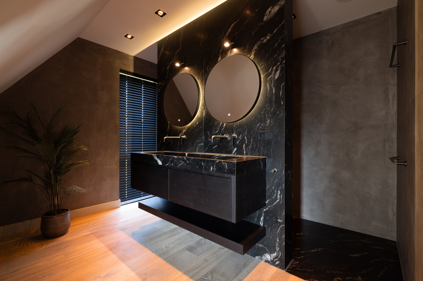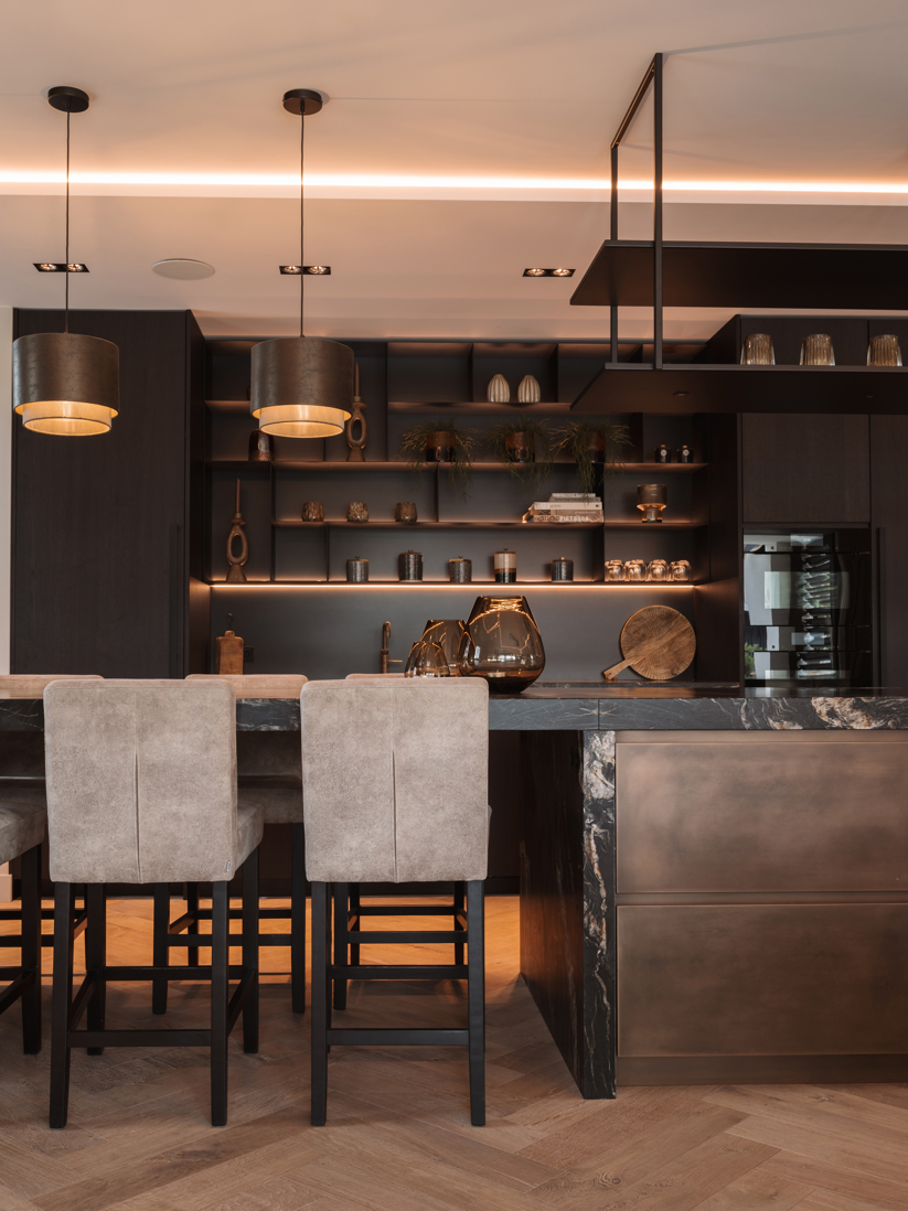 In dit project, gerealiseerd in samenwerking met Cazar Projectregie, komen luxe en maatwerk moeiteloos samen. De keuken in brons metaallak, donker eiken en natuursteen vormt het hart van de woning, met een stalen element boven het eiland en sfeervolle nissen voor koffie en wijn. De materialen lopen door in alle ruimtes, waardoor een harmonieus geheel ontstaat dat warmte en allure ademt.