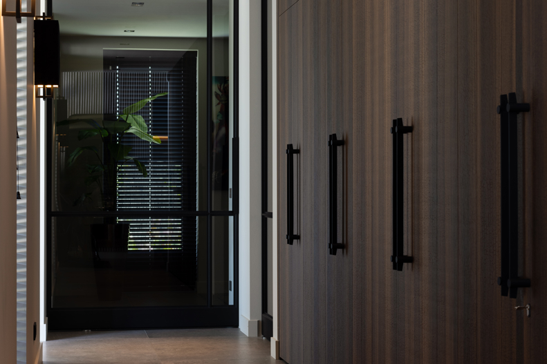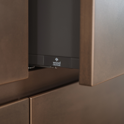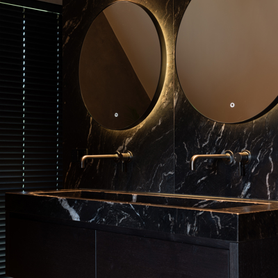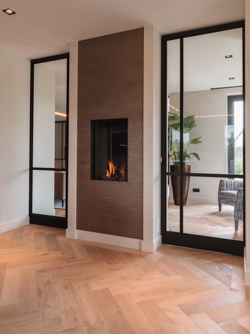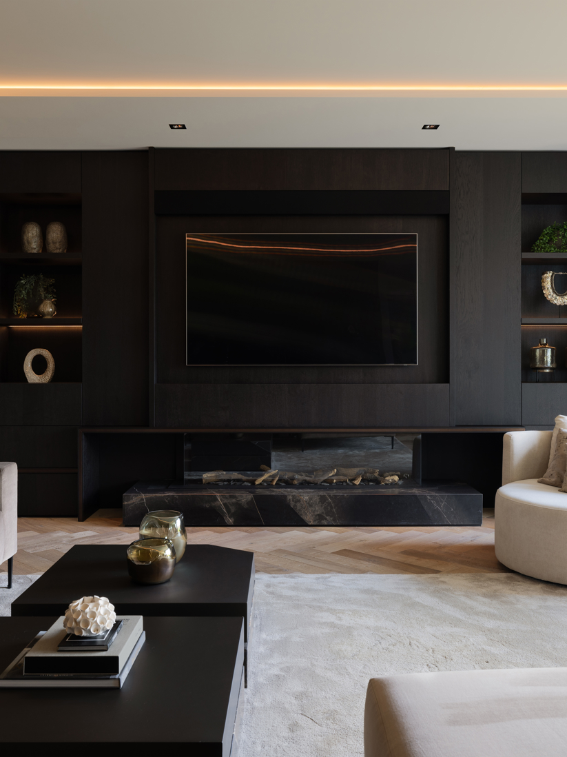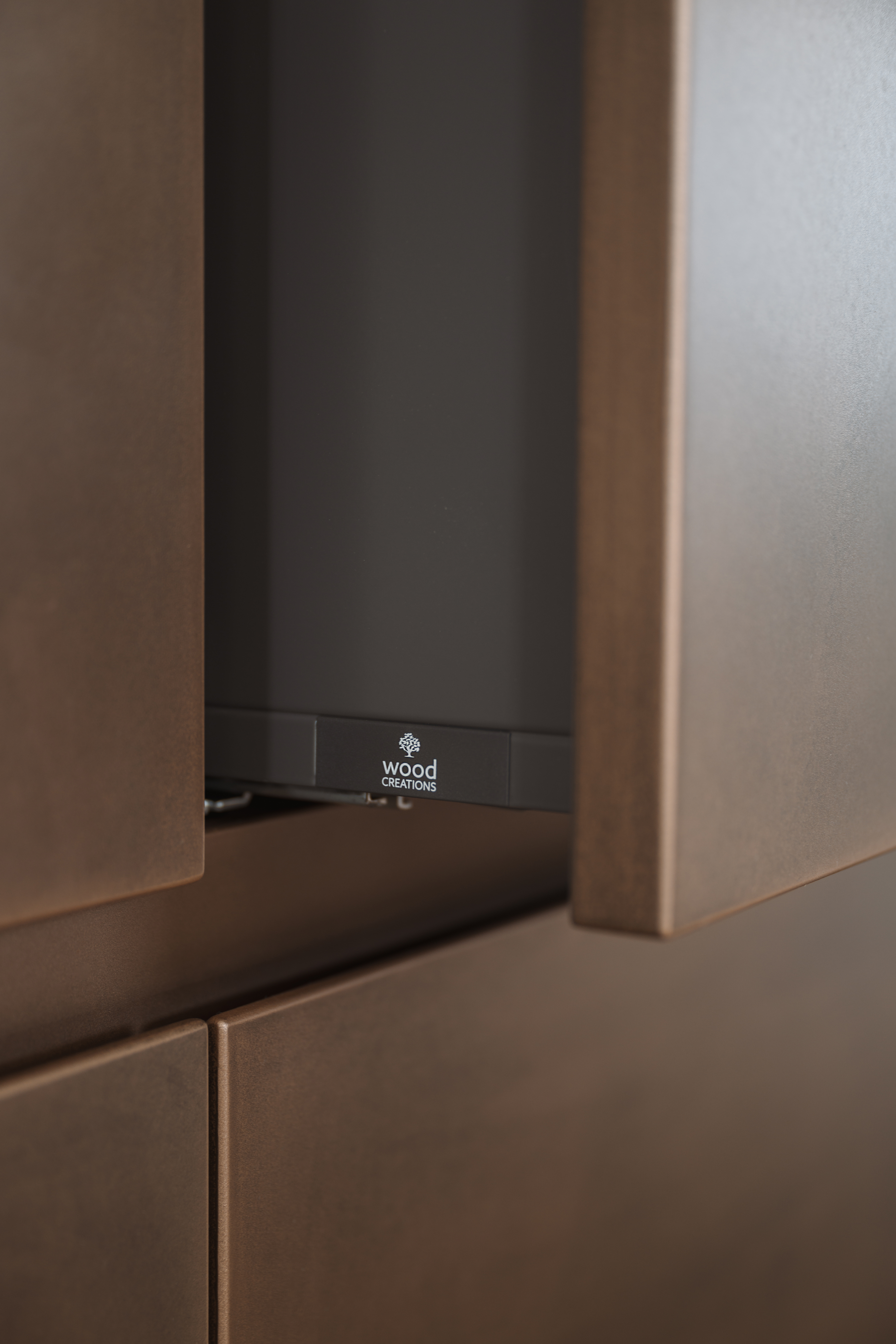 In dit project, gerealiseerd in samenwerking met Cazar Projectregie, komen luxe en maatwerk moeiteloos samen. De keuken in brons metaallak, donker eiken en natuursteen vormt het hart van de woning, met een stalen element boven het eiland en sfeervolle nissen voor koffie en wijn. De materialen lopen door in alle ruimtes, waardoor een harmonieus geheel ontstaat dat warmte en allure ademt.