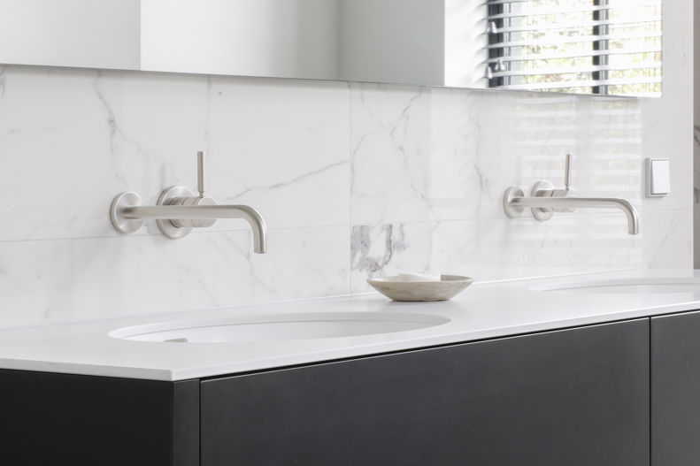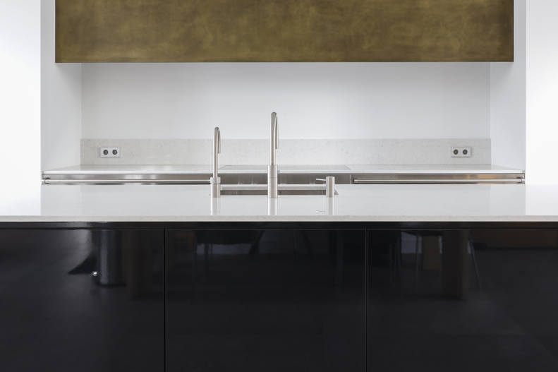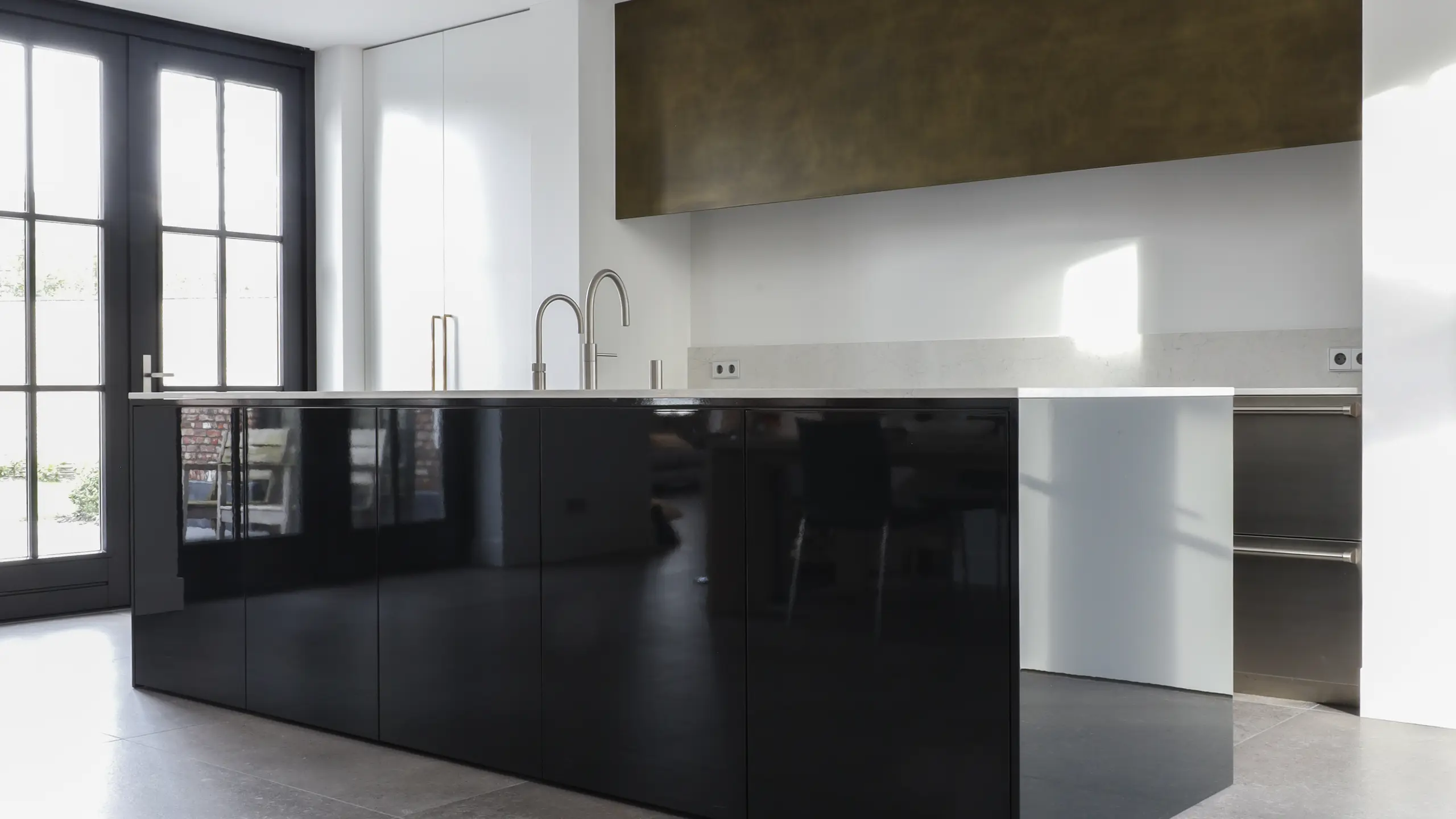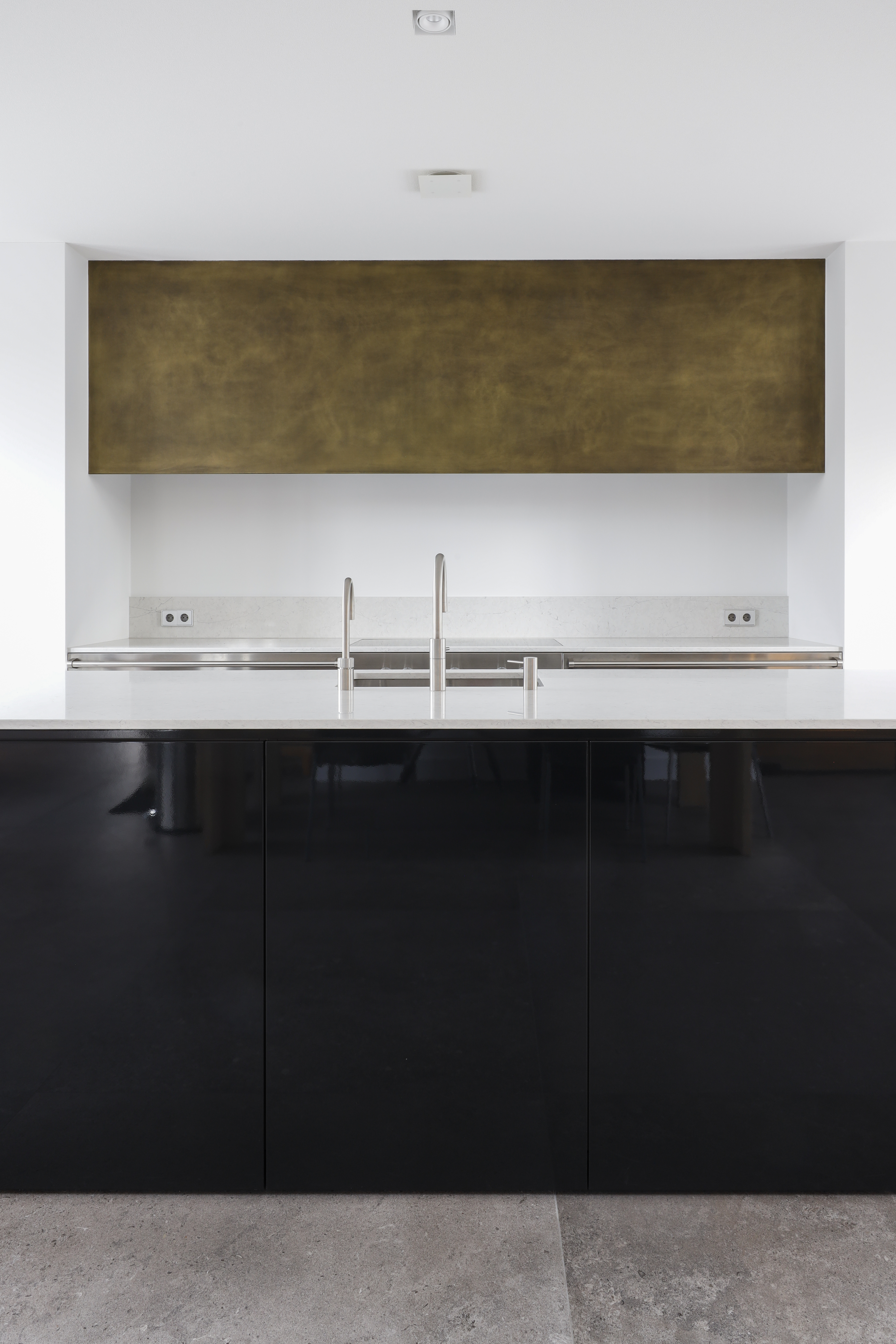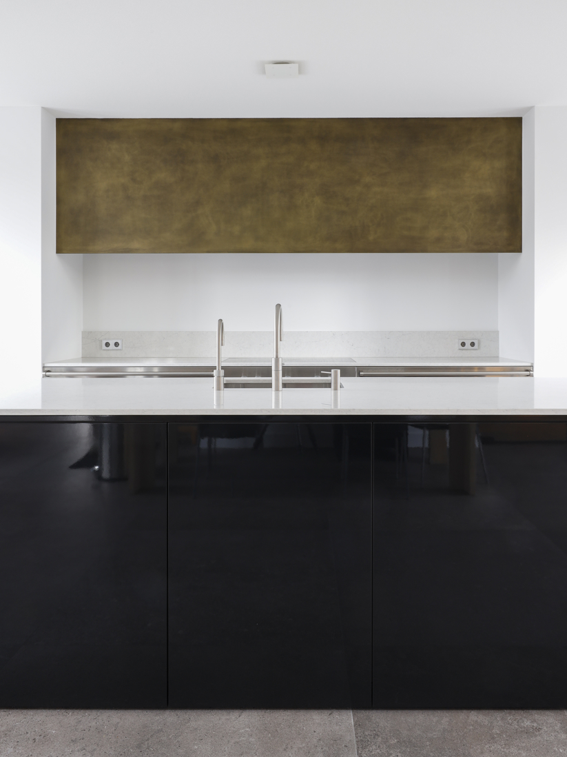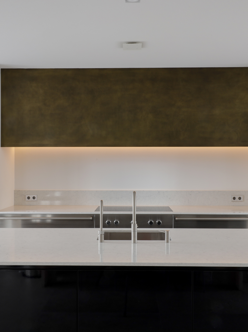 Voor dit project realiseerden we een interieur waarin moderne elegantie centraal staat. De hoogglans keuken vormt het hart van de woning en wordt versterkt door een verfijnd marmerlook werkblad en exclusieve bovenkasten in brons metaallak. Deze krachtige combinatie van materialen zorgt voor een luxe, maar tegelijkertijd strakke uitstraling. Het toiletmeubel en de badkamer zijn volledig in dezelfde stijl ontworpen, waardoor iedere ruimte perfect in balans is. Een woning waarin design, rust en eenheid samenkomen tot één stijlvol geheel.