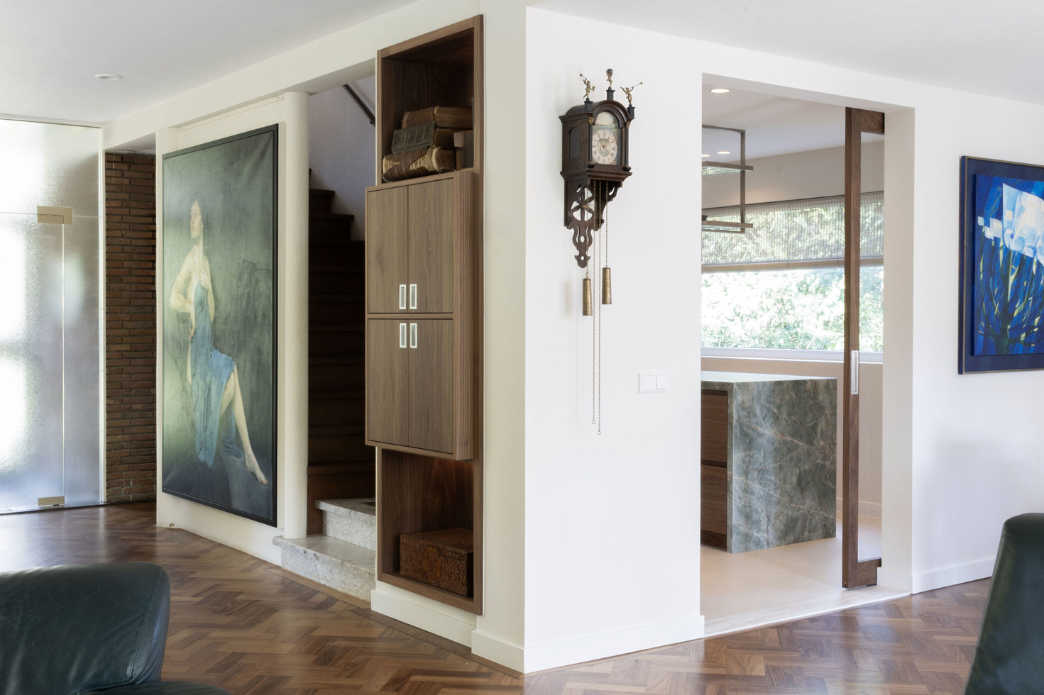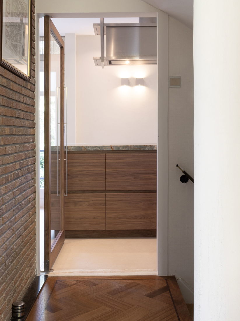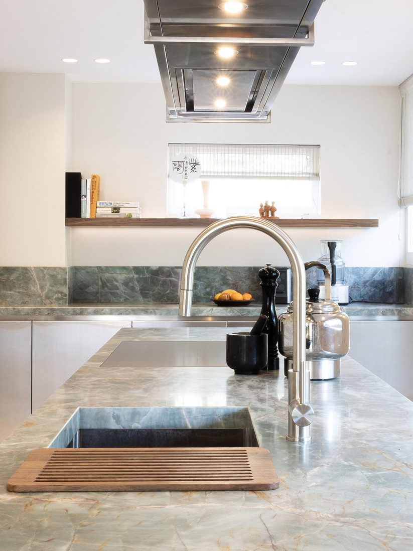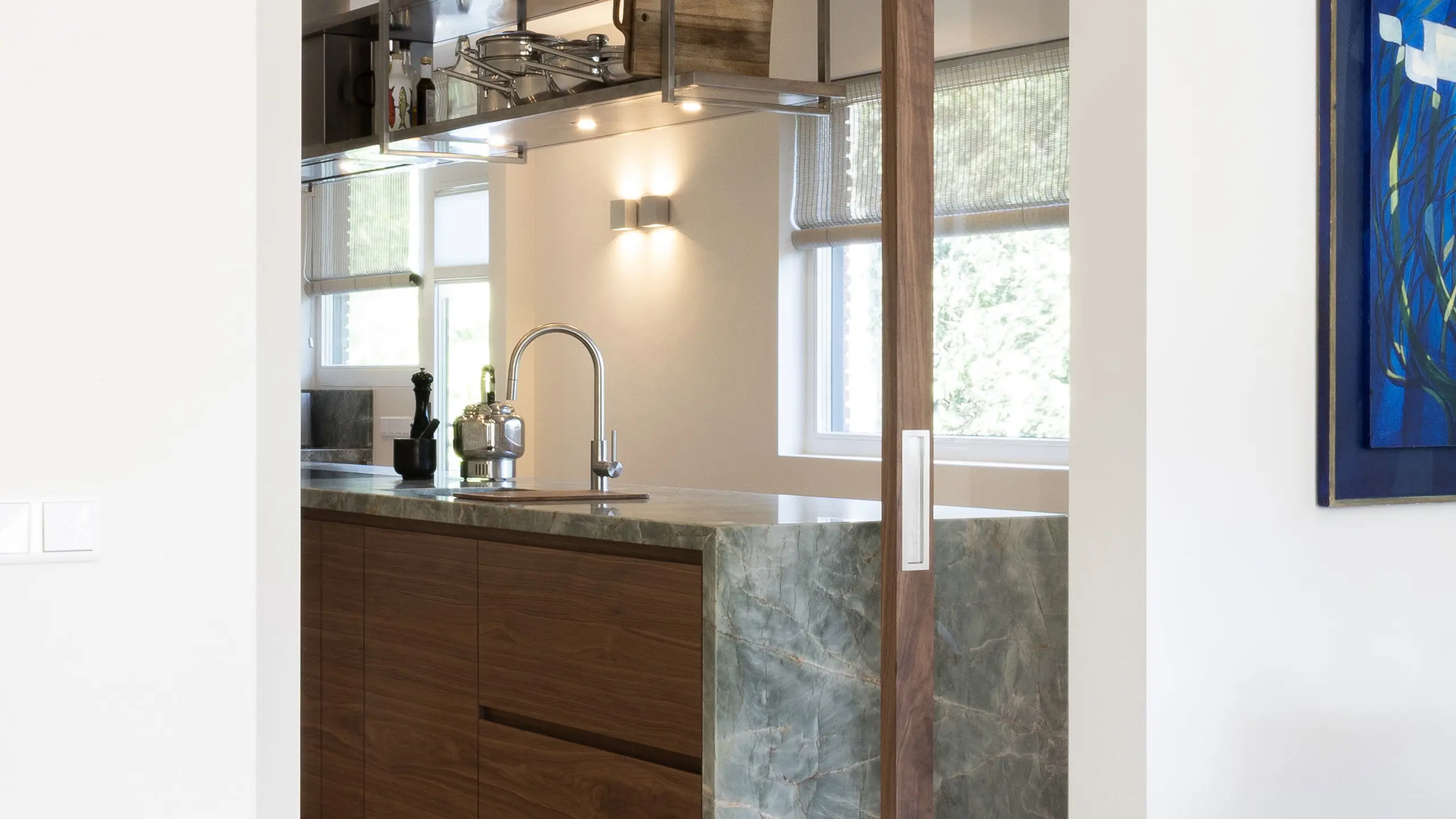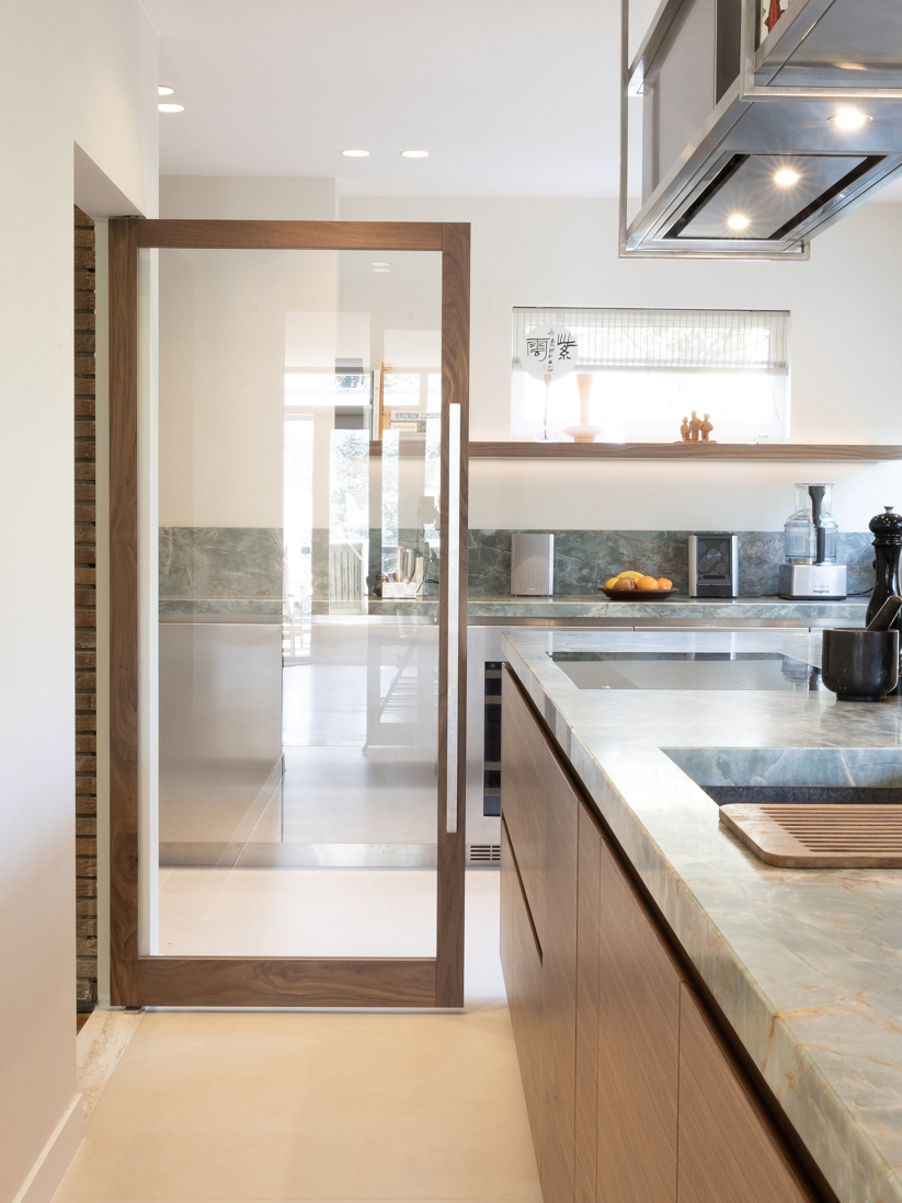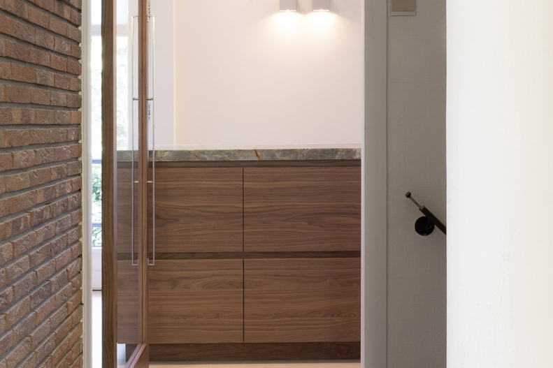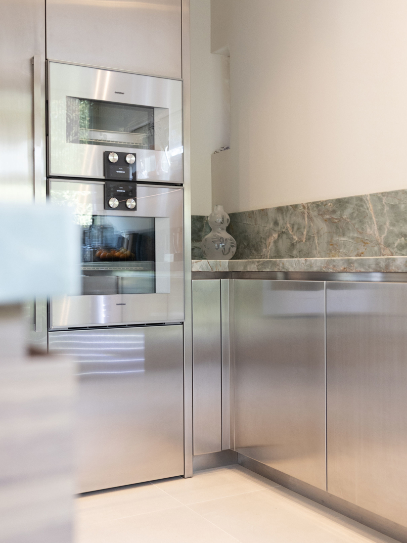 In een statige omgeving kreeg deze keuken een ziel die modern en tijdloos tegelijk is. Het warme notenhout, het gekleurde natuursteen en het koele RVS vloeien samen in een harmonieus geheel. De hoge deuren in hout en glas bewegen mee met de ruimte. Waar ooit een voorraadkast zat, ontstond nu een elegante nis die kunst laat spreken. Met details als het Wave-plafondrek en verfijnde Gaggenau-apparatuur is dit interieur niet alleen functioneel, maar vooral een verhaal van aandacht, schoonheid en maatwerk.