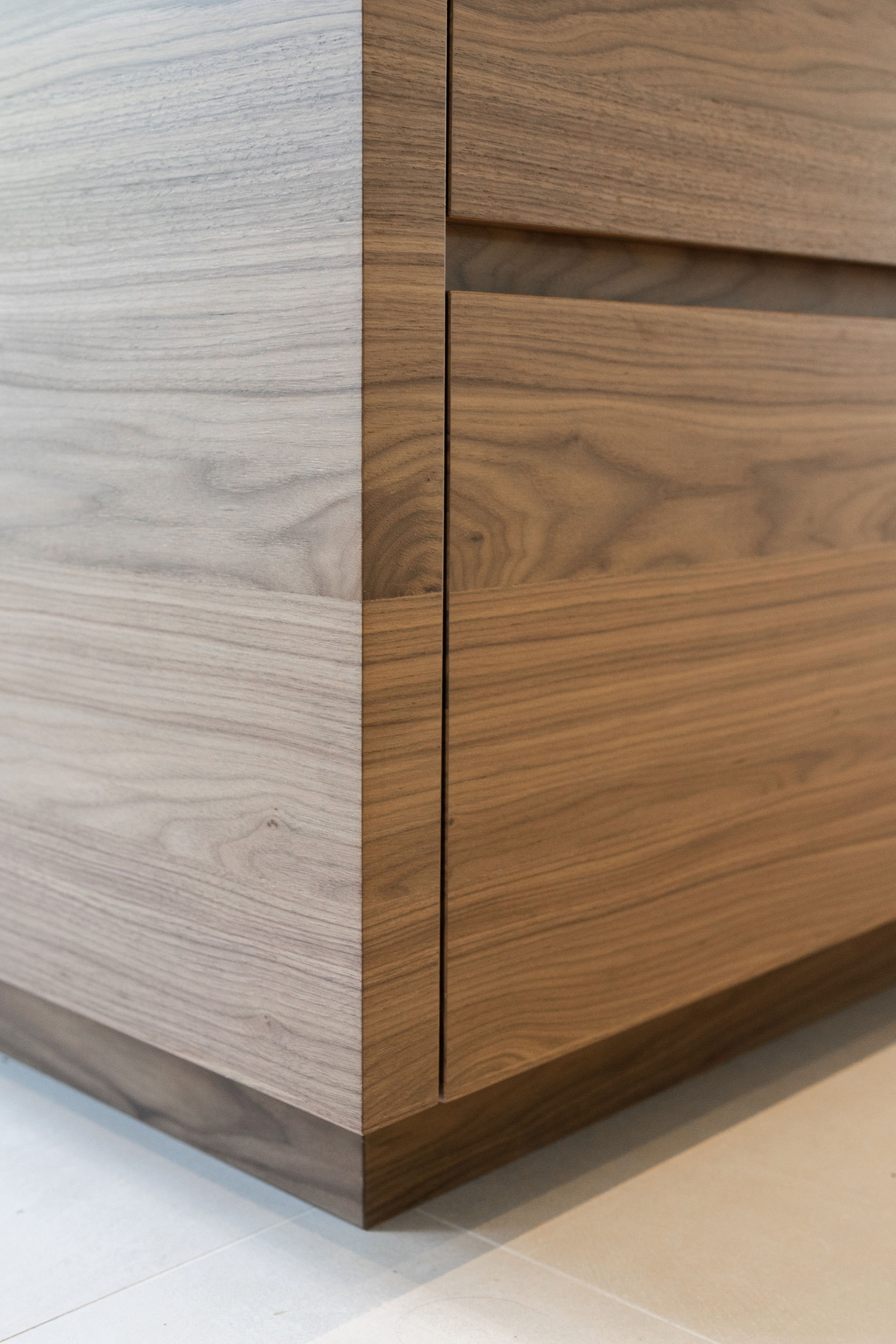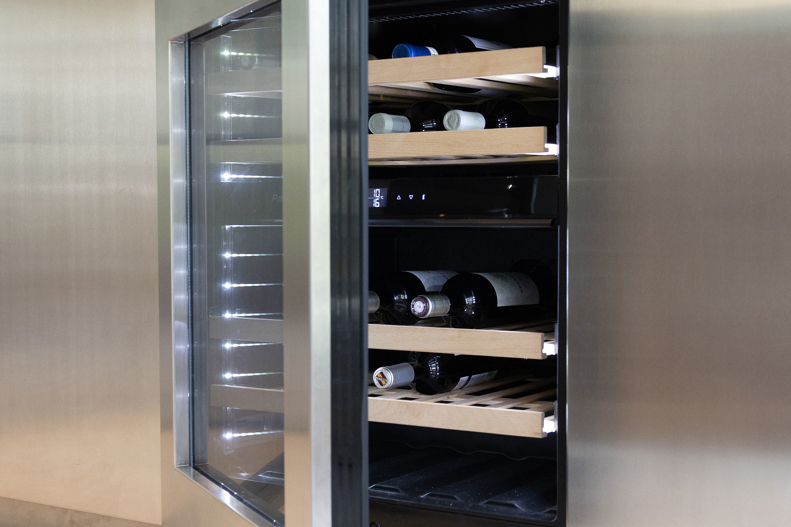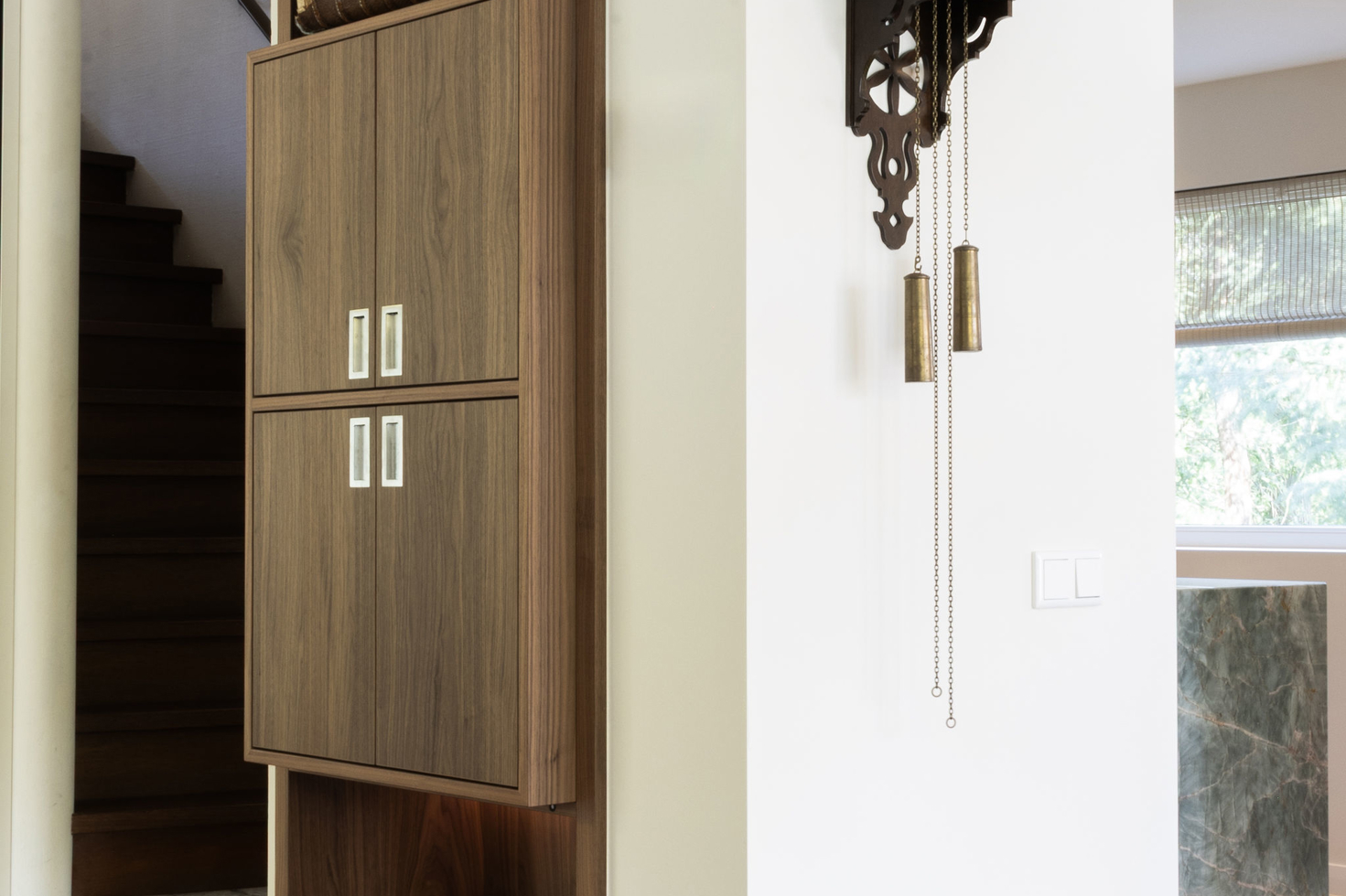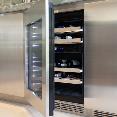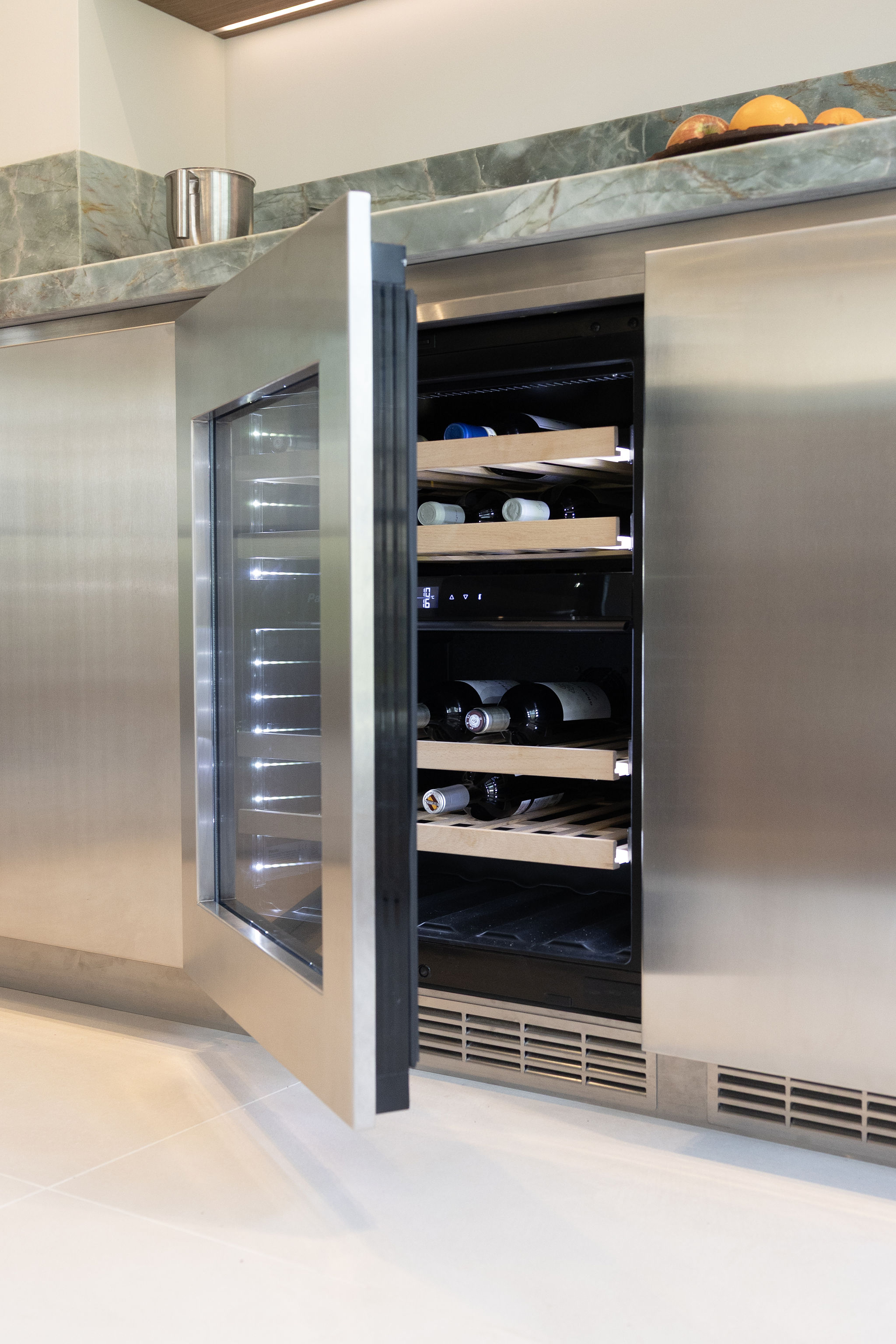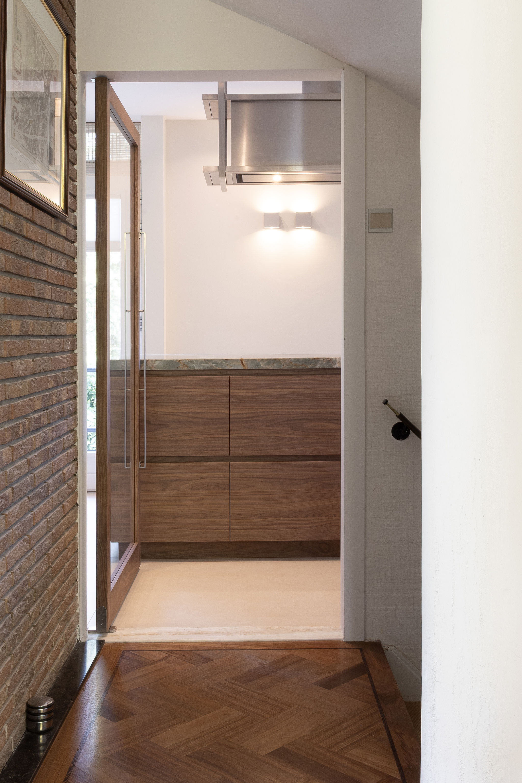 In een statige omgeving kreeg deze keuken een ziel die modern en tijdloos tegelijk is. Het warme notenhout, het gekleurde natuursteen en het koele RVS vloeien samen in een harmonieus geheel. De hoge deuren in hout en glas bewegen mee met de ruimte. Waar ooit een voorraadkast zat, ontstond nu een elegante nis die kunst laat spreken. Met details als het Wave-plafondrek en verfijnde Gaggenau-apparatuur is dit interieur niet alleen functioneel, maar vooral een verhaal van aandacht, schoonheid en maatwerk.