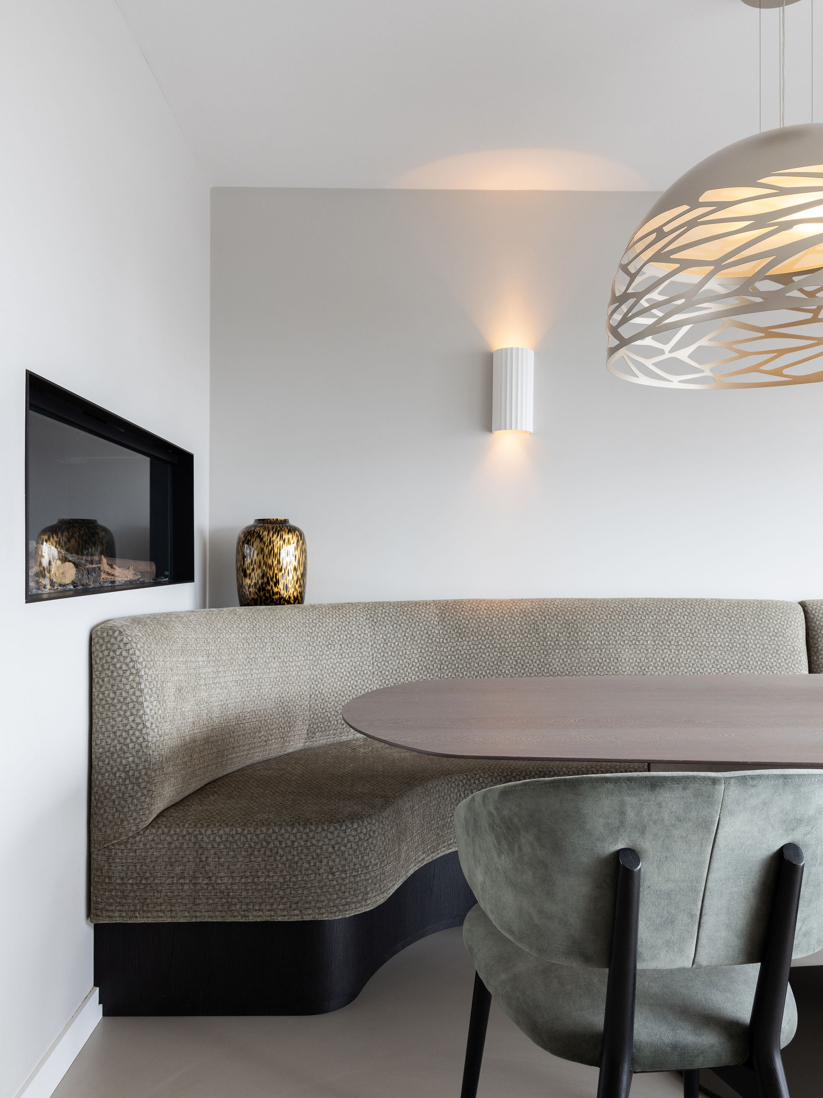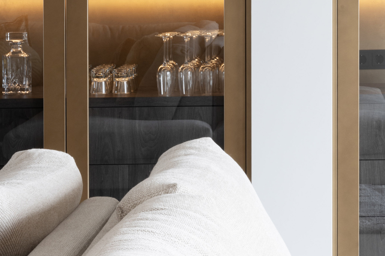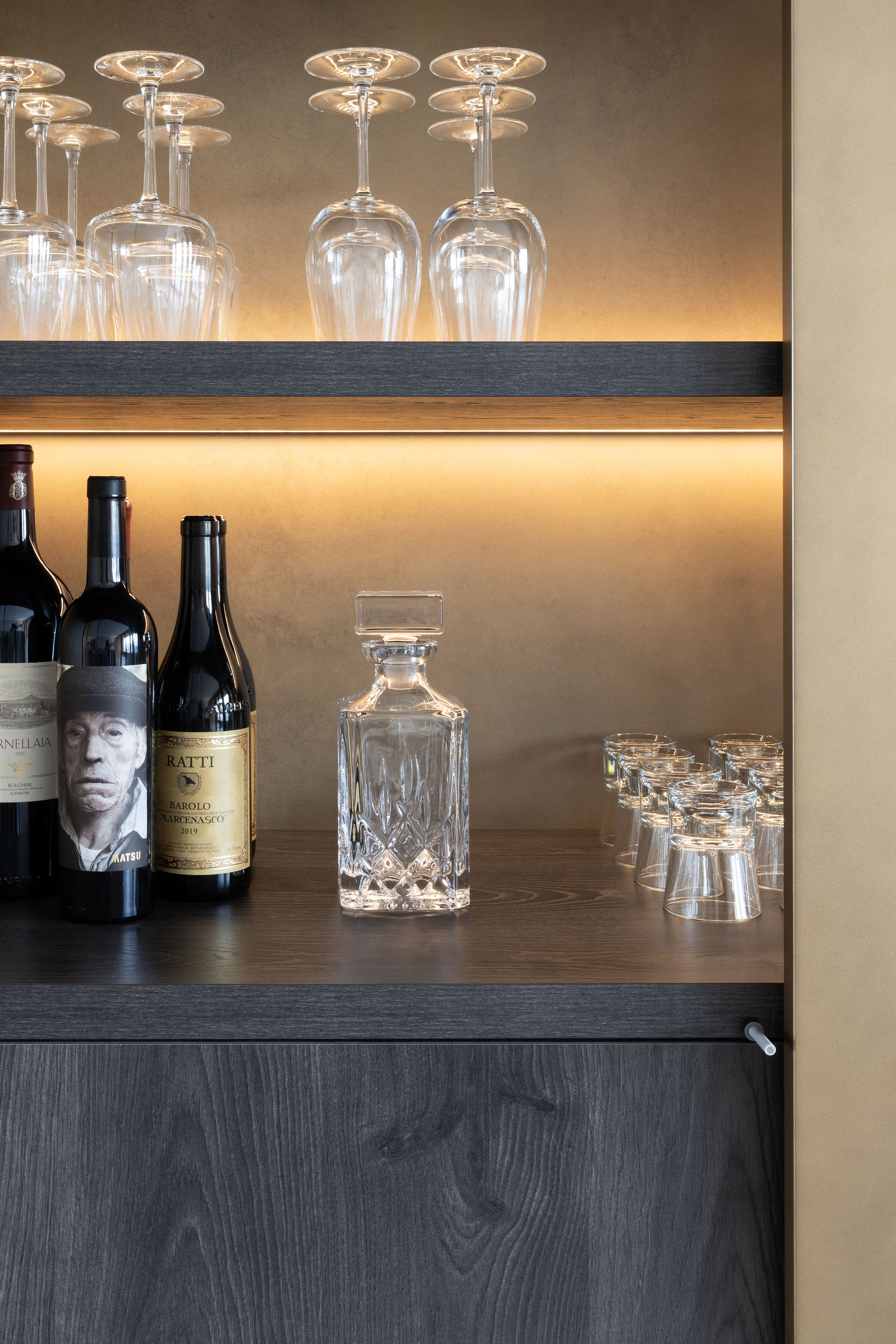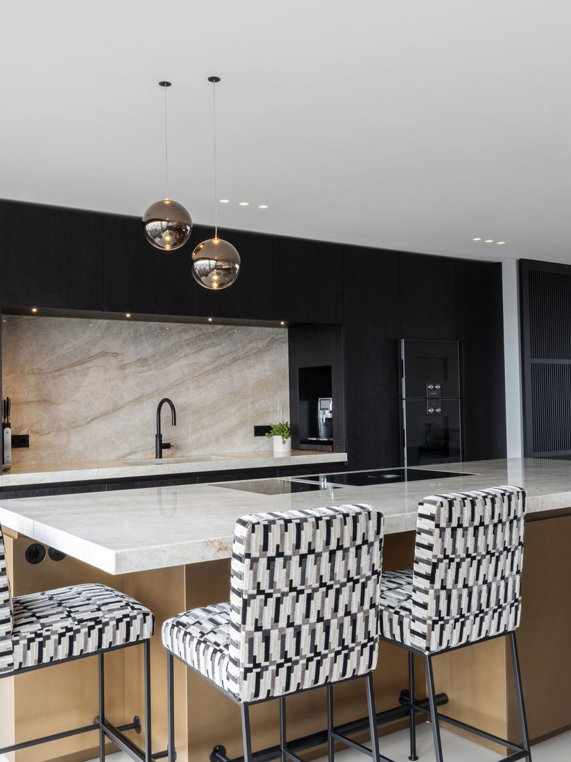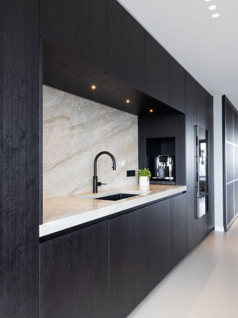 De keuken, een meesterwerk op maat, is vervaardigd in eikenhout Old Black en voorzien van brons gepatineerde metaallak. Onze exclusieve grepen voegen een uniek tintje toe. Het keukenblad en de achterwand in Taj Mahal kwartstiet gezoet zorgen voor een stijlvolle basis en een subtiele glans. De stoere apparatuur van Gagganau maakt de keuken compleet.