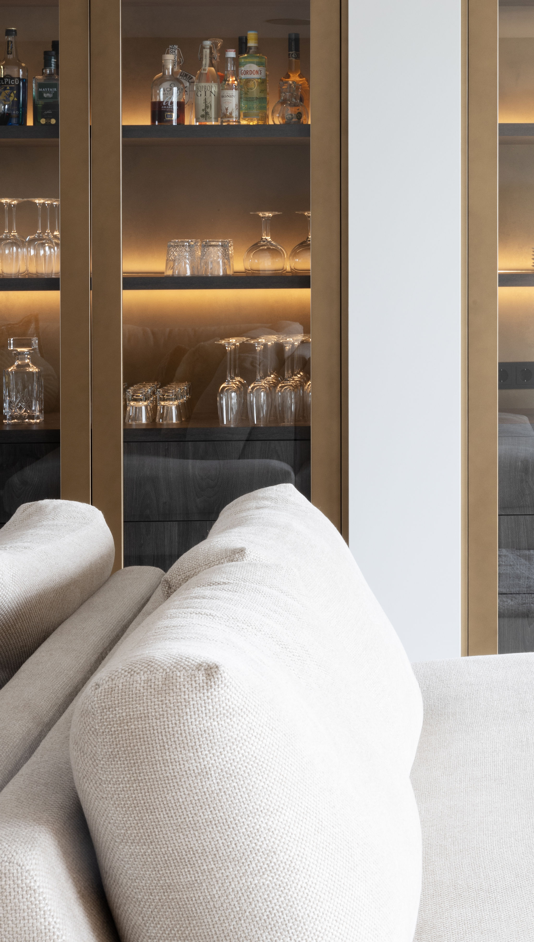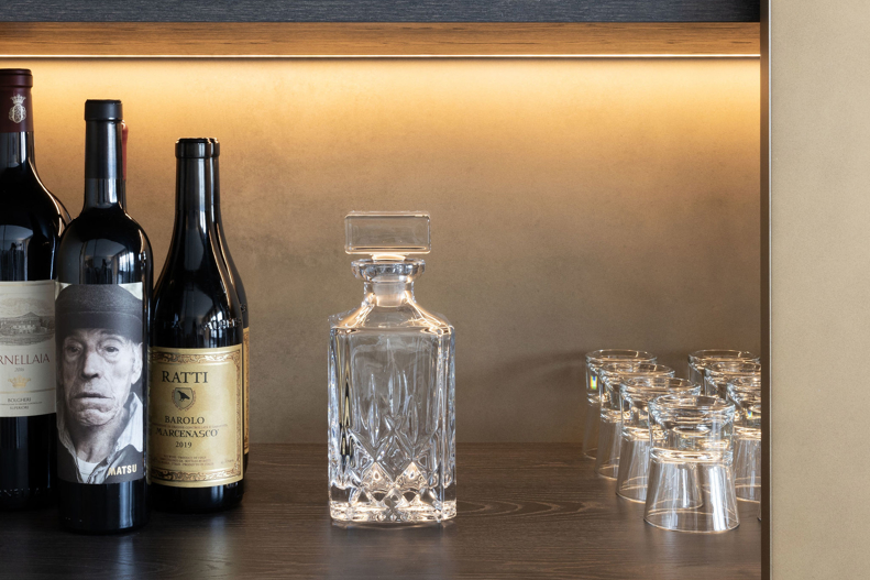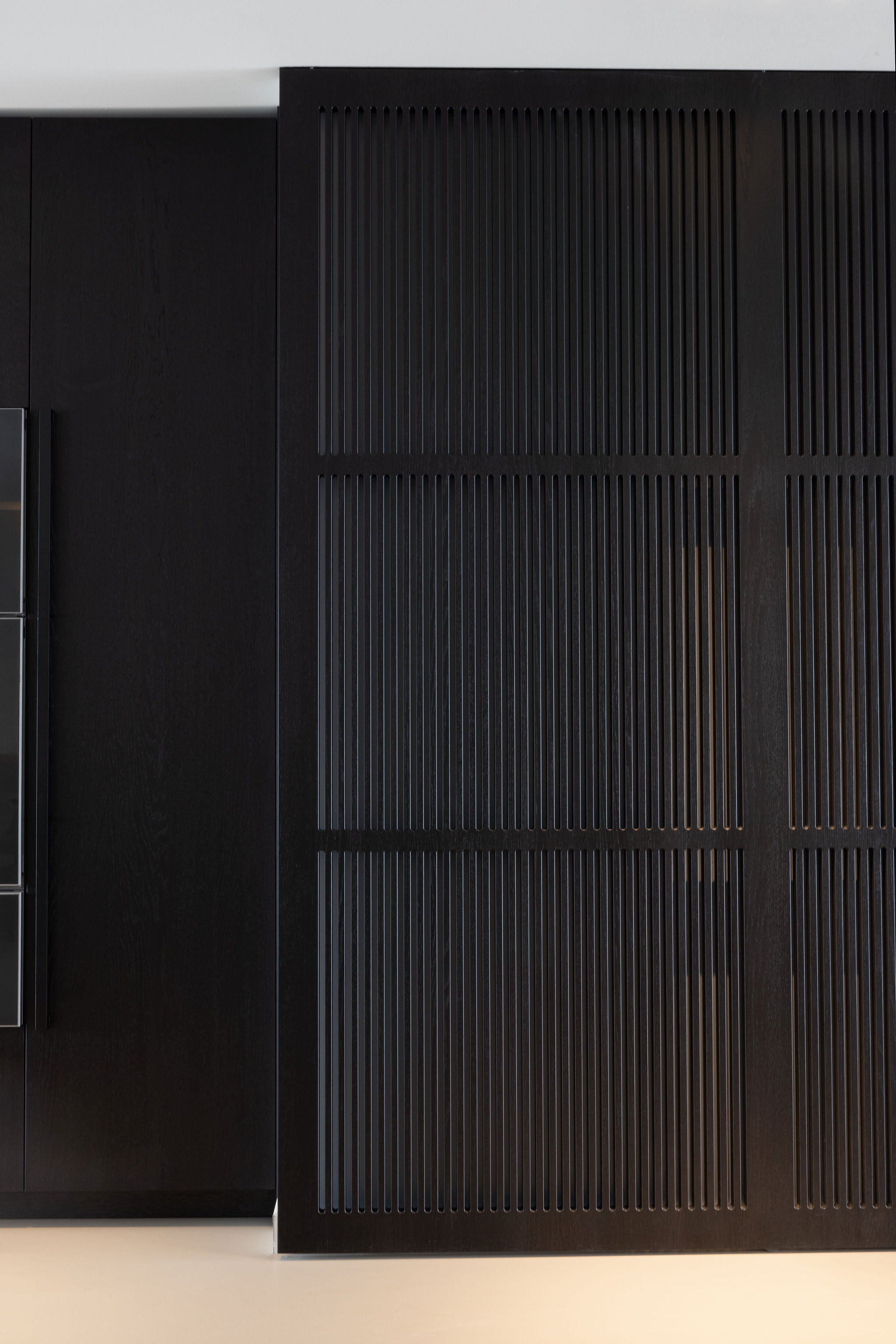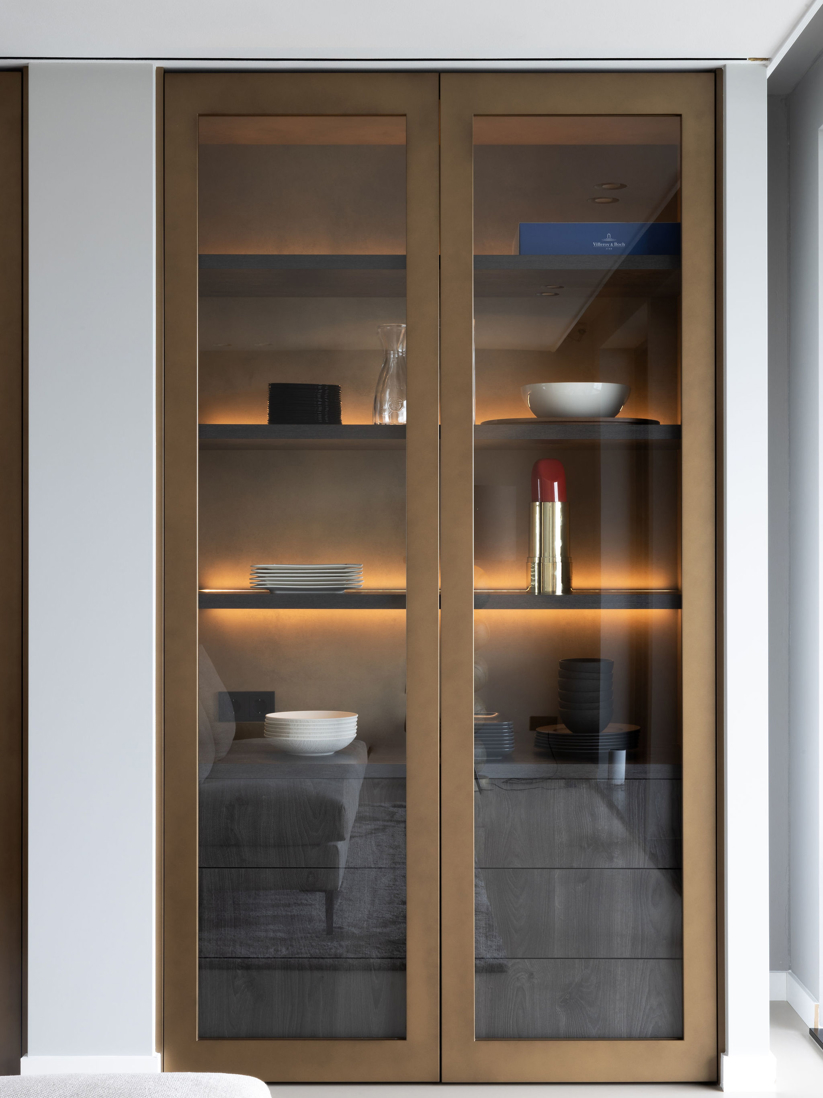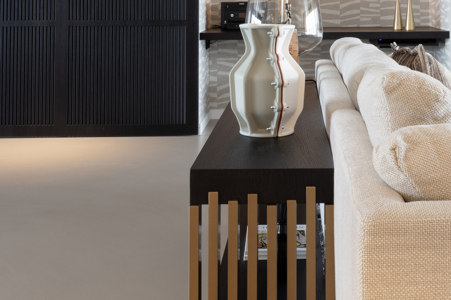 De keuken, een meesterwerk op maat, is vervaardigd in eikenhout Old Black en voorzien van brons gepatineerde metaallak. Onze exclusieve grepen voegen een uniek tintje toe. Het keukenblad en de achterwand in Taj Mahal kwartstiet gezoet zorgen voor een stijlvolle basis en een subtiele glans. De stoere apparatuur van Gagganau maakt de keuken compleet.