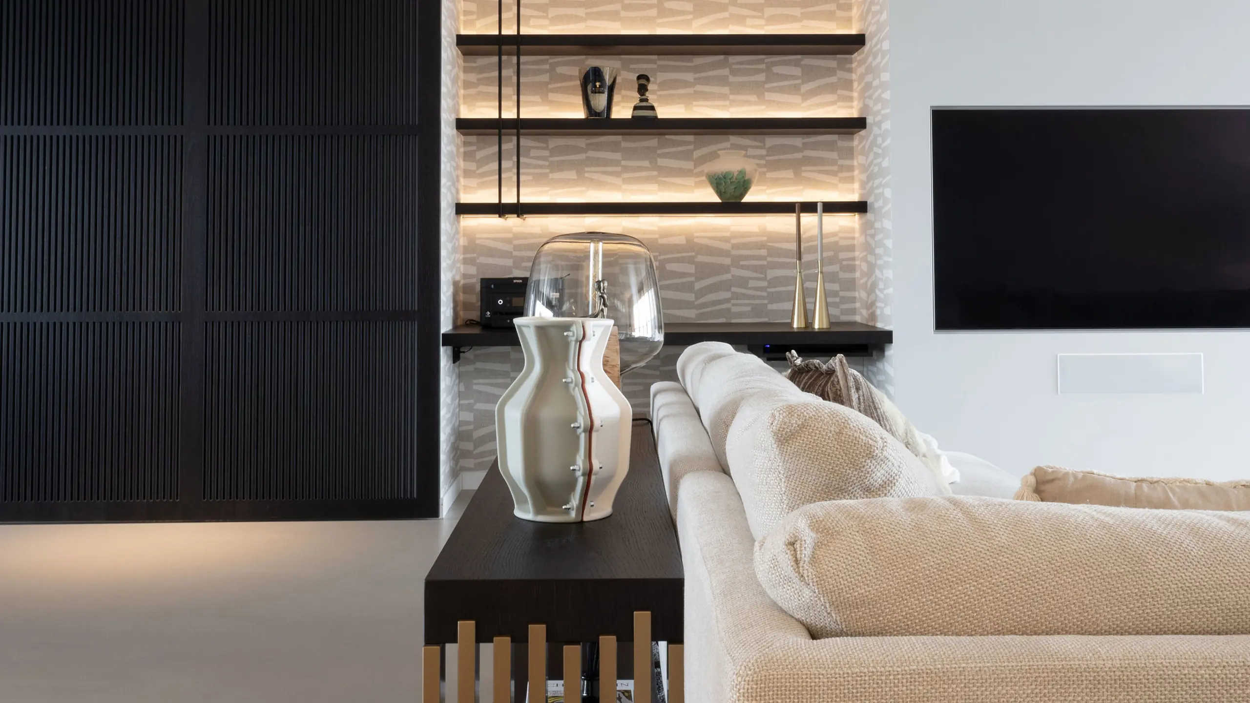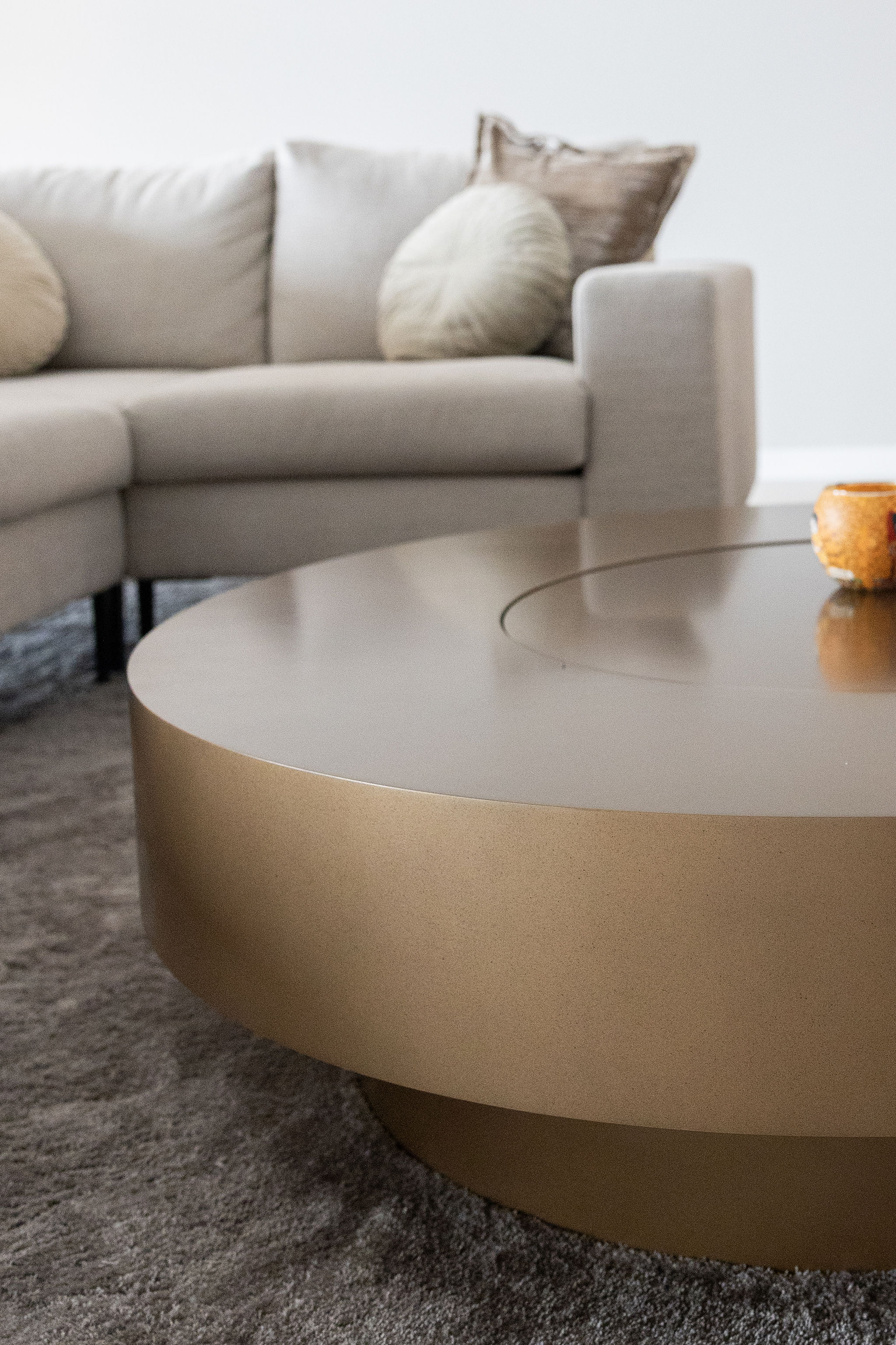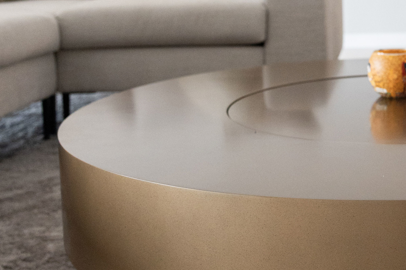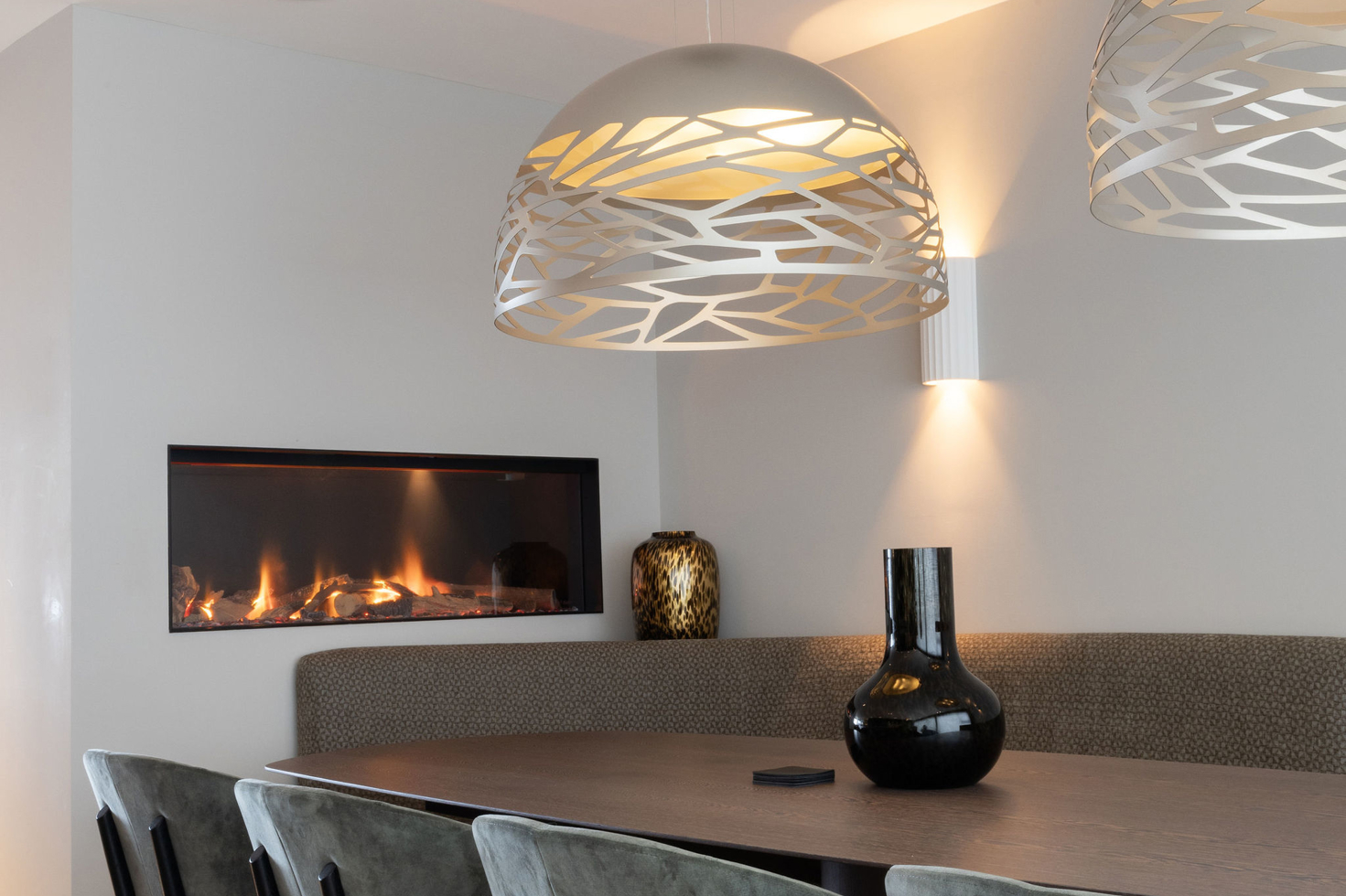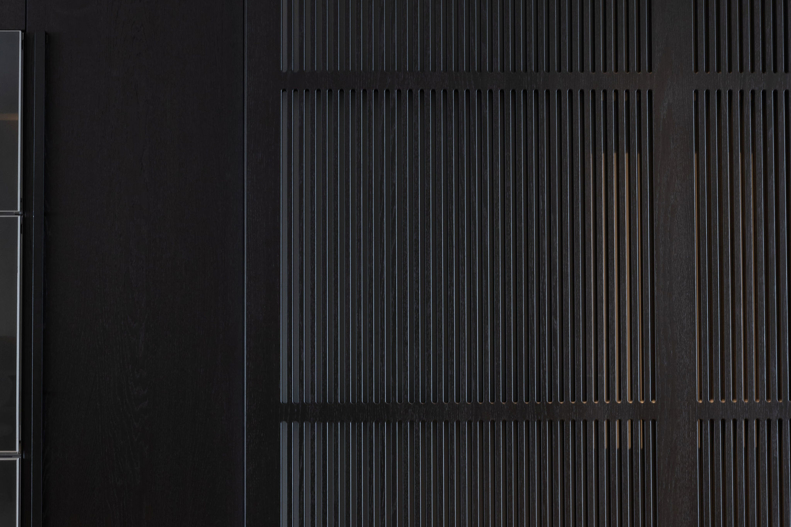 De keuken, een meesterwerk op maat, is vervaardigd in eikenhout Old Black en voorzien van brons gepatineerde metaallak. Onze exclusieve grepen voegen een uniek tintje toe. Het keukenblad en de achterwand in Taj Mahal kwartstiet gezoet zorgen voor een stijlvolle basis en een subtiele glans. De stoere apparatuur van Gagganau maakt de keuken compleet.