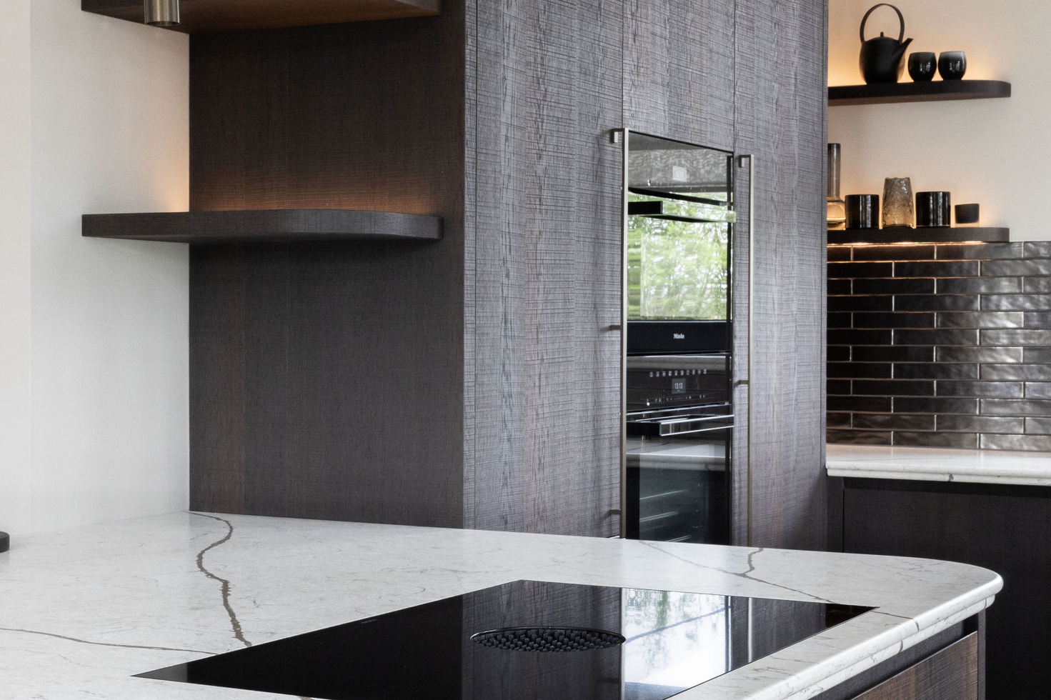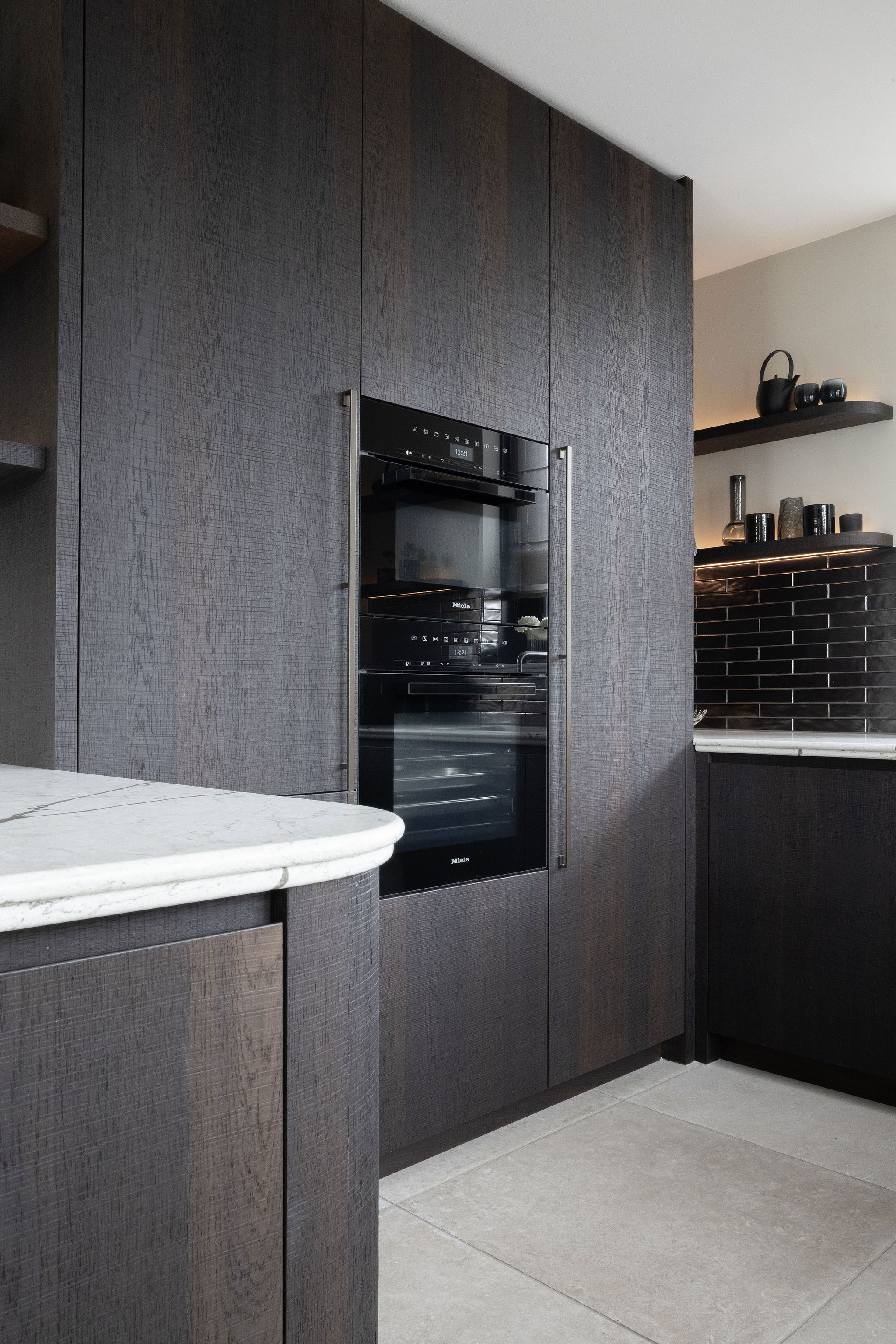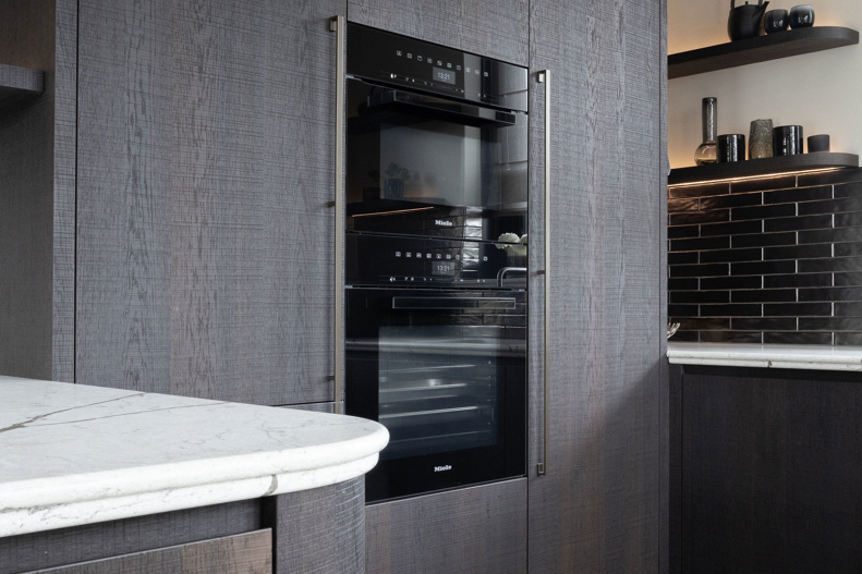 Ook de keuken ademt deze verfijning: ronde vormen in blad en hoeken zorgen voor zachtheid, terwijl diep gerookt eiken fineer en een natuursteen-look blad een robuuste basis vormen. Met topapparatuur van Miele, een Bora kookplaat en een Quooker in RVS krijgt de keuken een luxe en eigentijdse uitstraling.