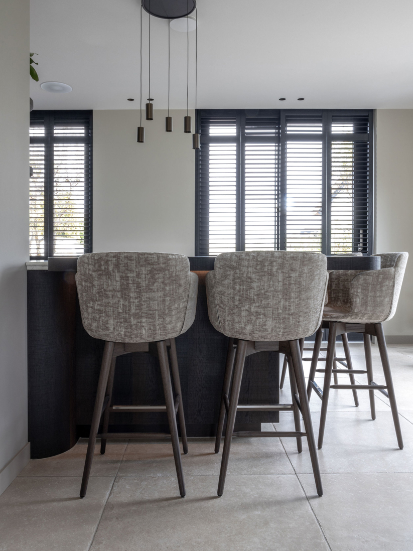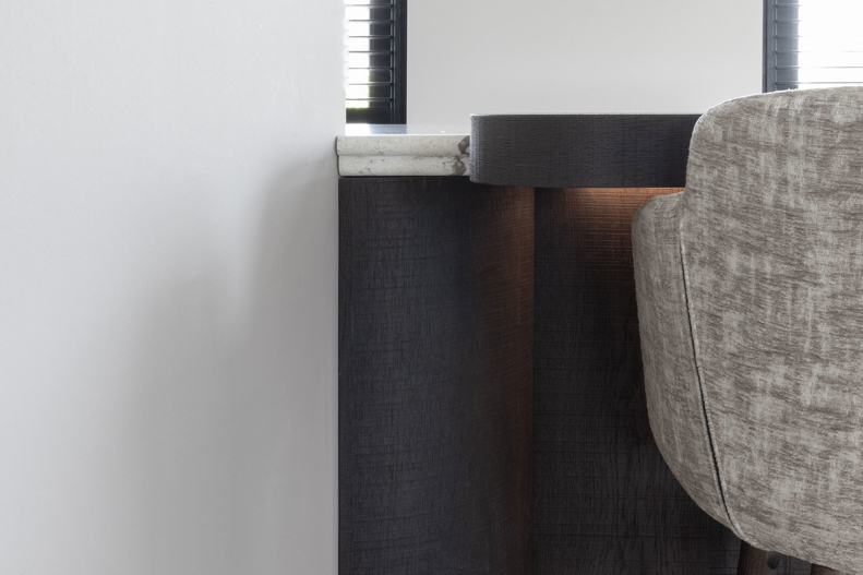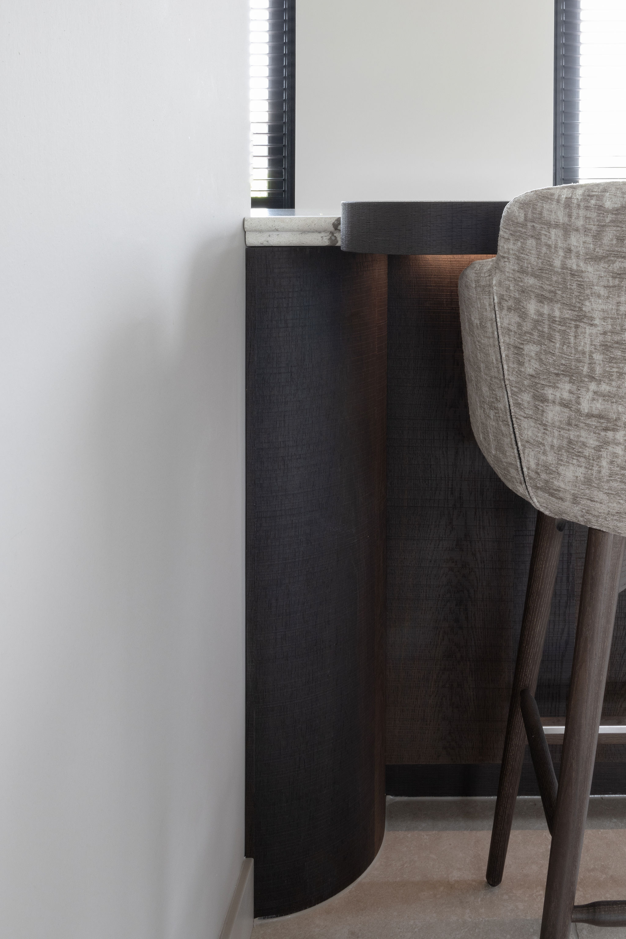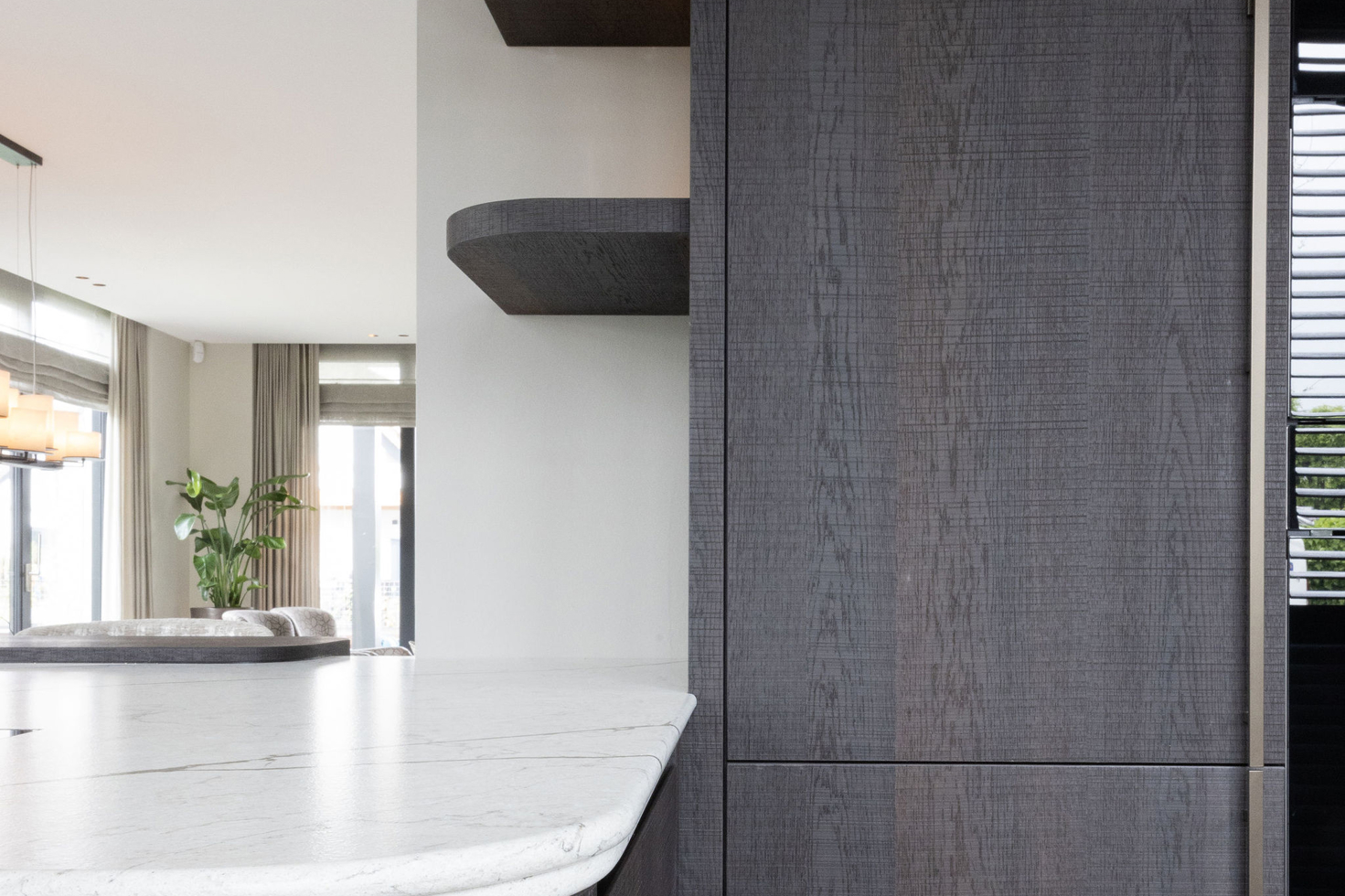 Ook de keuken ademt deze verfijning: ronde vormen in blad en hoeken zorgen voor zachtheid, terwijl diep gerookt eiken fineer en een natuursteen-look blad een robuuste basis vormen. Met topapparatuur van Miele, een Bora kookplaat en een Quooker in RVS krijgt de keuken een luxe en eigentijdse uitstraling.