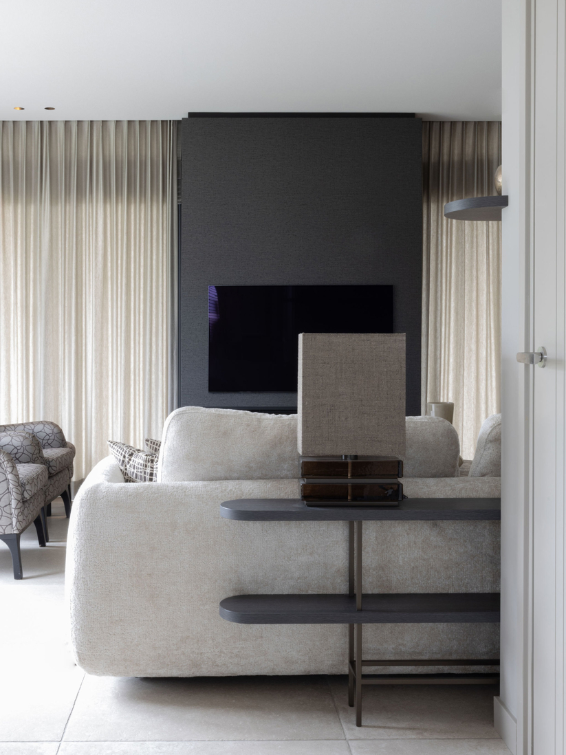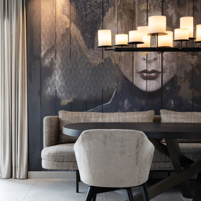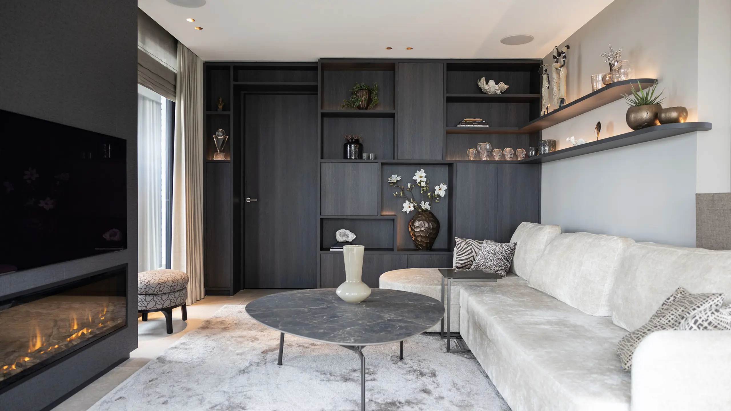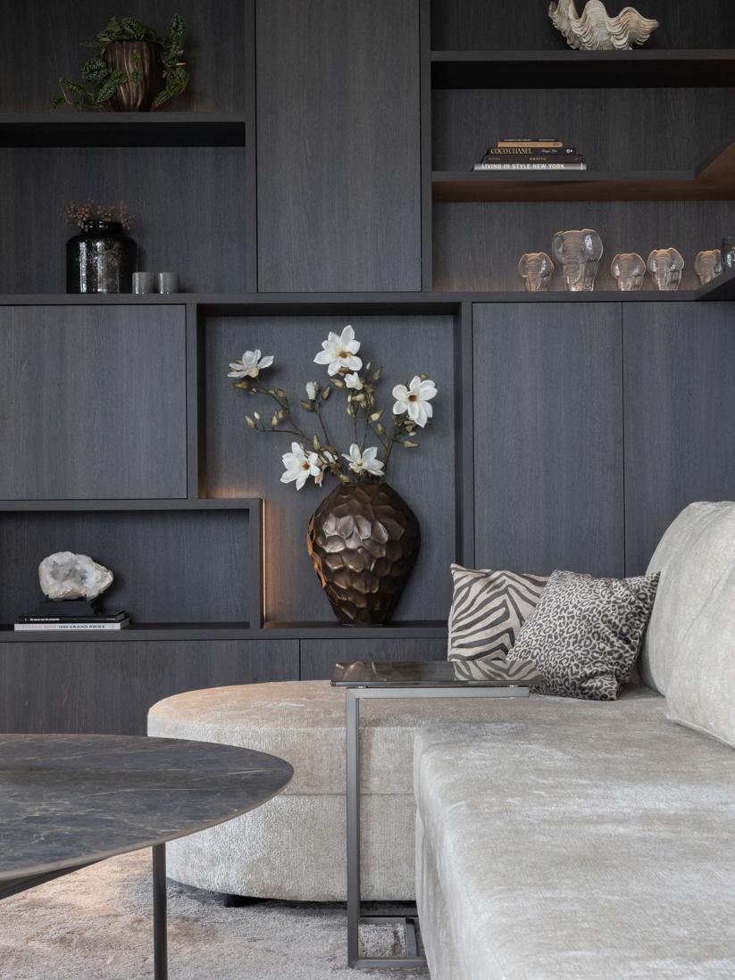 Dit interieur brengt warmte, luxe en harmonie samen. In de zithoek zorgt een maatwerk wandmeubel voor sfeer, opbergruimte en een subtiele gloed door geïntegreerde LED-verlichting. De deur naar de bijkeuken is onopvallend verwerkt, terwijl de tv-koof met elektrische haard gezelligheid en ruimte voor een geluidssysteem toevoegt.