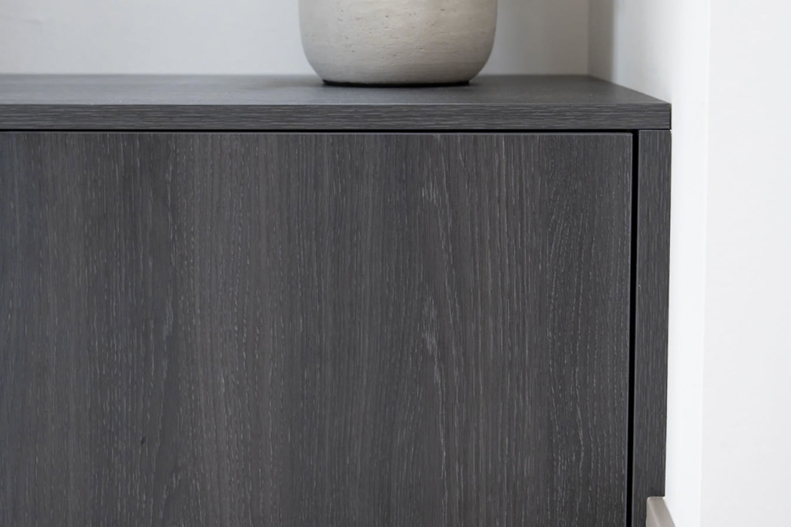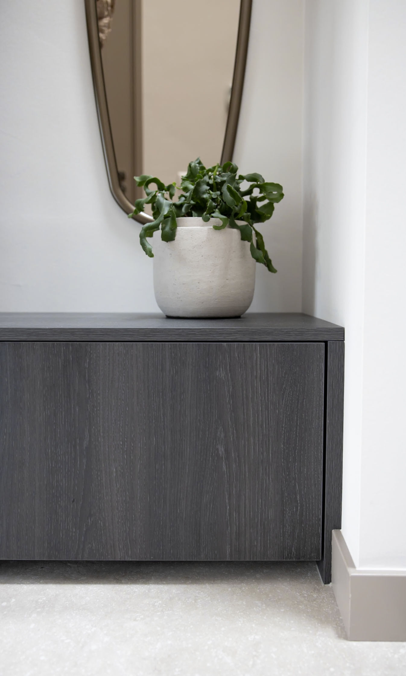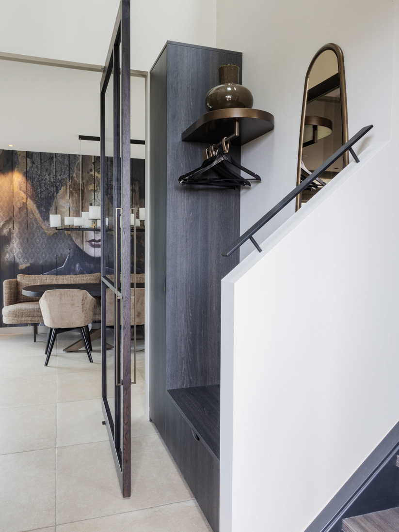 De ronde accenten keren terug in de garderobe, uitgevoerd in hetzelfde materiaal als de woonkamerkast, en worden versterkt door een zelf ontworpen spiegel. Blikvanger is de grote taatsdeur THIJS van donker gebeitst eikenhout en getint glas, met onze maatwerk greep JONA – functioneel én een statement.