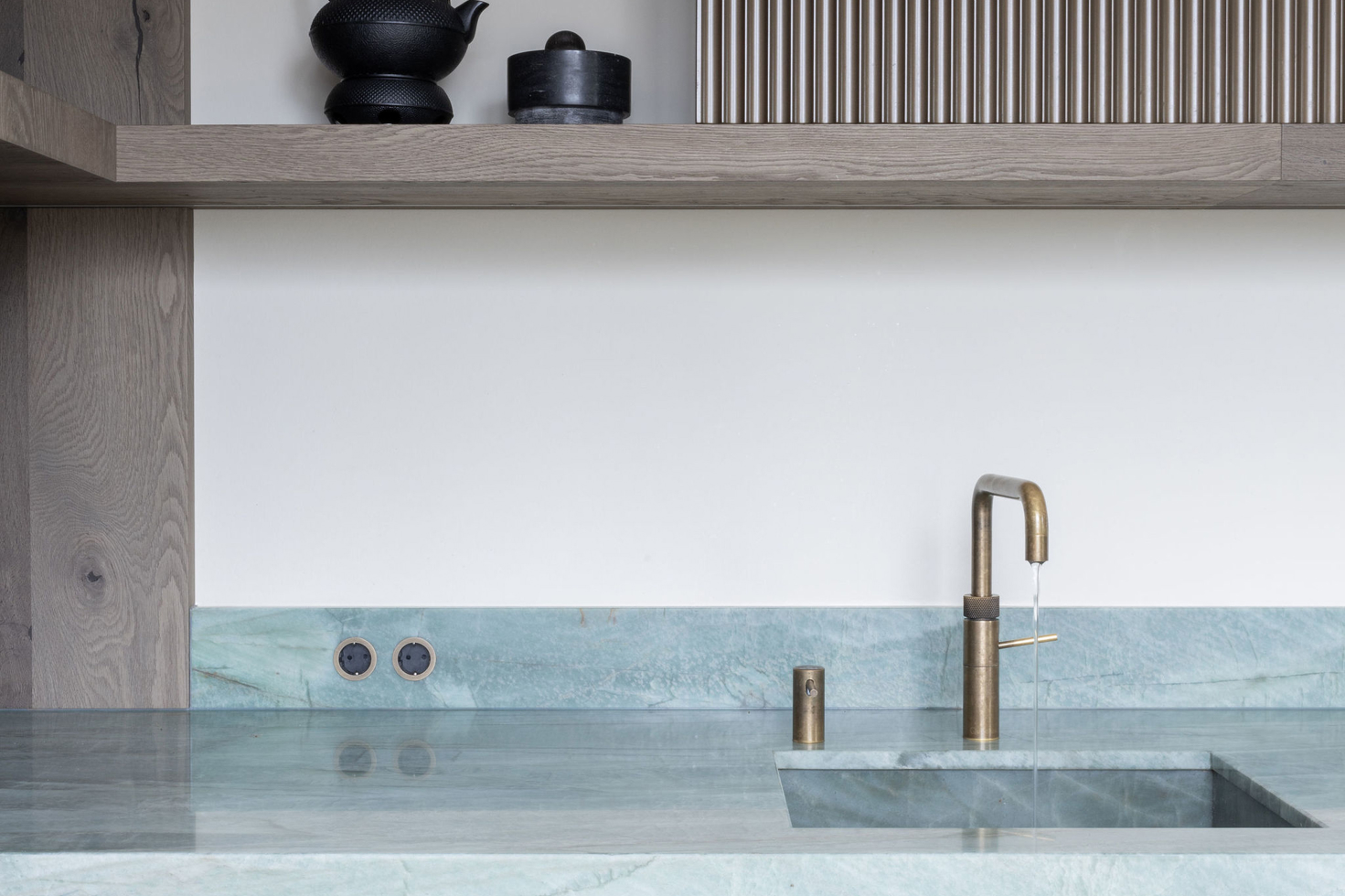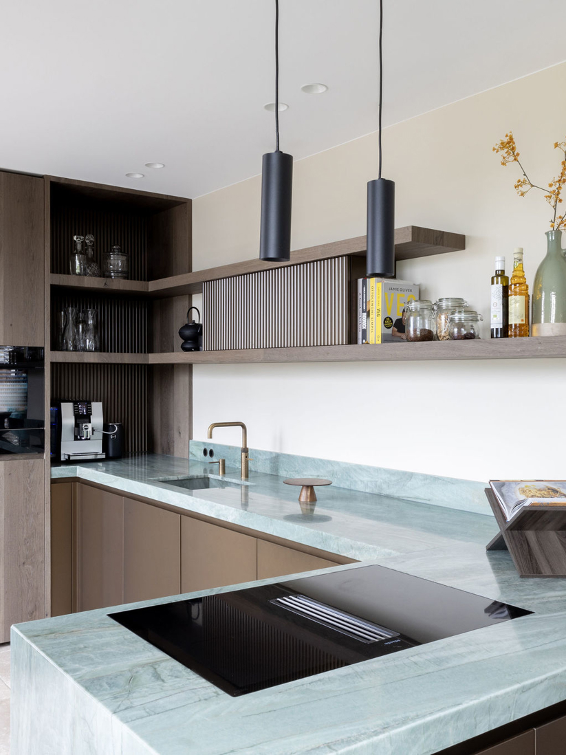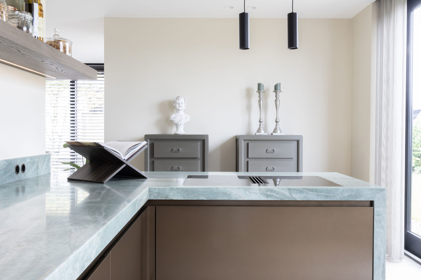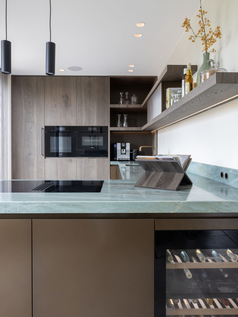 De keuken vormt een spannend contrast met een gedurfde combinatie van bronze metalcoating, luxe natuursteen Jadore en warm eikenhout. Deze mix van materialen geeft de ruimte een eigentijdse, maar toch tijdloze allure. De bijzondere eindafwerking van het eiland zorgt voor een vloeiende overgang naar het interieur eromheen. Met hoogwaardige Miele ovens en kookplaat, ruime Liebherr koeling en een Quooker in gepatineerd messing is de keuken niet alleen een lust voor het oog, maar ook uiterst functioneel