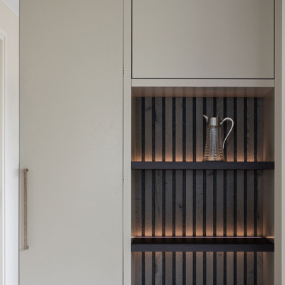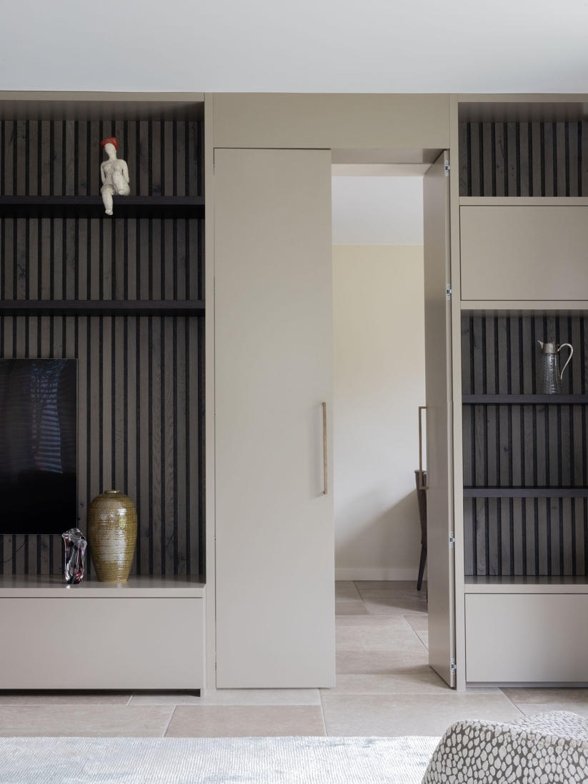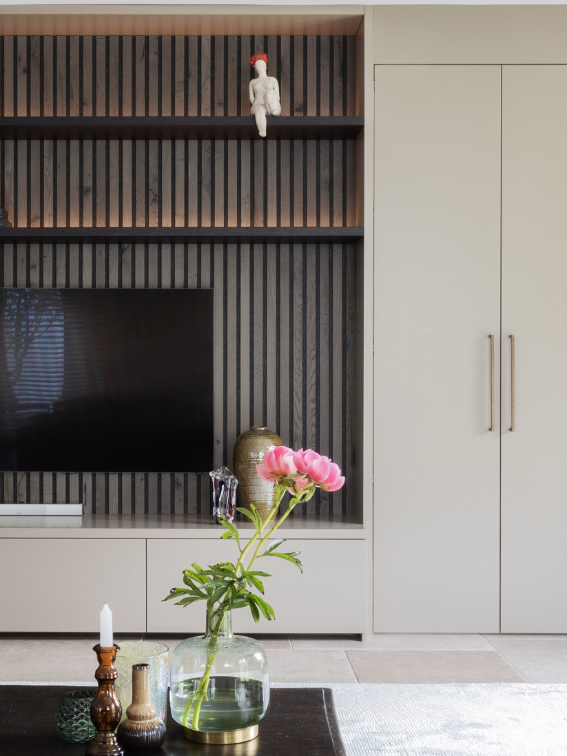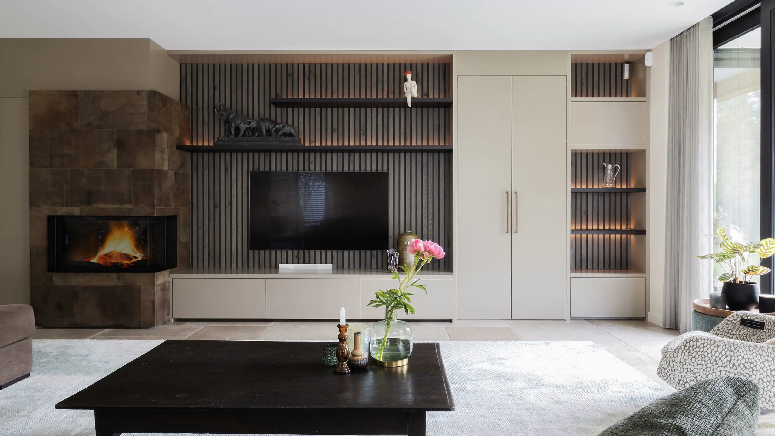In dit interieur gaan warmte en karakter hand in hand. Het wandmeubel in de woonkamer, uitgevoerd in eikenfineer, lakwerk en Alphenberg leder, krijgt extra diepte door een akoestische achterwand met eiken stroken. De houtkachel brengt gezelligheid en behaaglijke warmte, terwijl de haardombouw met Alphenberg wandbekleding zorgt voor een robuuste uitstraling. Subtiel verwerkt is een doorgang naar het kantoor, waardoor functionaliteit en esthetiek naadloos samenkomen.