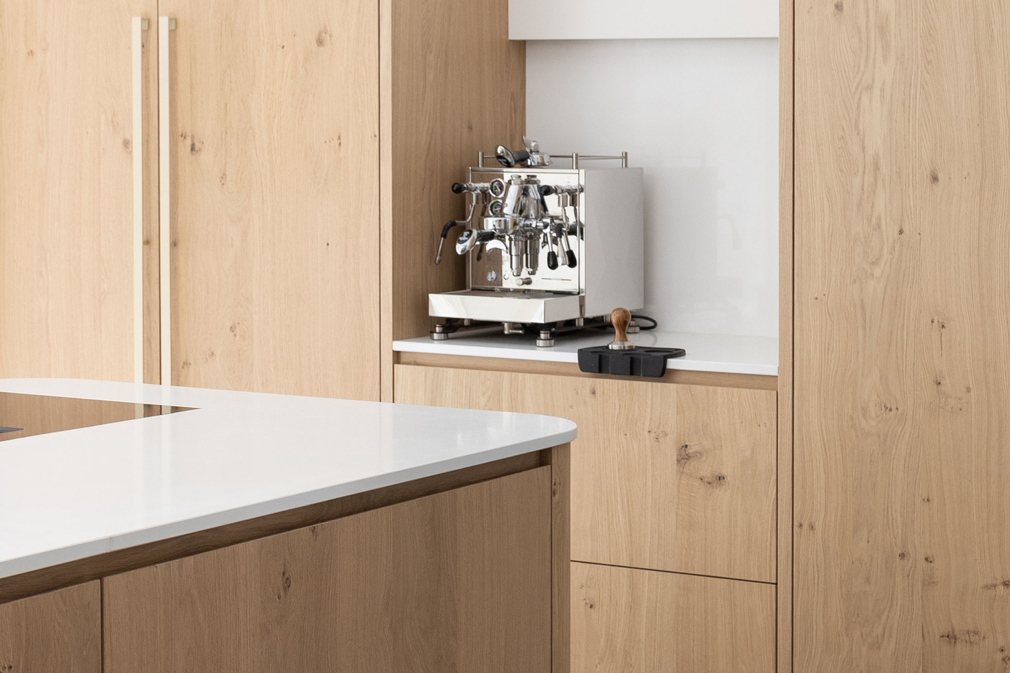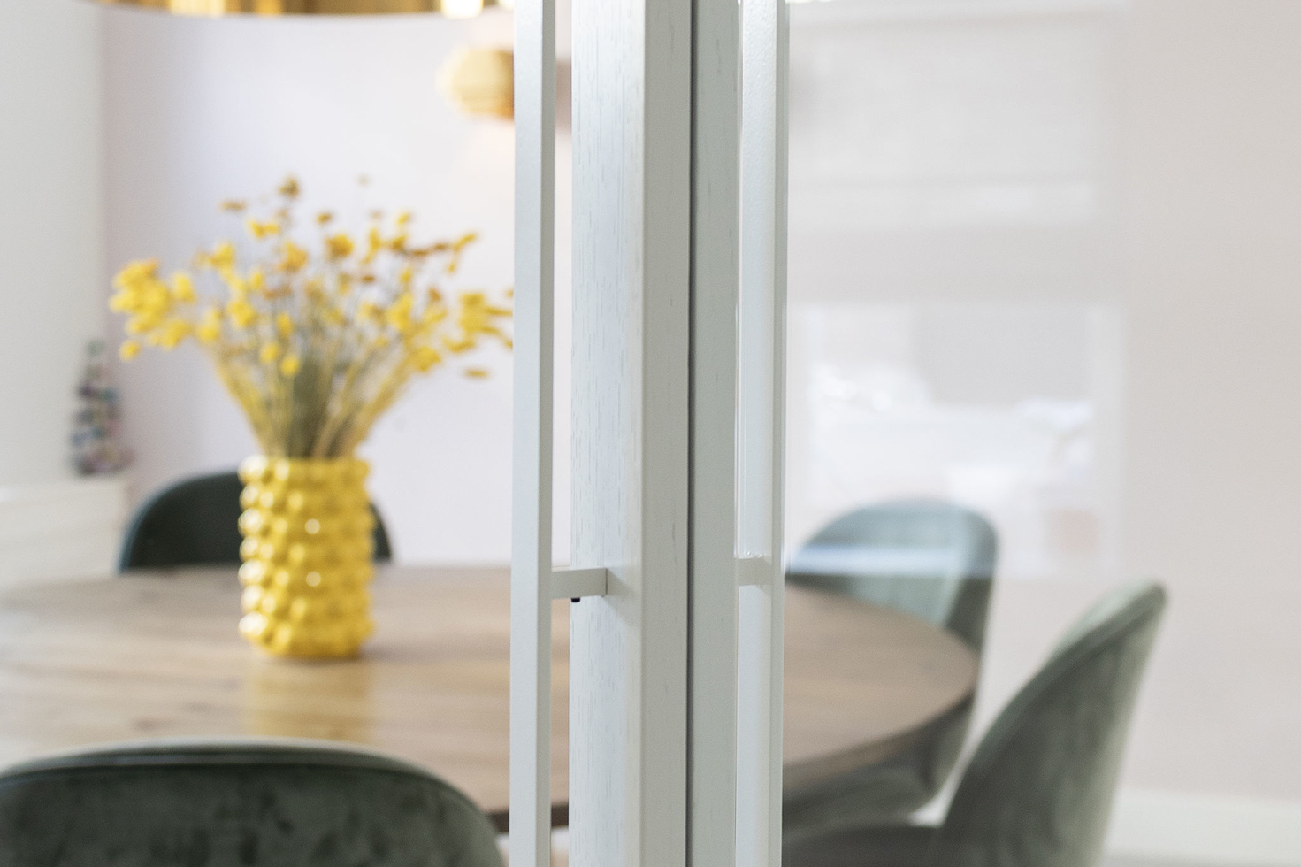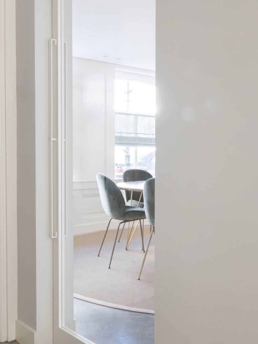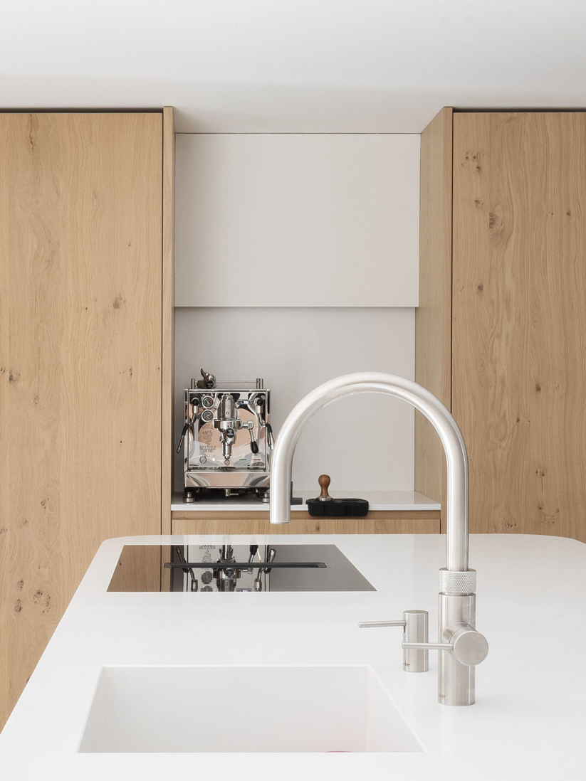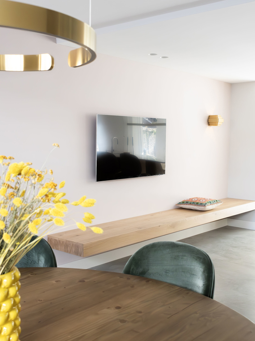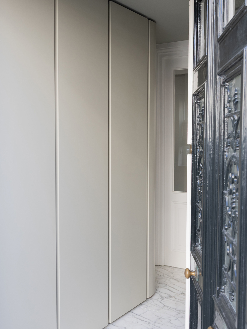 In dit karaktervolle huis hebben we de grandeur van oude details, zoals de marmeren vloer in de hal, gecombineerd met een frisse moderne uitstraling. Een lichte eiken keuken met ronde vormen en een blad in marmerstructuur vormt het hart van de woning. De zachte groentinten van de garderobekasten en een witte taatsdeur die subtiel wegvalt in het geheel maken de transformatie compleet – klassiek en eigentijds in perfecte balans.