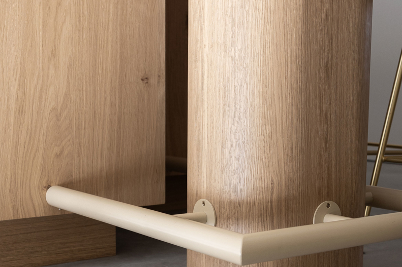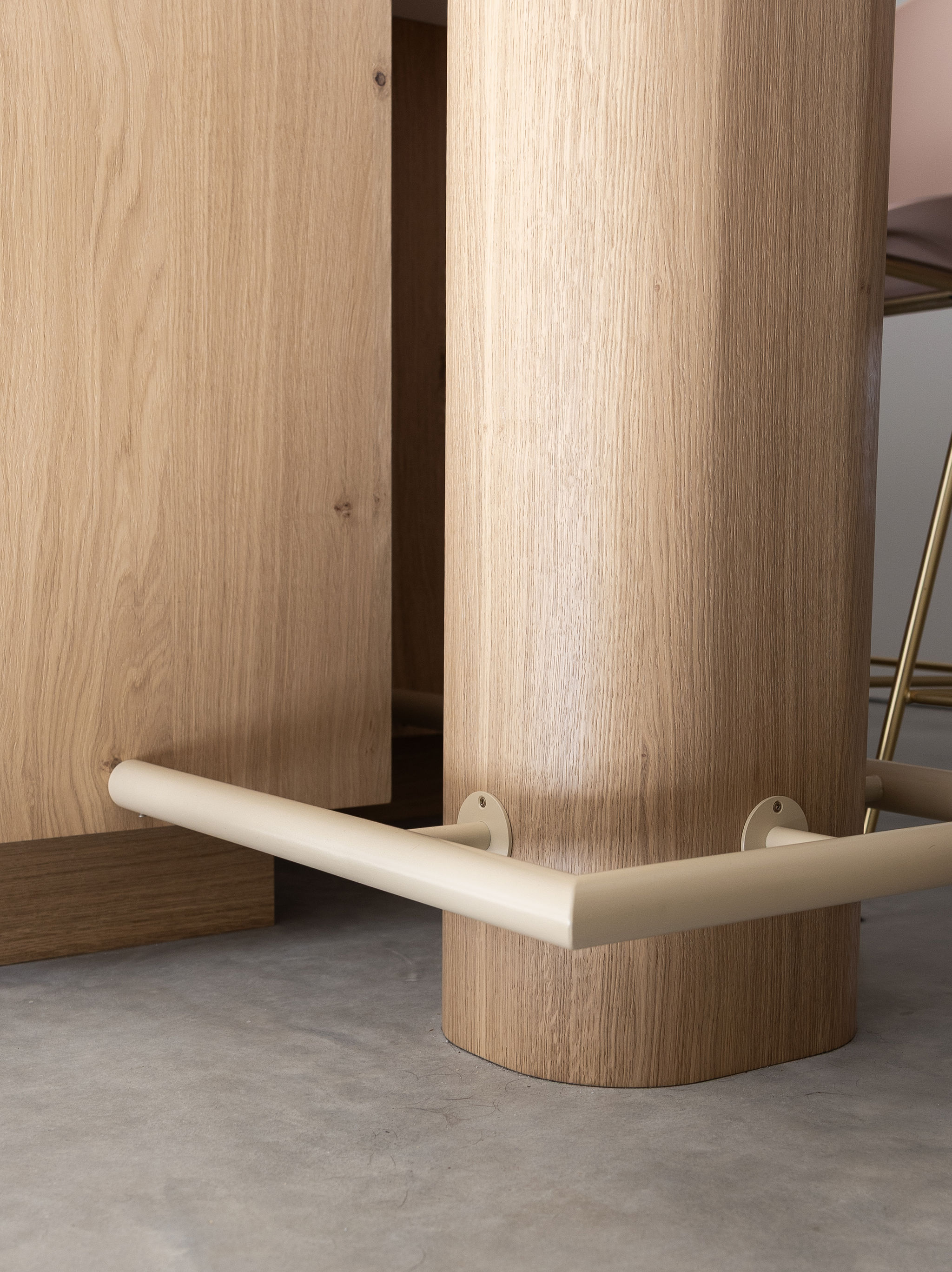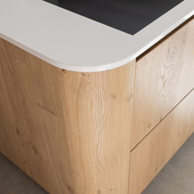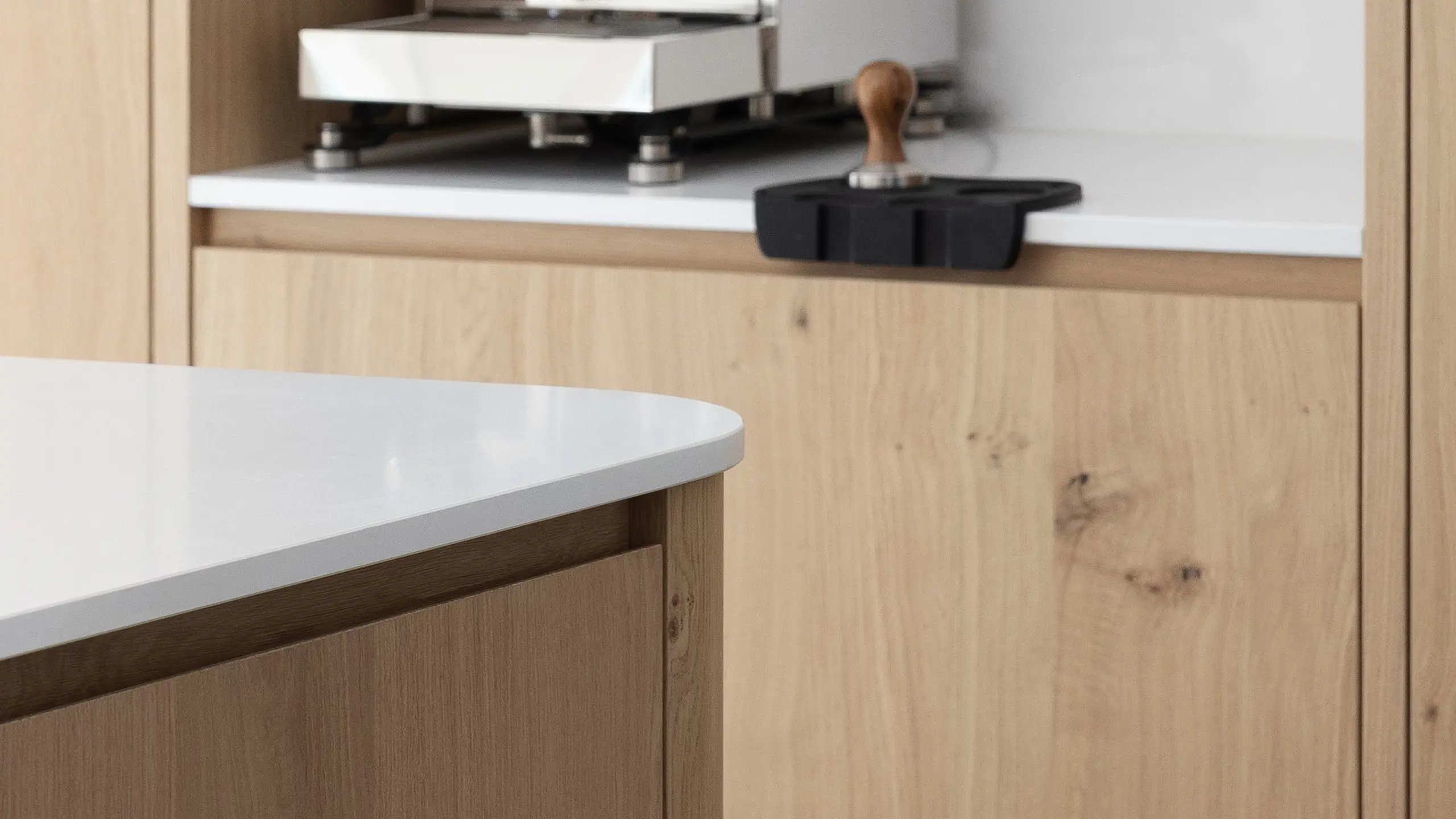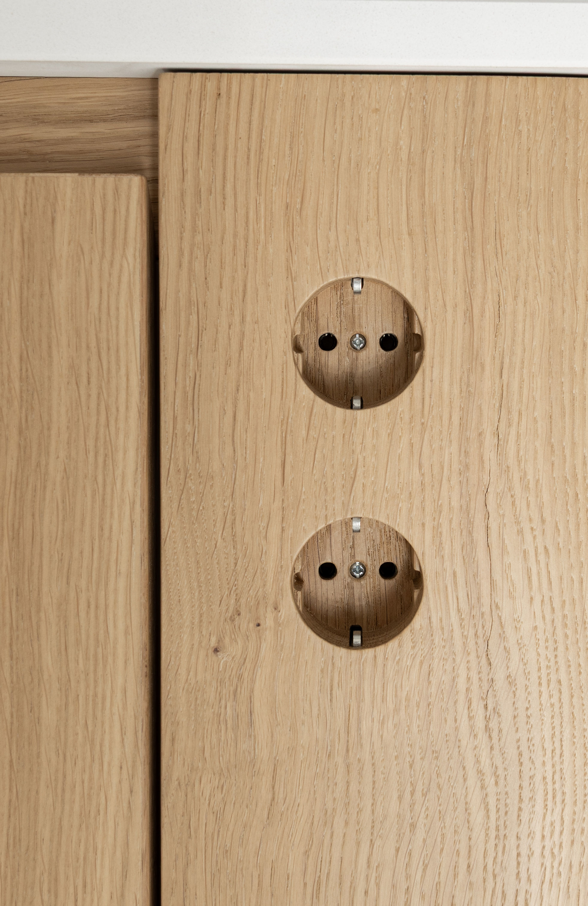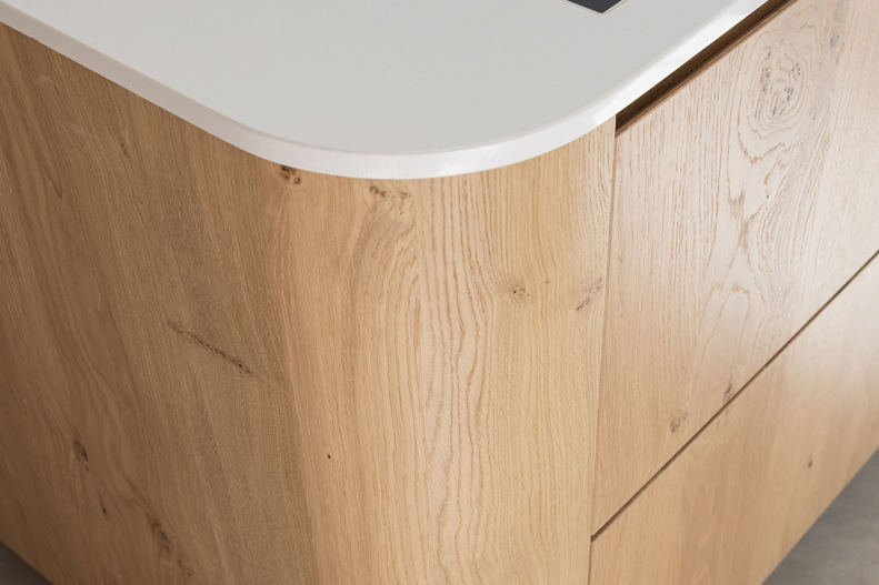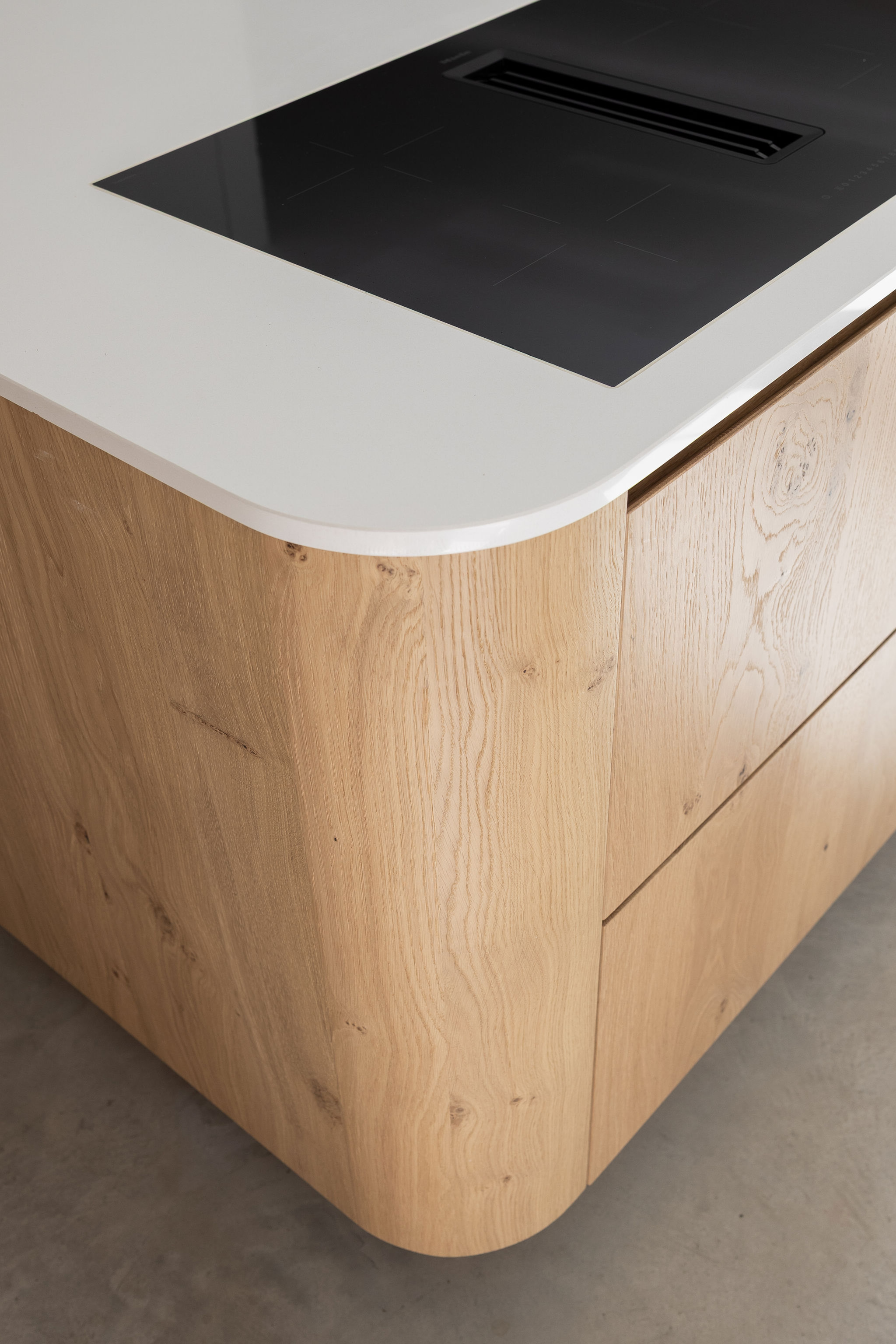 In dit karaktervolle huis hebben we de grandeur van oude details, zoals de marmeren vloer in de hal, gecombineerd met een frisse moderne uitstraling. Een lichte eiken keuken met ronde vormen en een blad in marmerstructuur vormt het hart van de woning. De zachte groentinten van de garderobekasten en een witte taatsdeur die subtiel wegvalt in het geheel maken de transformatie compleet – klassiek en eigentijds in perfecte balans.