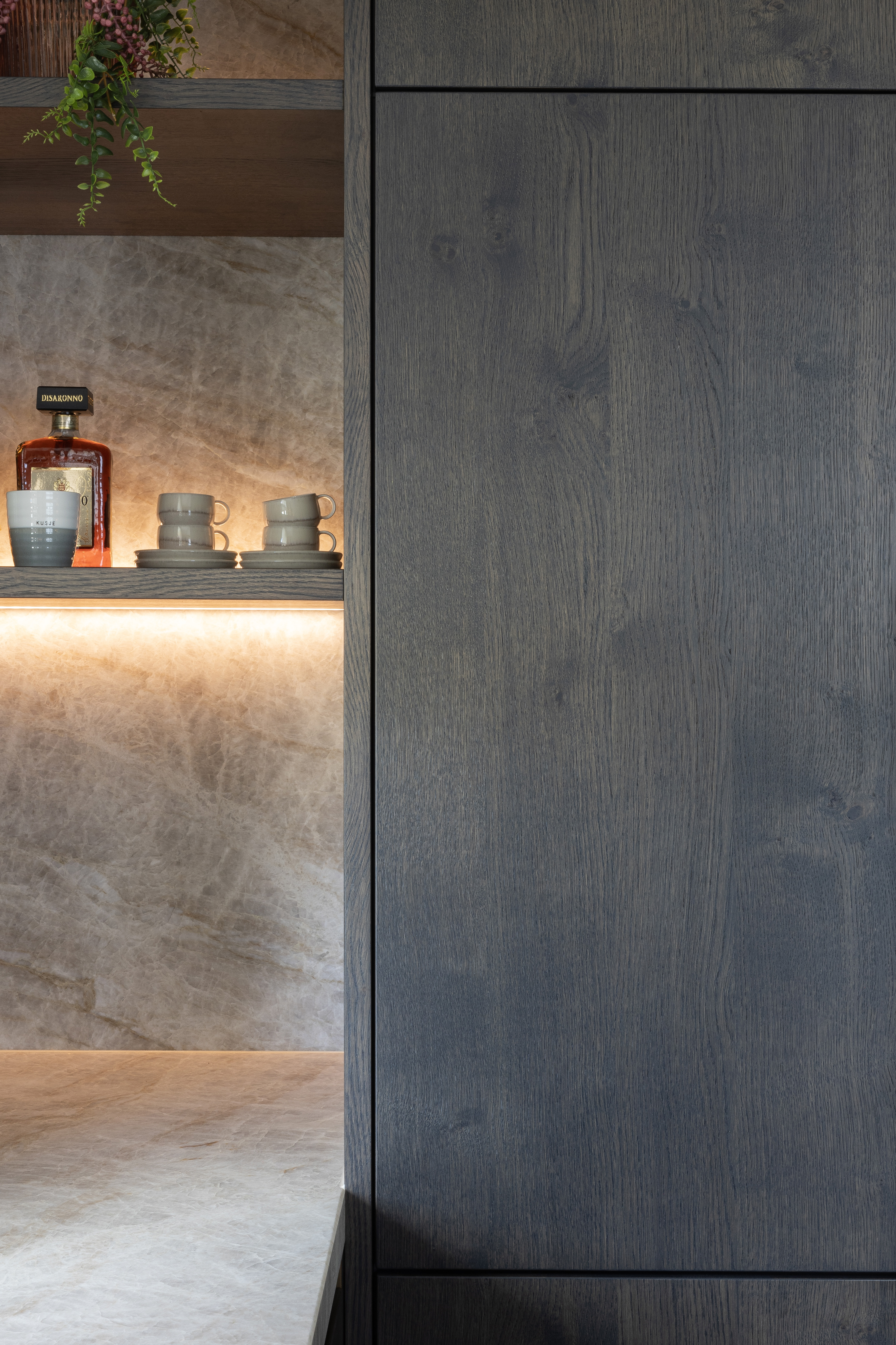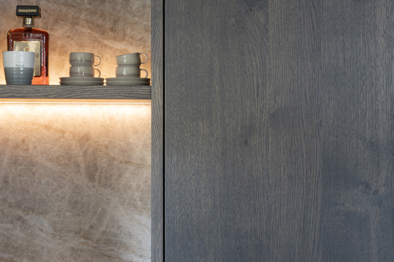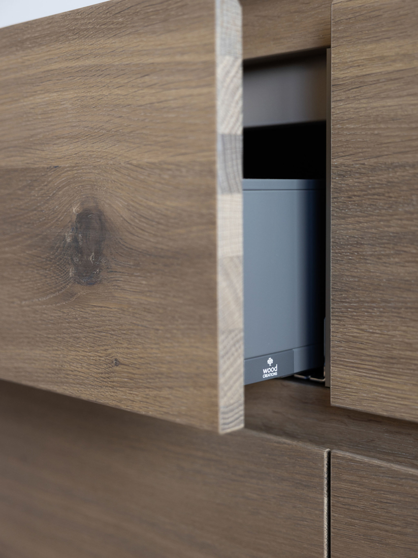 Voor de zichtbare delen van onze houten kasten en keukens werken we vaak met dik geplankt fineer, met zorg geselecteerd bij onze vaste houtleverancier. Dit fineer is sterk, werkingsvrij, en door de dikte geschikt voor een prachtige, diepe structuur wanneer we het borstelen. Het resultaat? Fronten met karakter en geschikt voor vele jaren intensief gebruik.